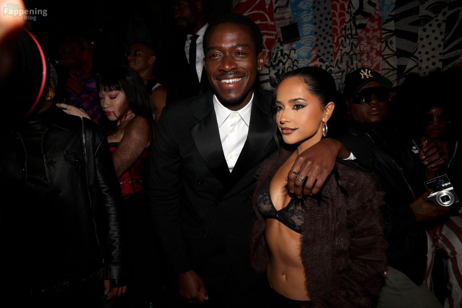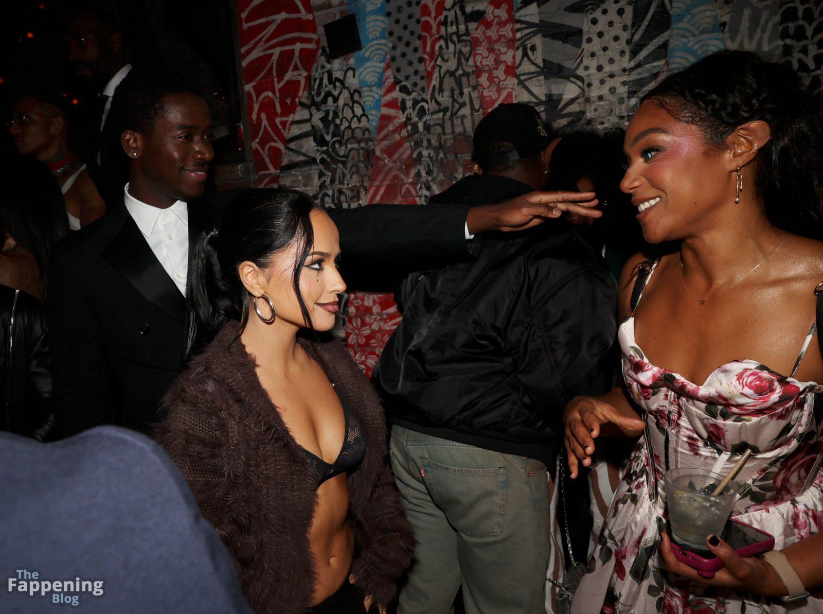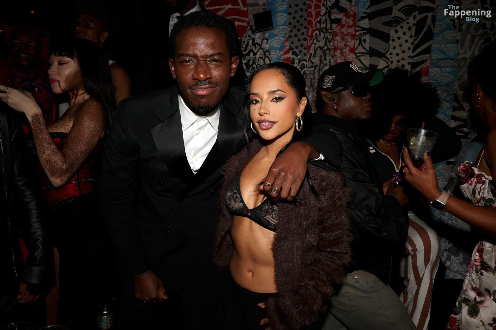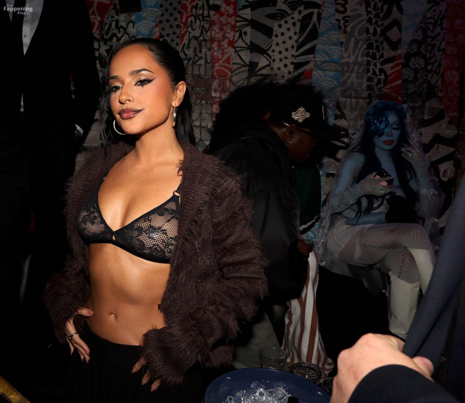Becky G foi fotografada no Costume Couture de NYC usando um sutiã transparente e um cardigã felpudo, exibindo seus seios e abdômen tonificado.