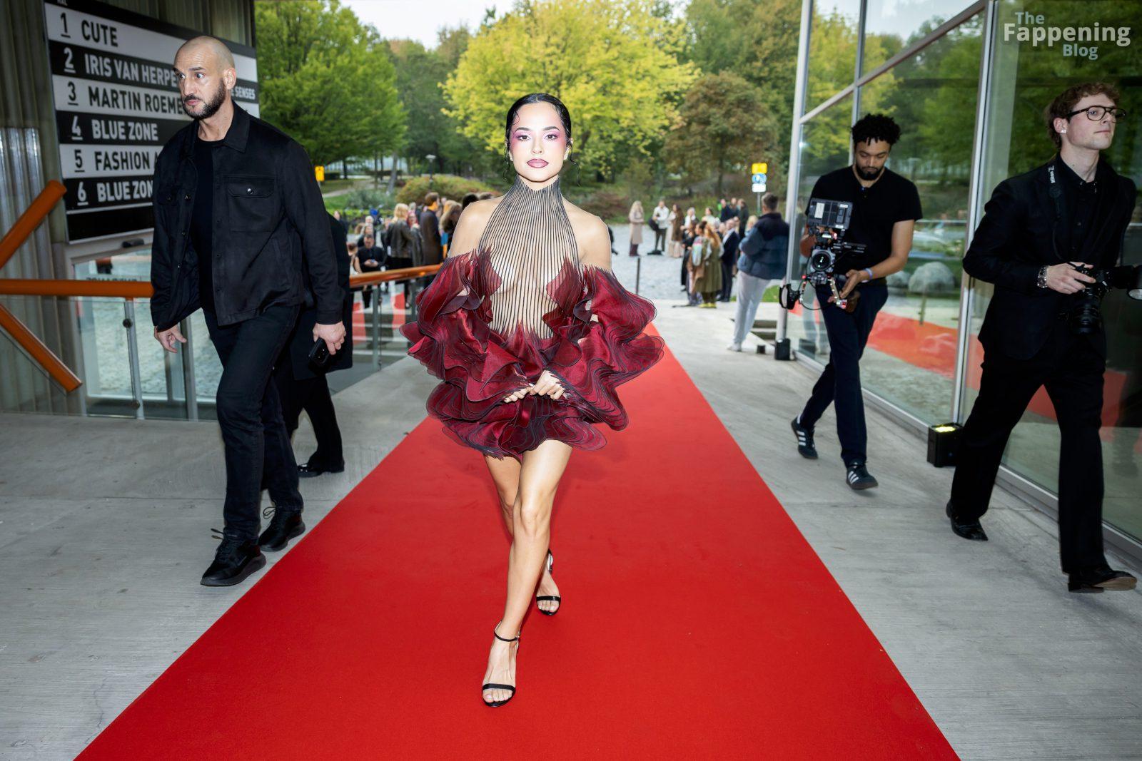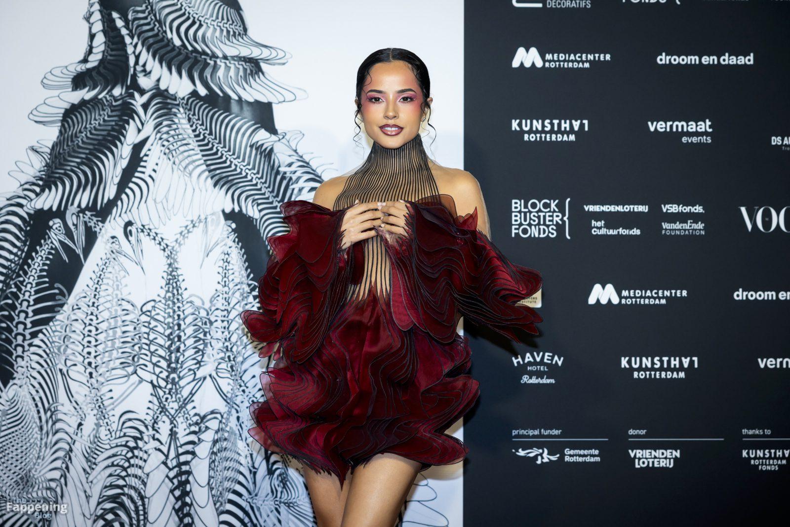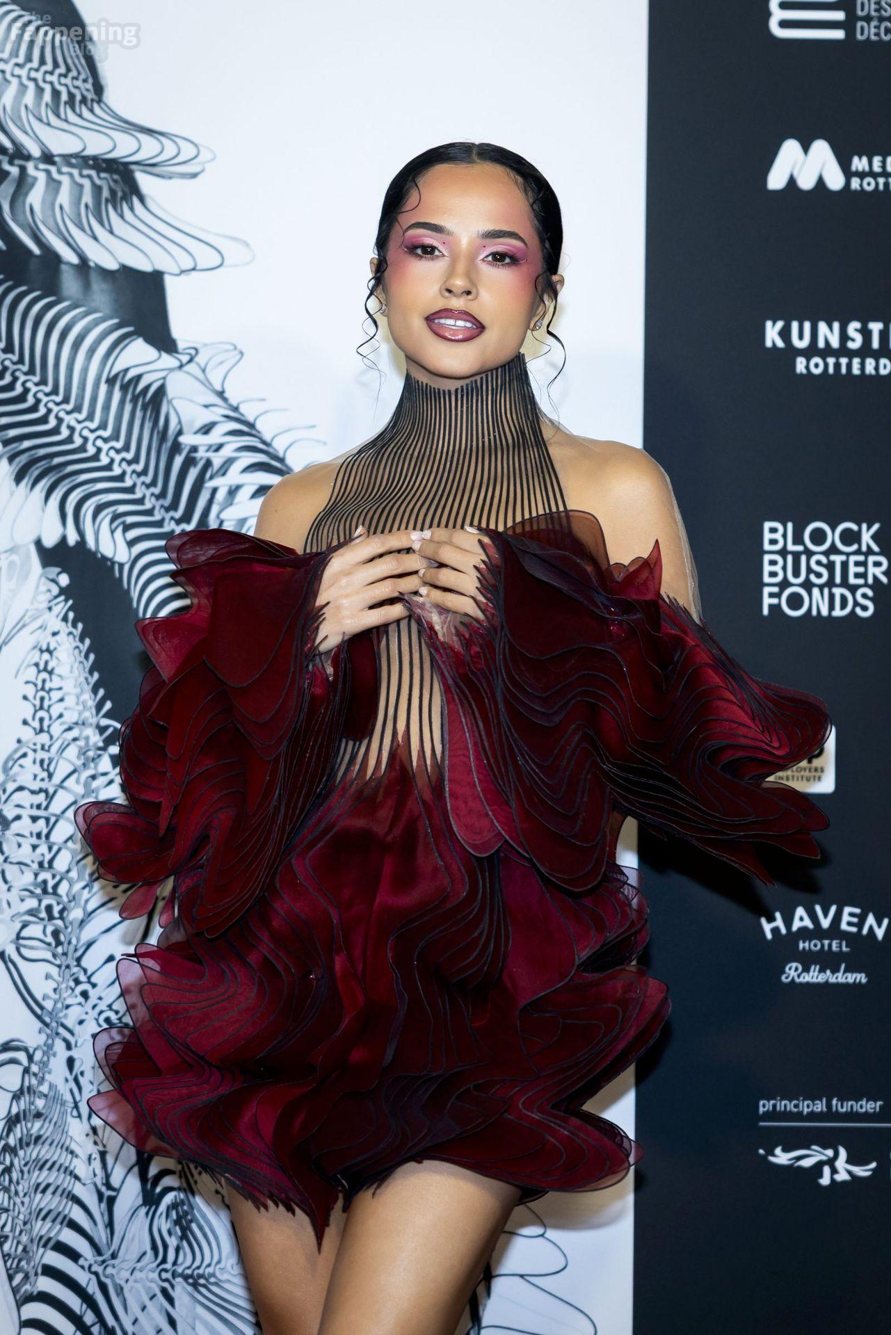 Becky G mostrou tudo em Rotterdam, usando um vestido de ilusão transparente que exibiu seus seios sexy e pernas tonificadas na exposição Iris van Herpen.
