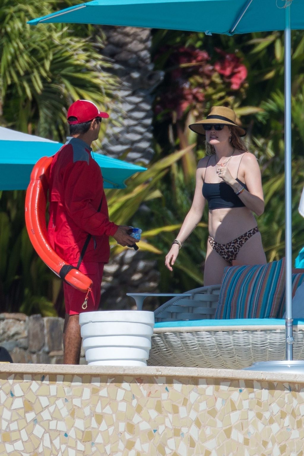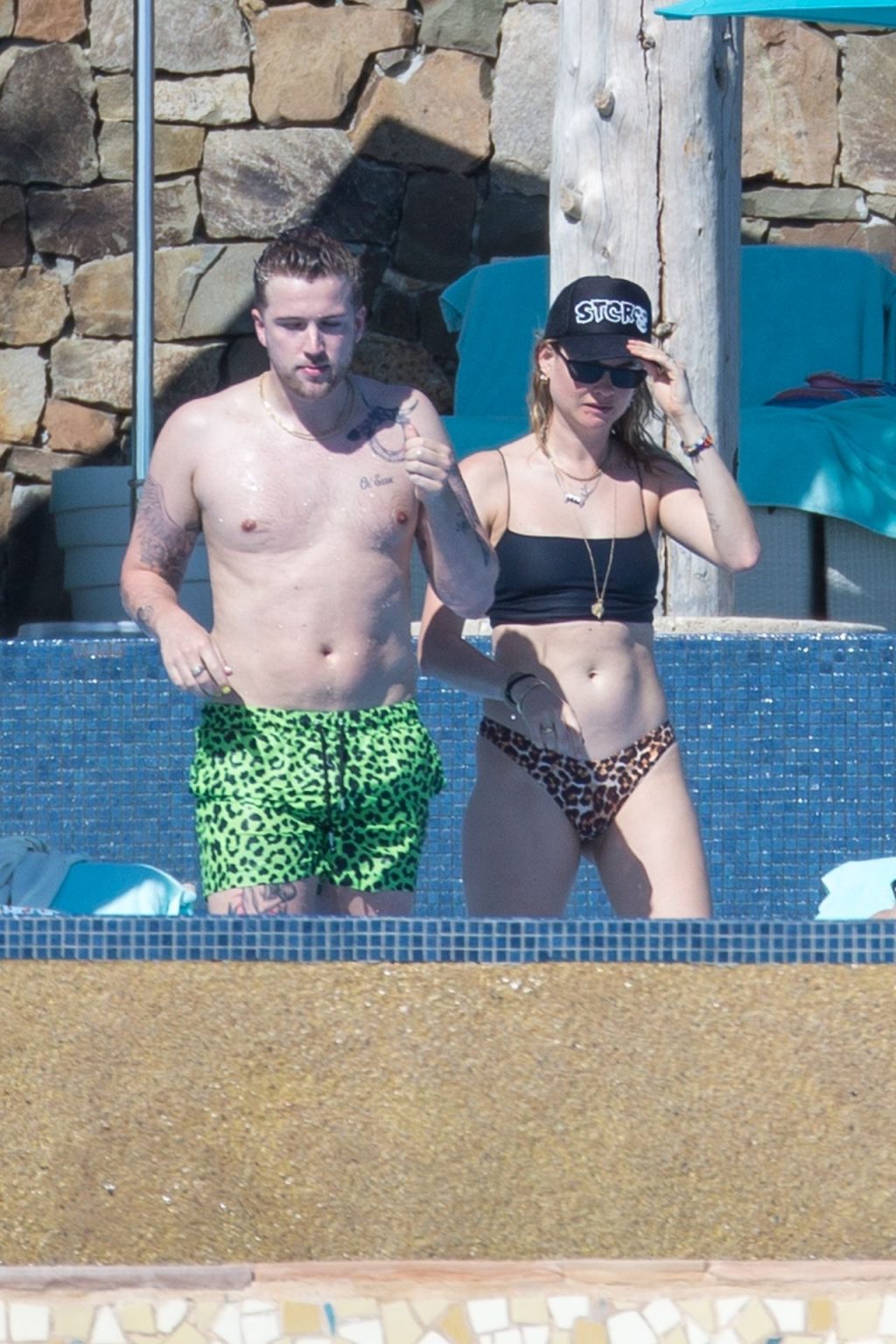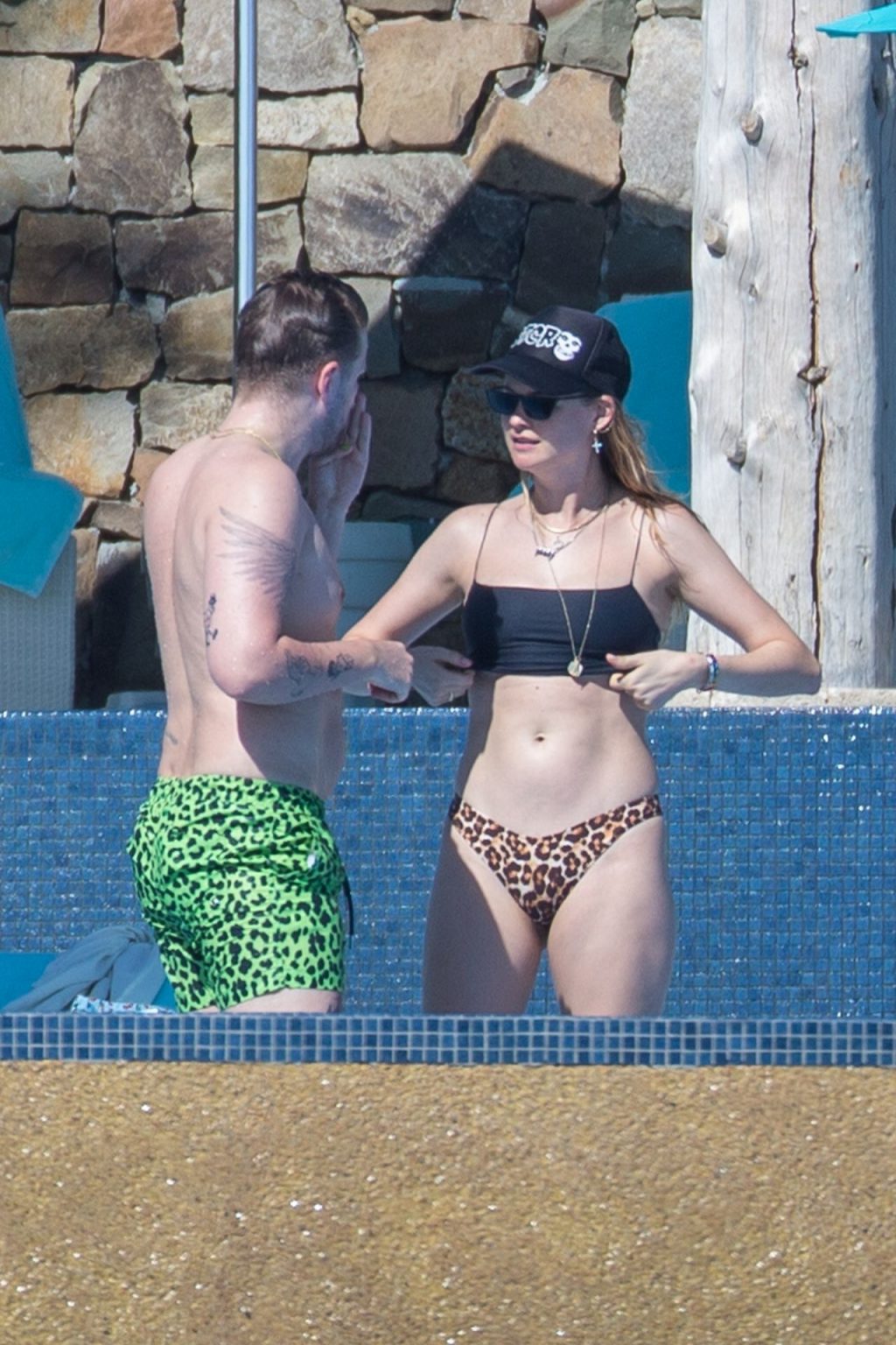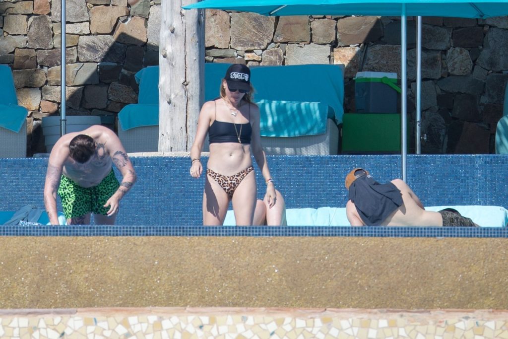 Behati Prinsloo aproveita o sol com amigos em Cabo, 01/12/2020. A modelo da Victoria’s Secret exibiu sua figura esguia com um top de biquíni preto e fio dental de estampa de leopardo enquanto relaxava em seu resort com amigos, tomando bebidas geladas e dando um mergulho na piscina.