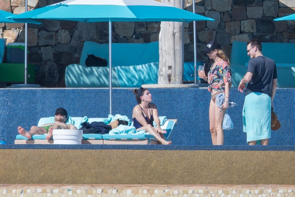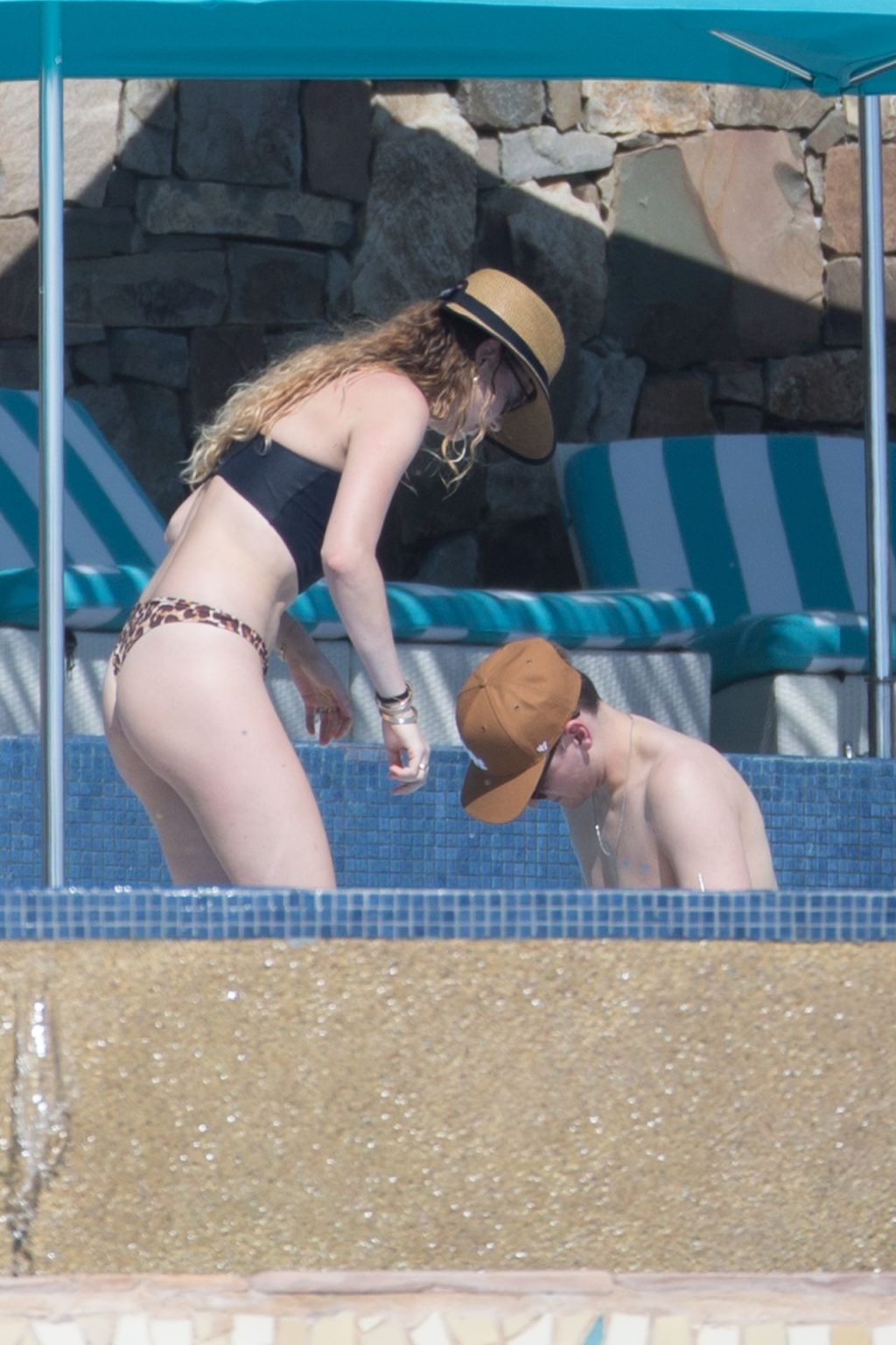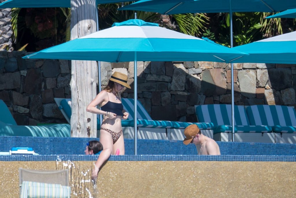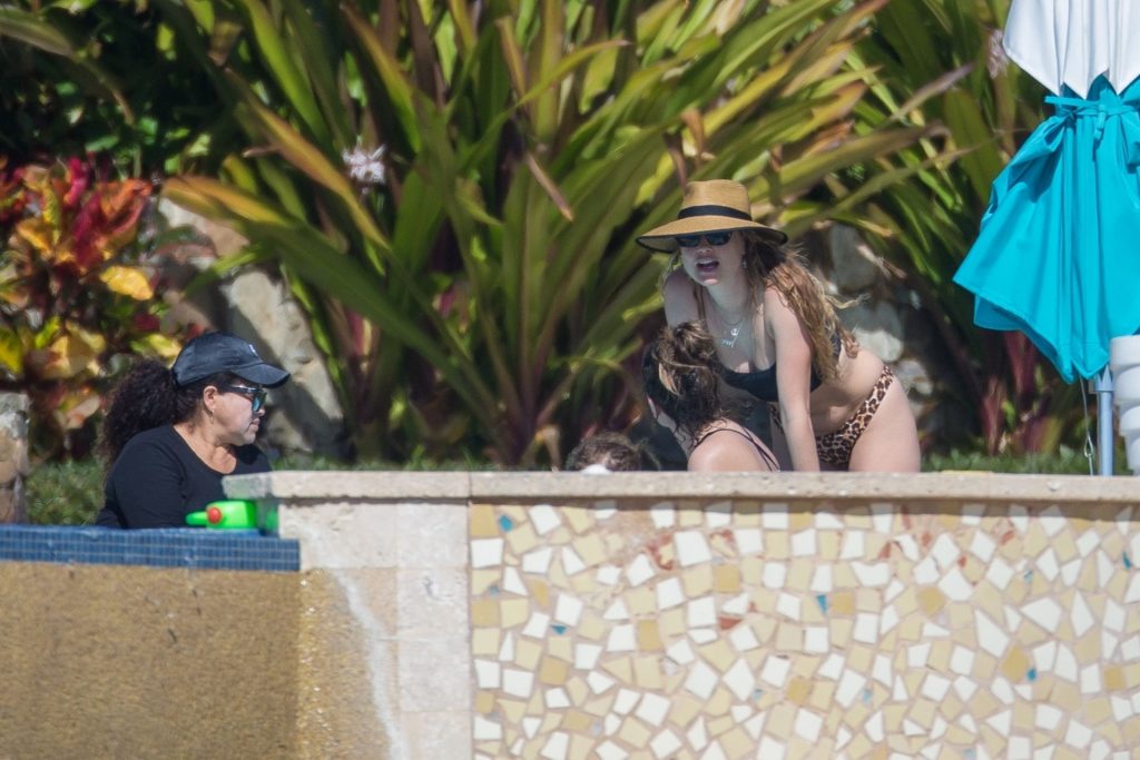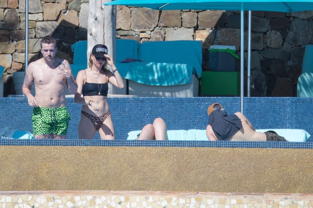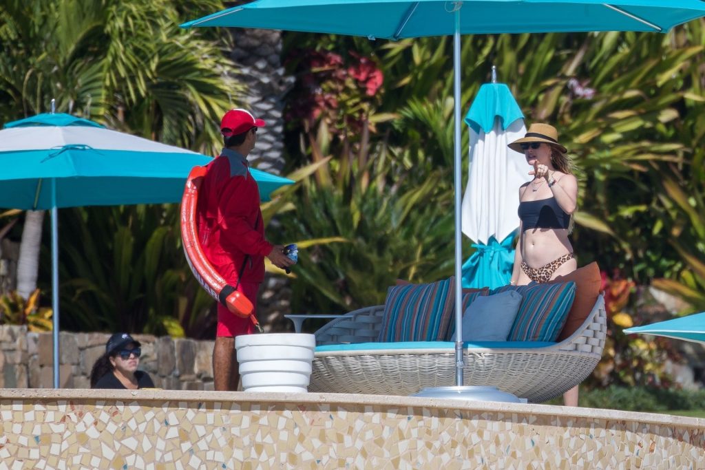 Behati Prinsloo aproveita o sol com amigos em Cabo, 01/12/2020. A modelo da Victoria’s Secret exibiu sua figura esguia com um top de biquíni preto e fio dental de estampa de leopardo enquanto relaxava em seu resort com amigos, tomando bebidas geladas e dando um mergulho na piscina.
