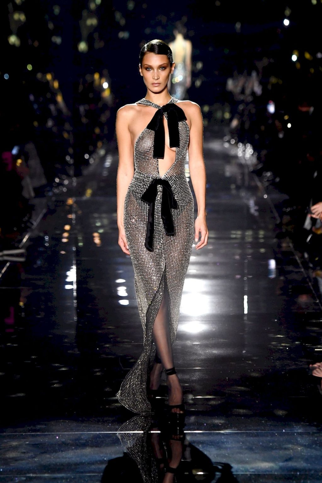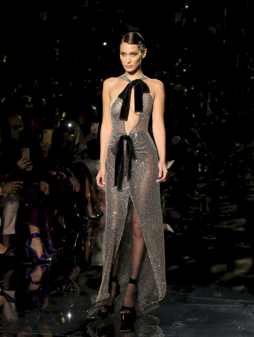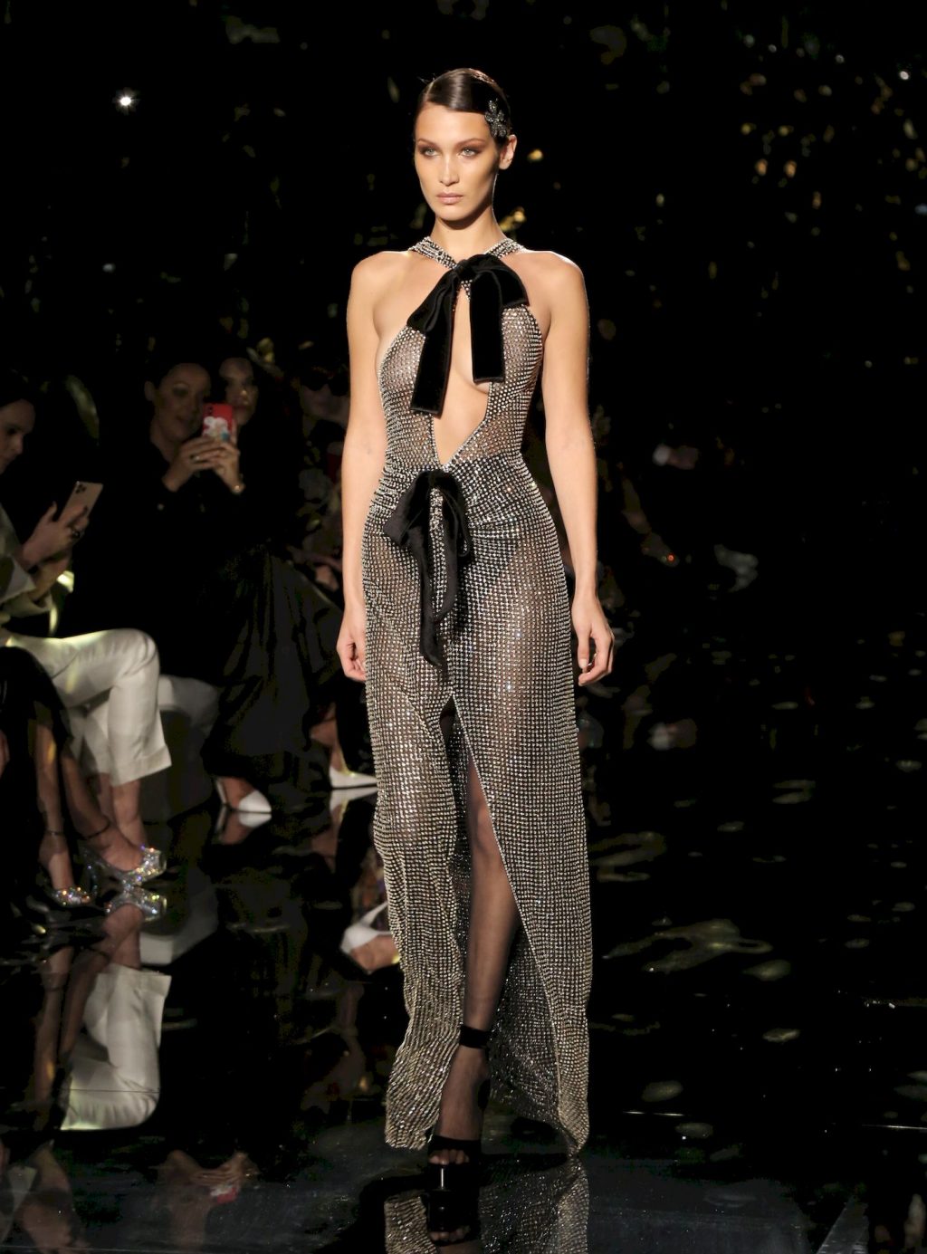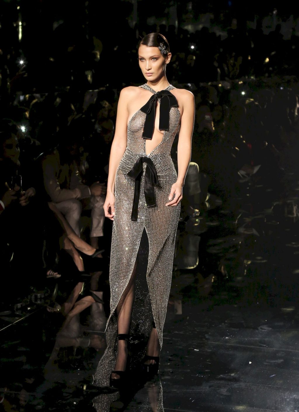 Model Bella Hadid desfila com um vestido transparente, exibindo seus seios nus para todos os convidados do desfile de moda em Hollywood, 02/07/2020.