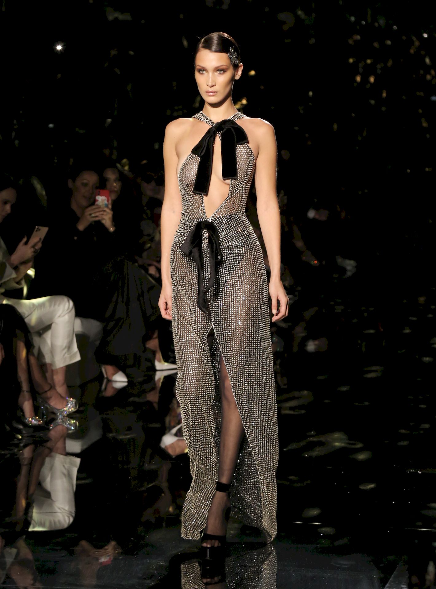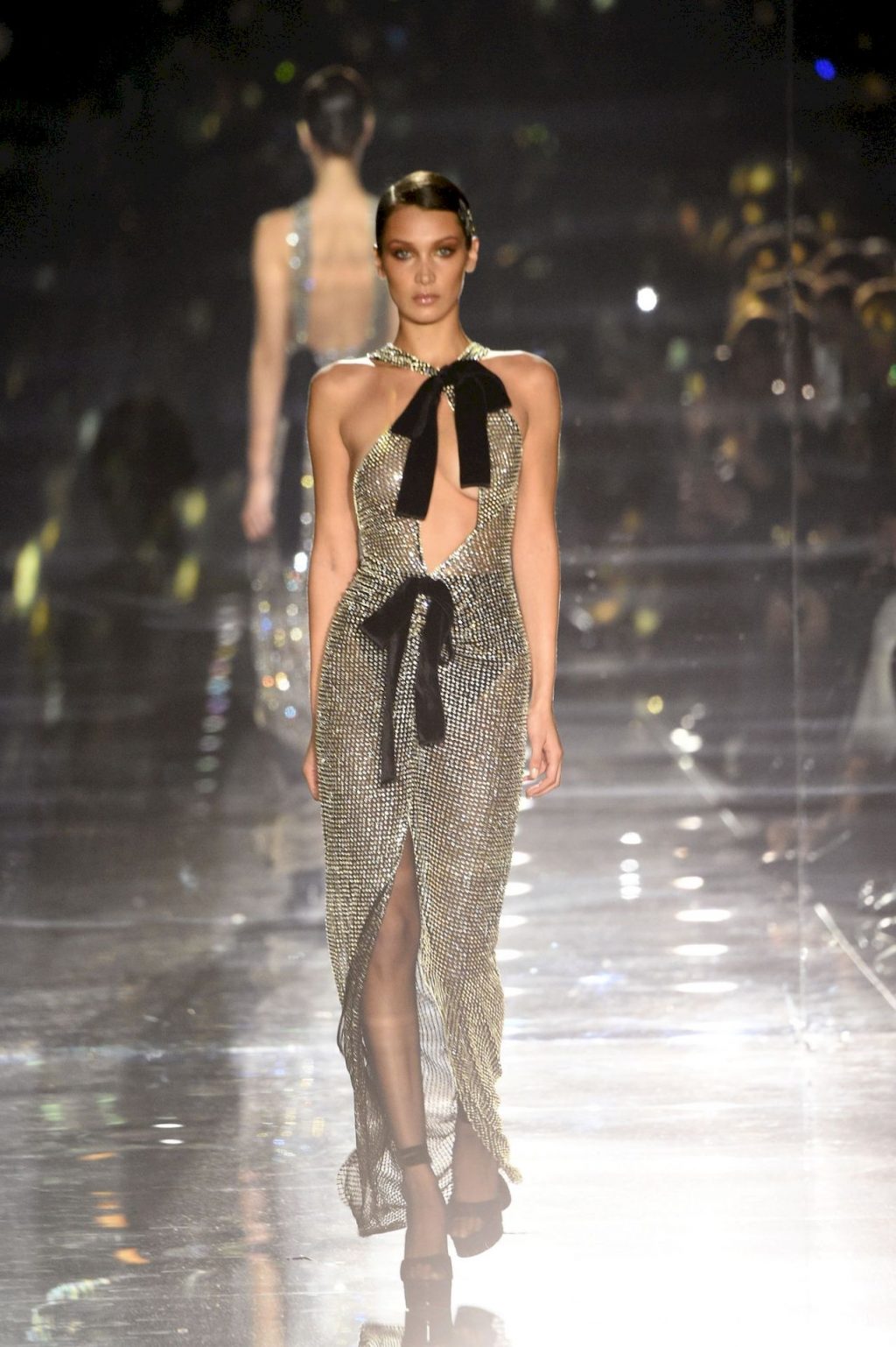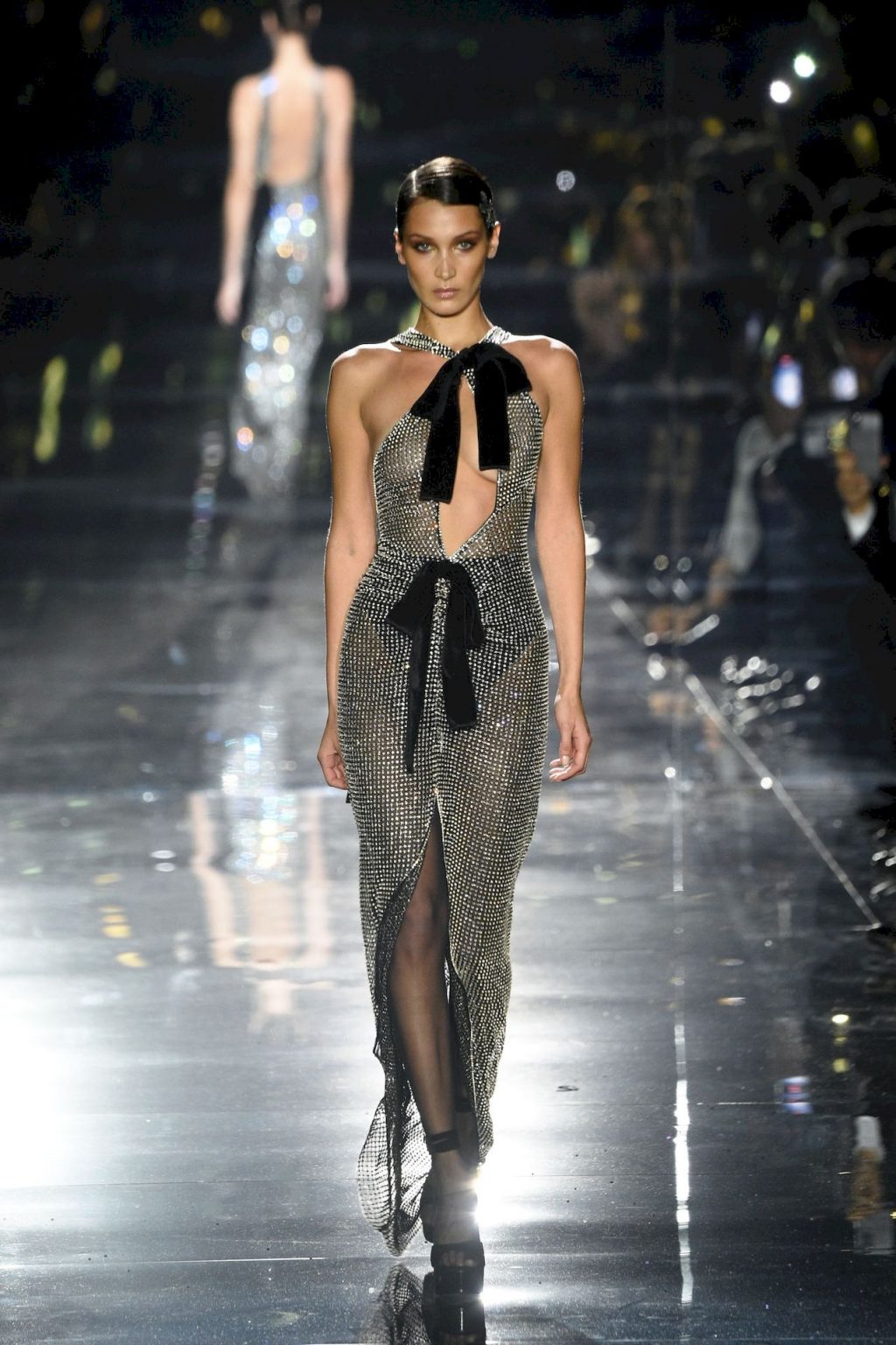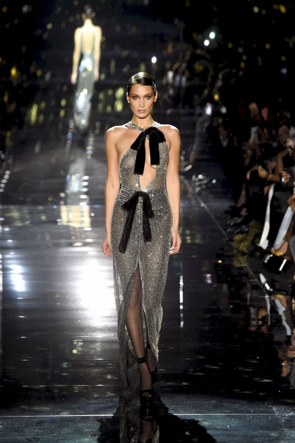 Model Bella Hadid desfila com um vestido transparente, exibindo seus seios nus para todos os convidados do desfile de moda em Hollywood, 02/07/2020.