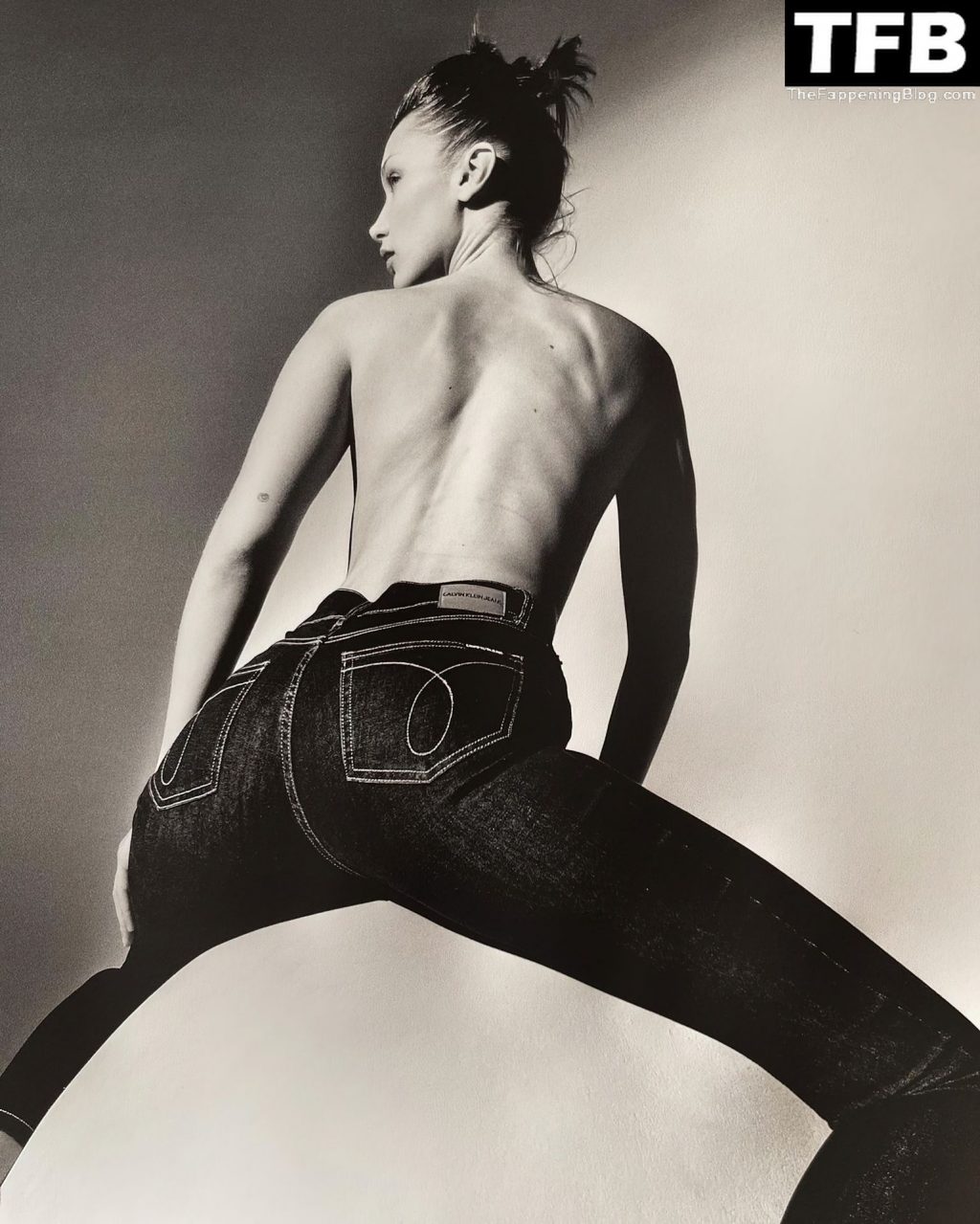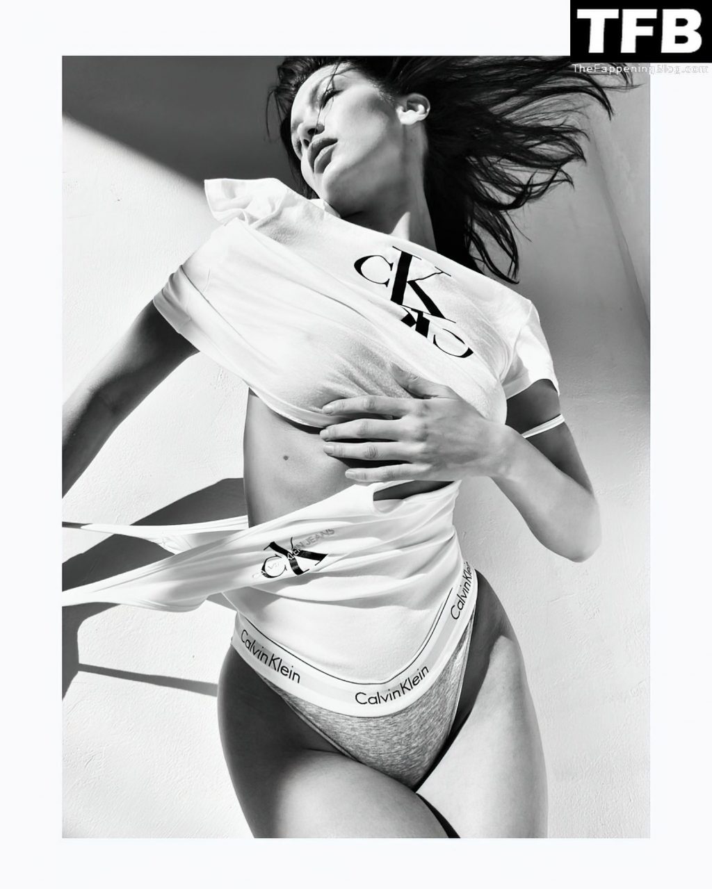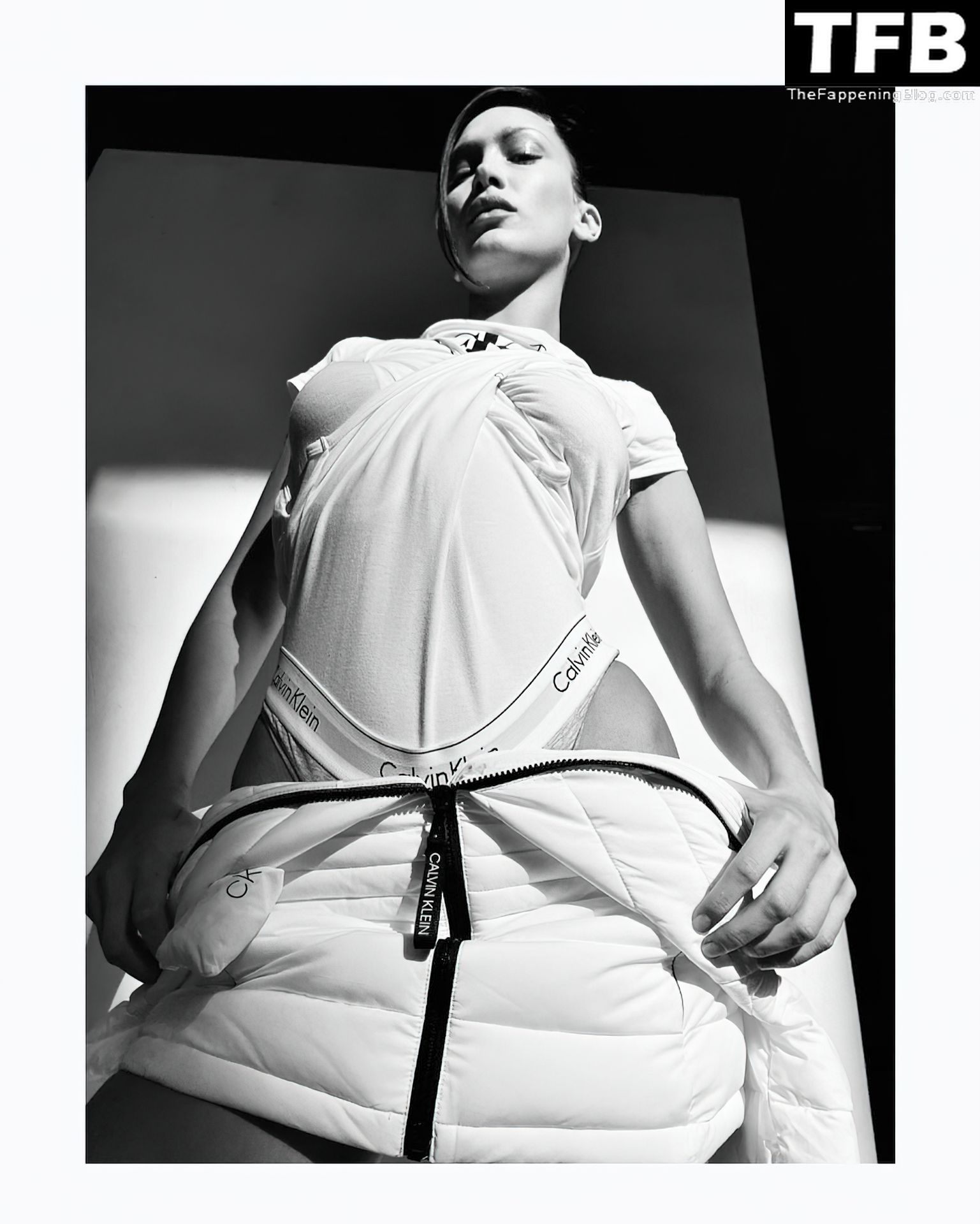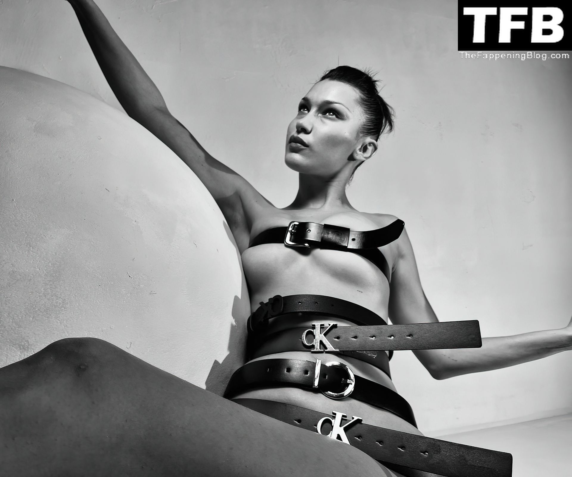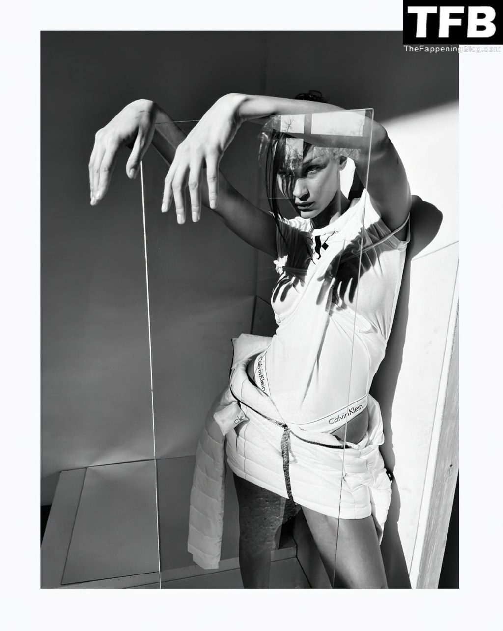 A estrela de reality show e modelo Bella Hadid mostra seu corpo quase nu e nos provoca com seus seios sexy posando em um ensaio fotográfico de Katie Burnett para Calvin Klein (2021).