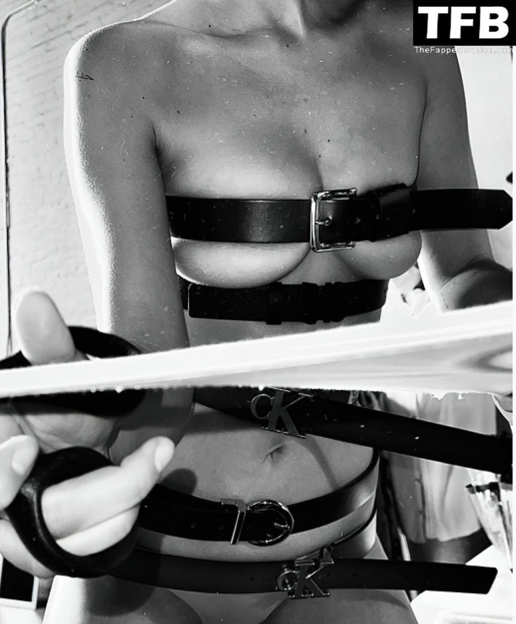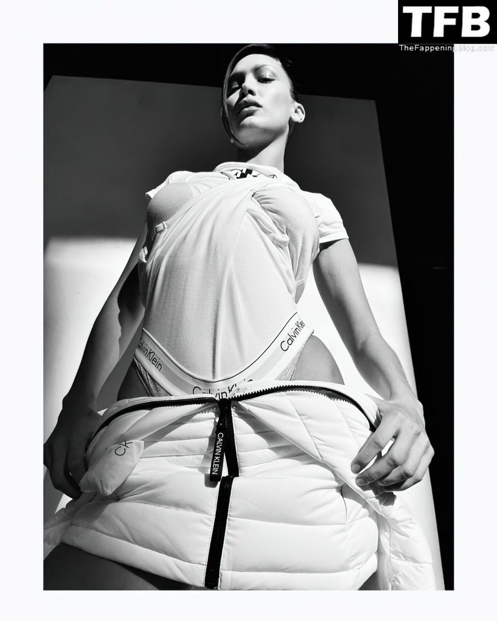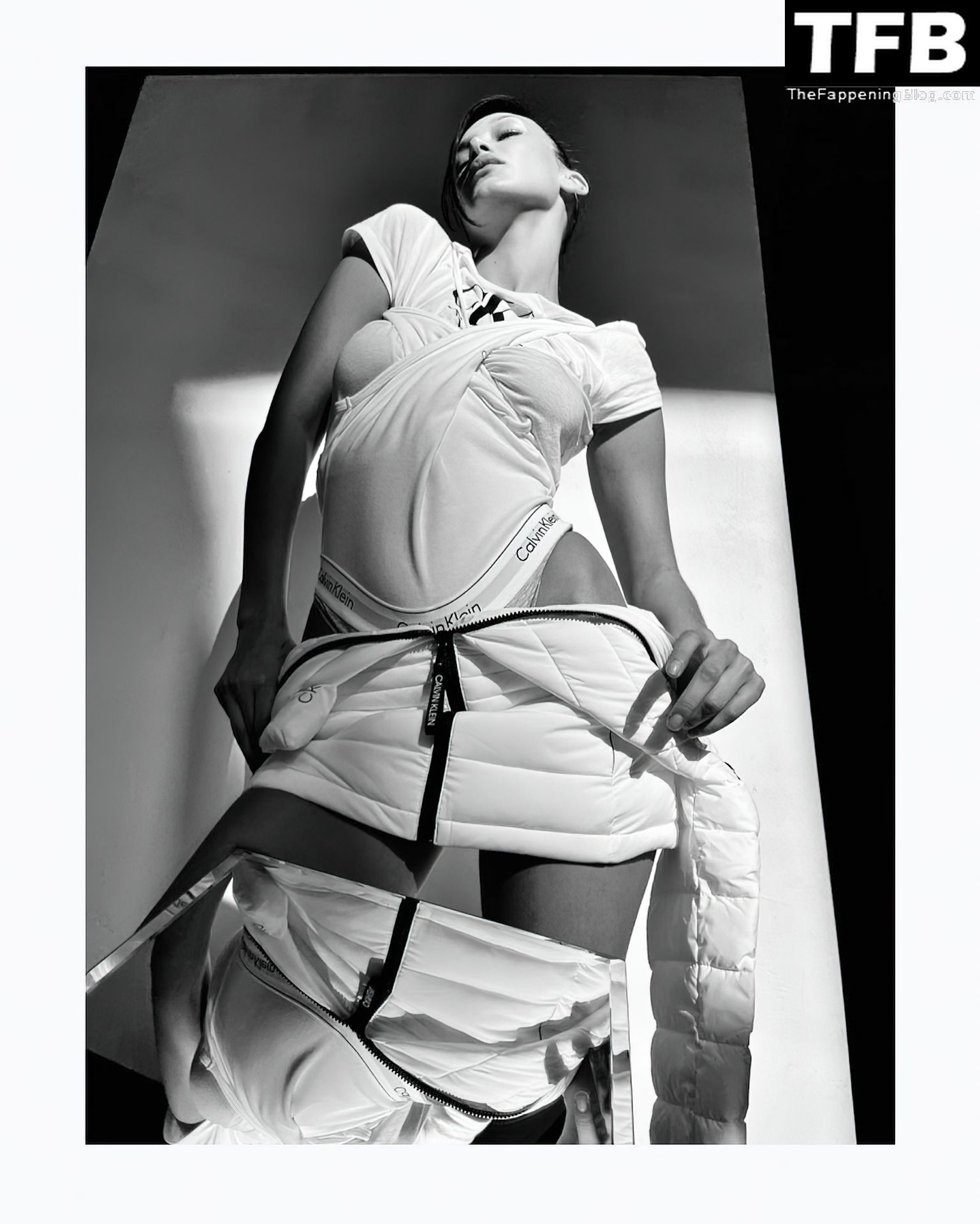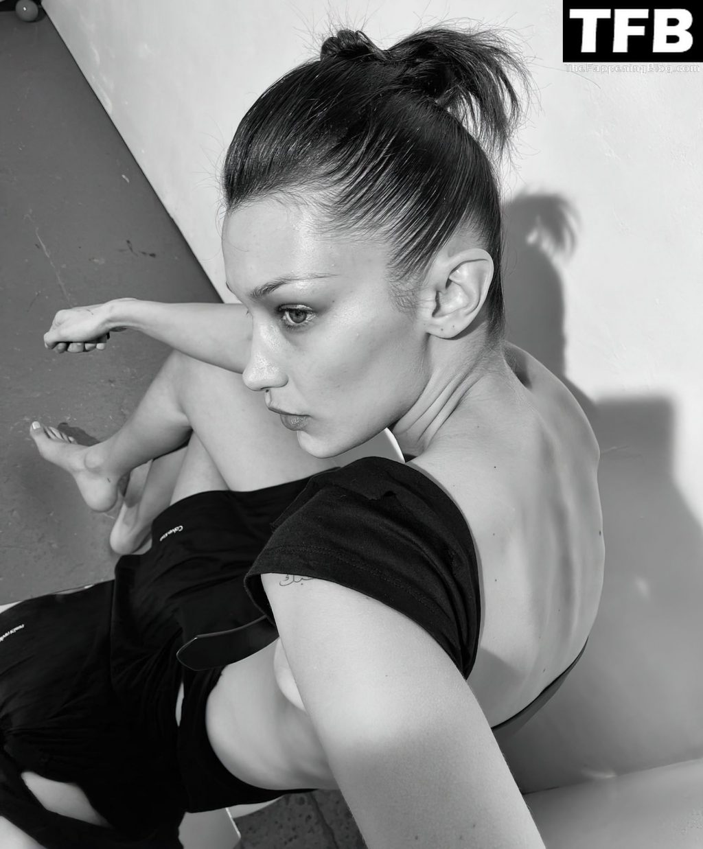 A estrela de reality show e modelo Bella Hadid mostra seu corpo quase nu e nos provoca com seus seios sexy posando em um ensaio fotográfico de Katie Burnett para Calvin Klein (2021).