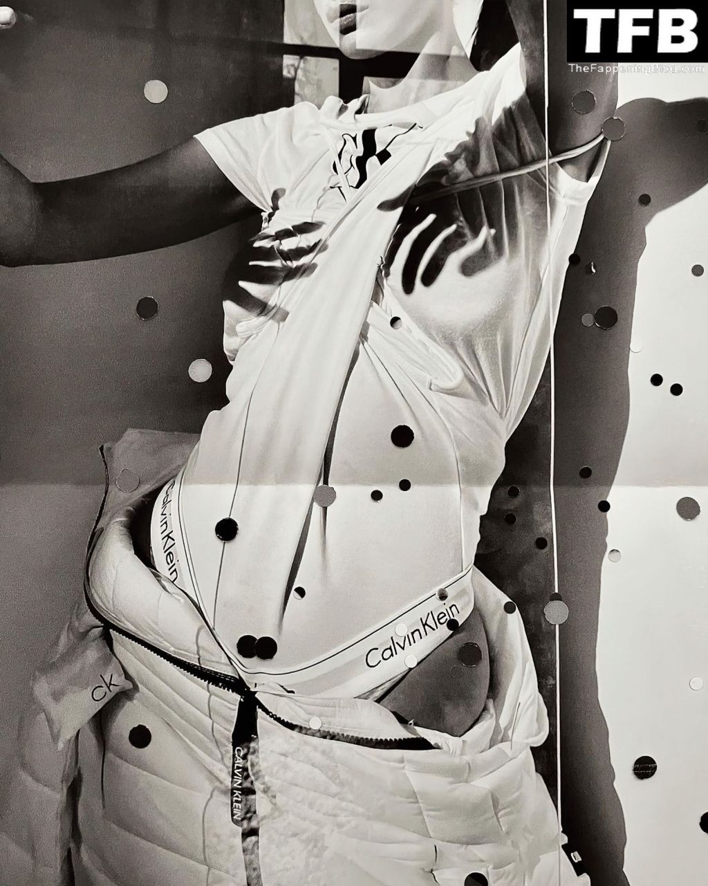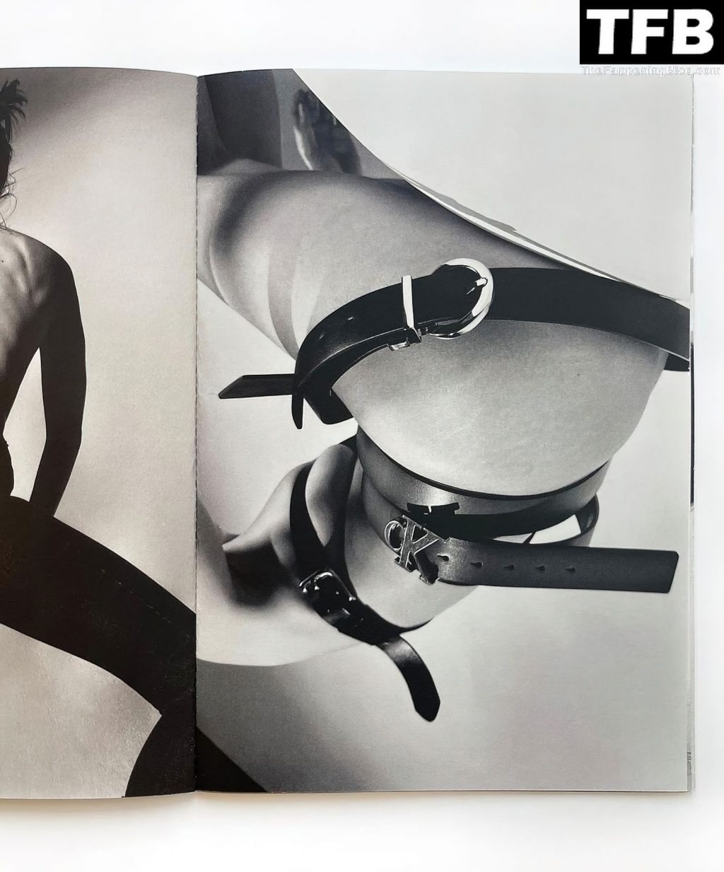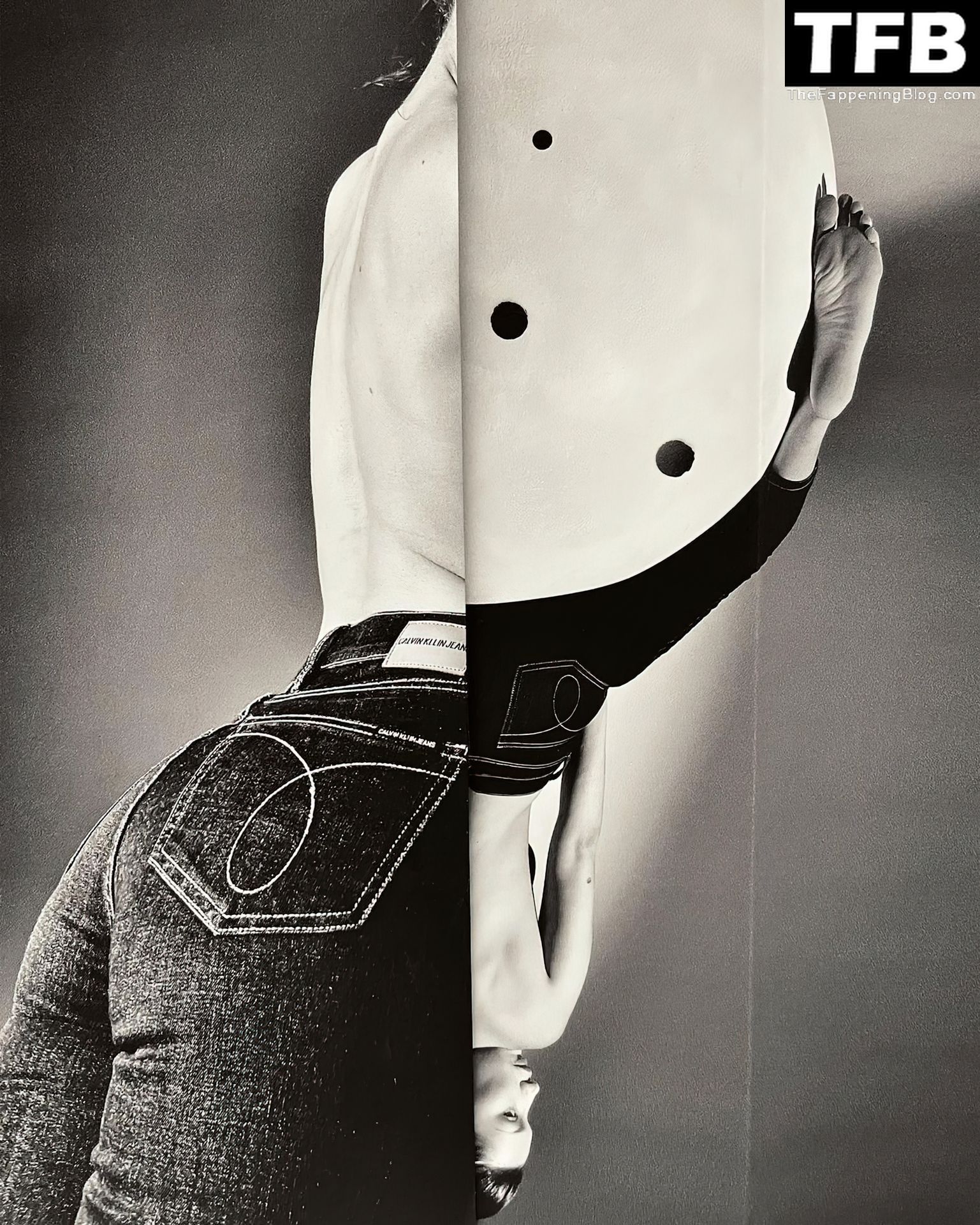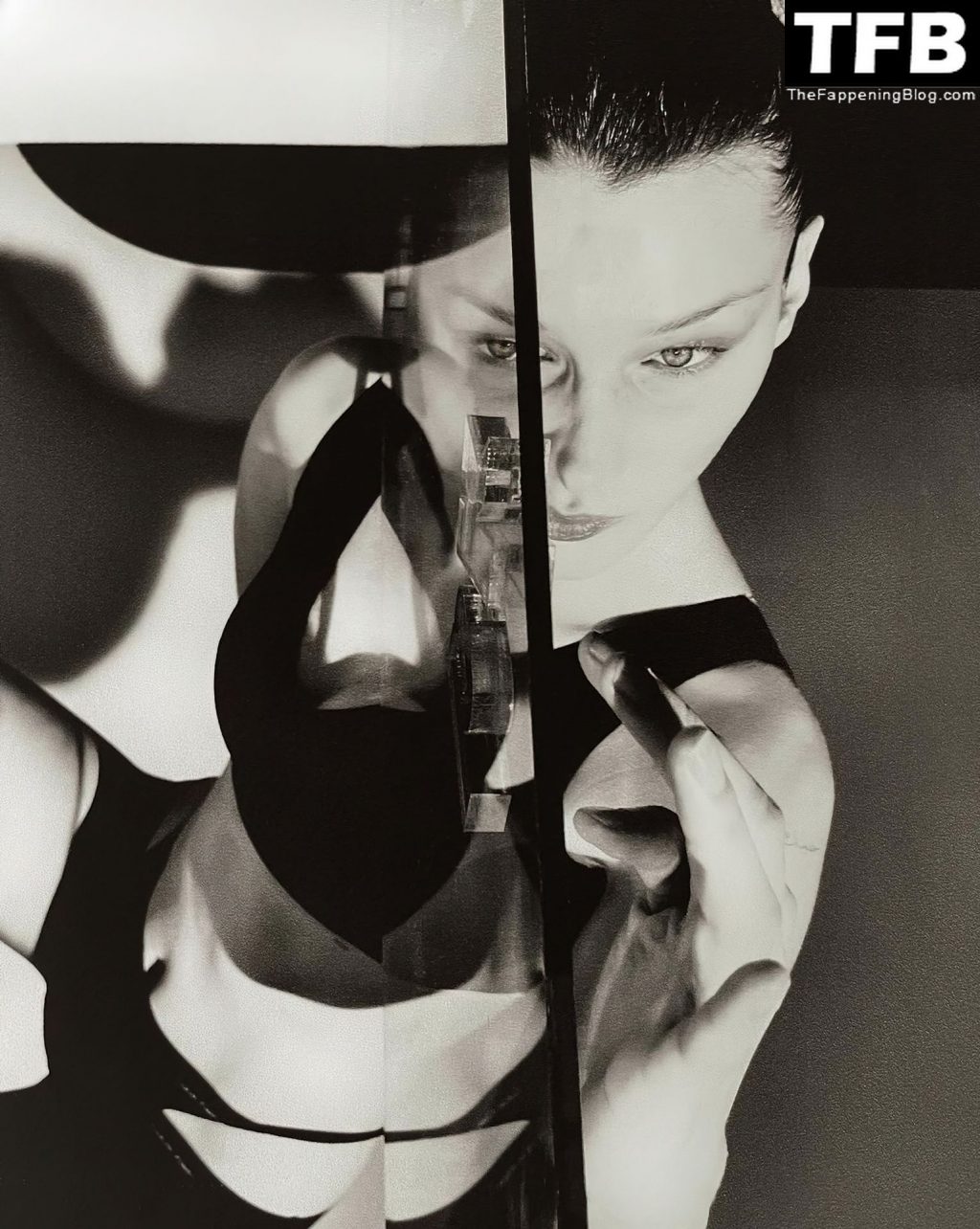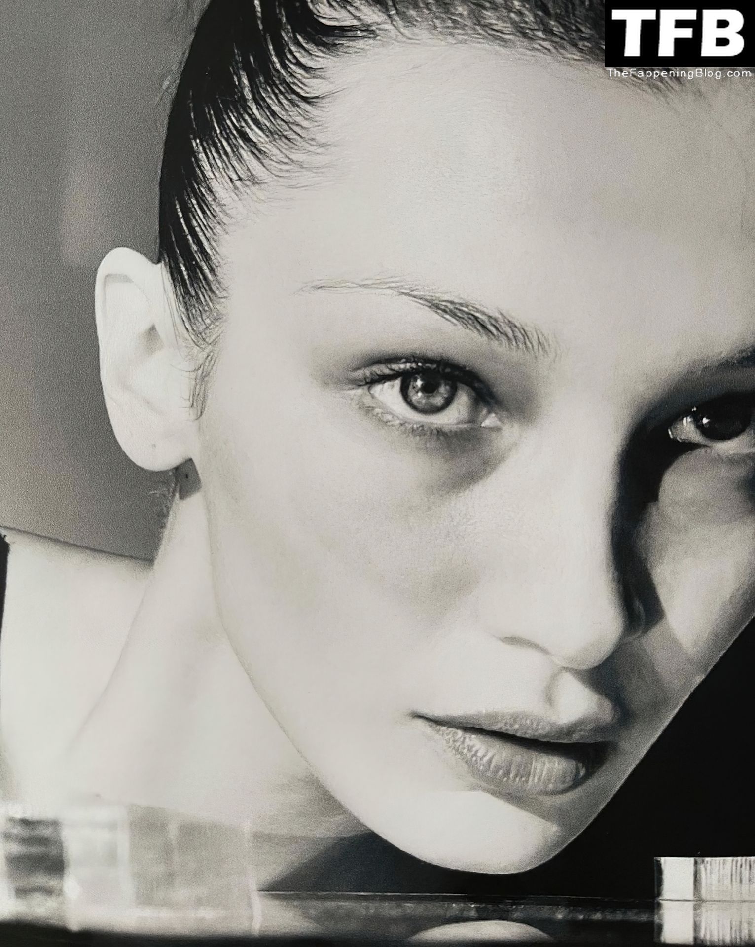 A estrela de reality show e modelo Bella Hadid mostra seu corpo quase nu e nos provoca com seus seios sexy posando em um ensaio fotográfico de Katie Burnett para Calvin Klein (2021).