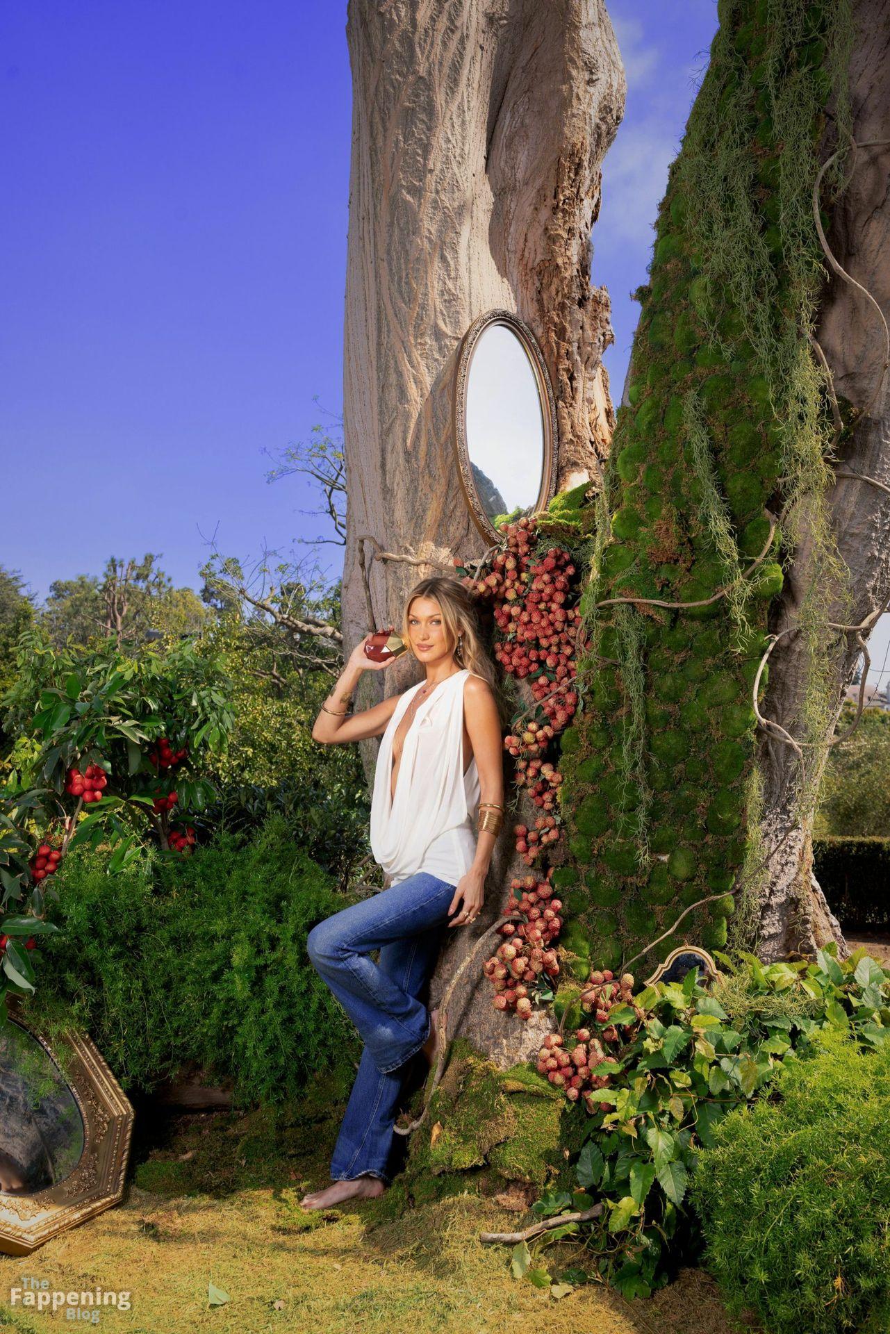 Bella Hadid exibe decote e lateral dos seios em sua nova campanha de fragrância – Eternal Roots da Orebella.