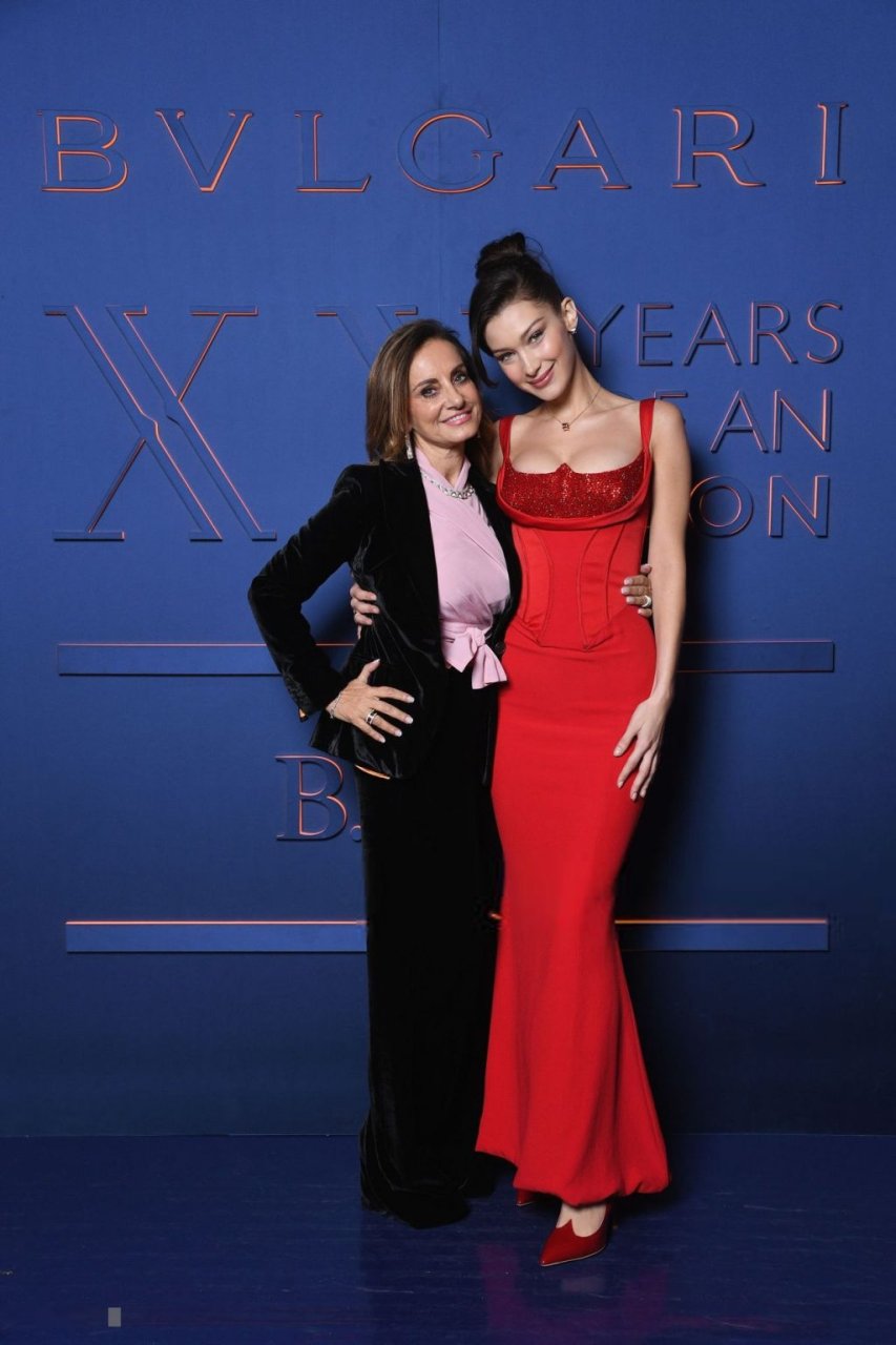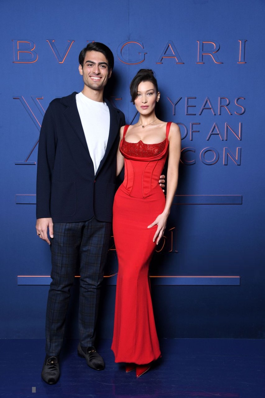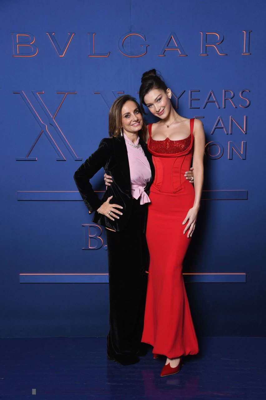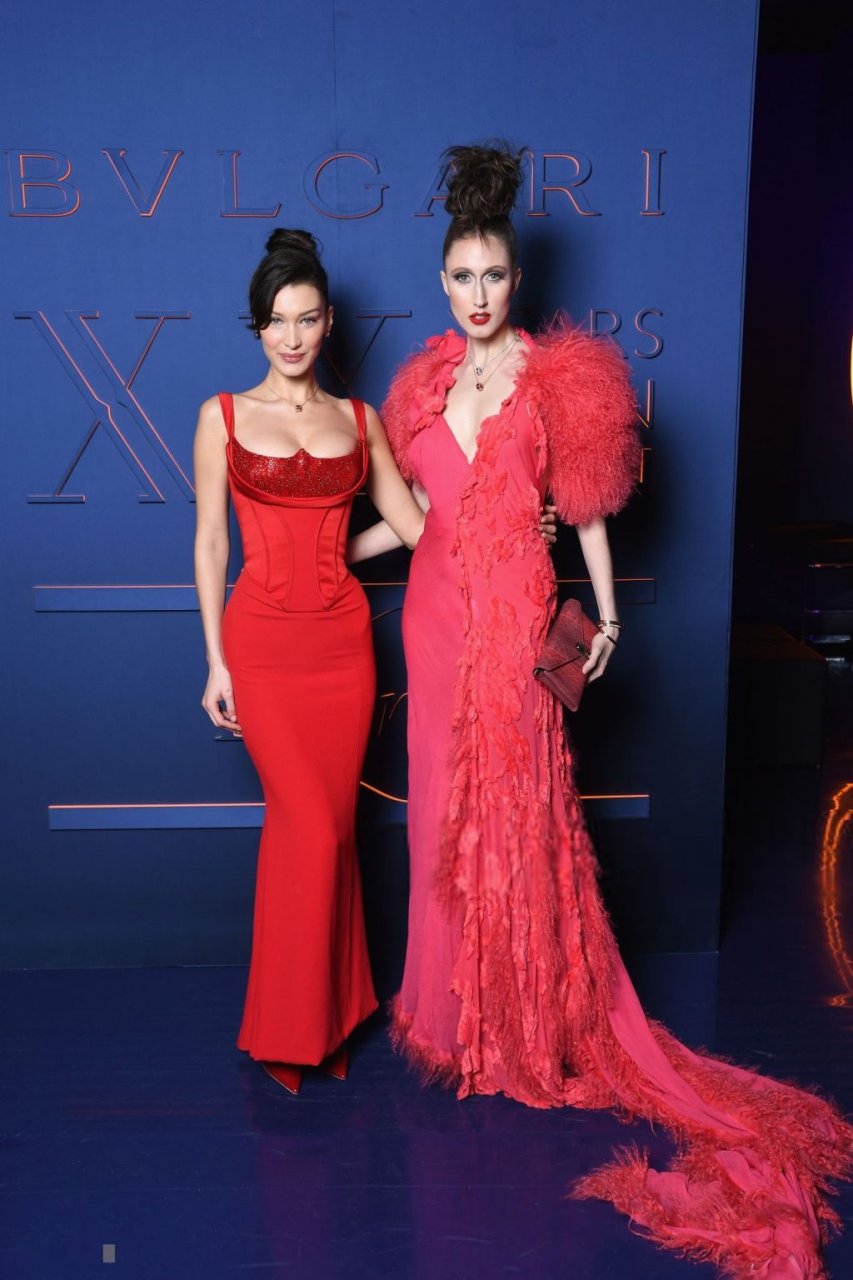 A noite da marca Bvlgari foi realizada em Roma, 19/02/2019. Celebridades e amigos da marca participaram do evento. Todos os convidados escolheram looks espetaculares para a noite. A modelo Bella Hadid (22) apareceu com um vestido vermelho da Versace com decote profundo e corpete, destacando sua cintura fina.