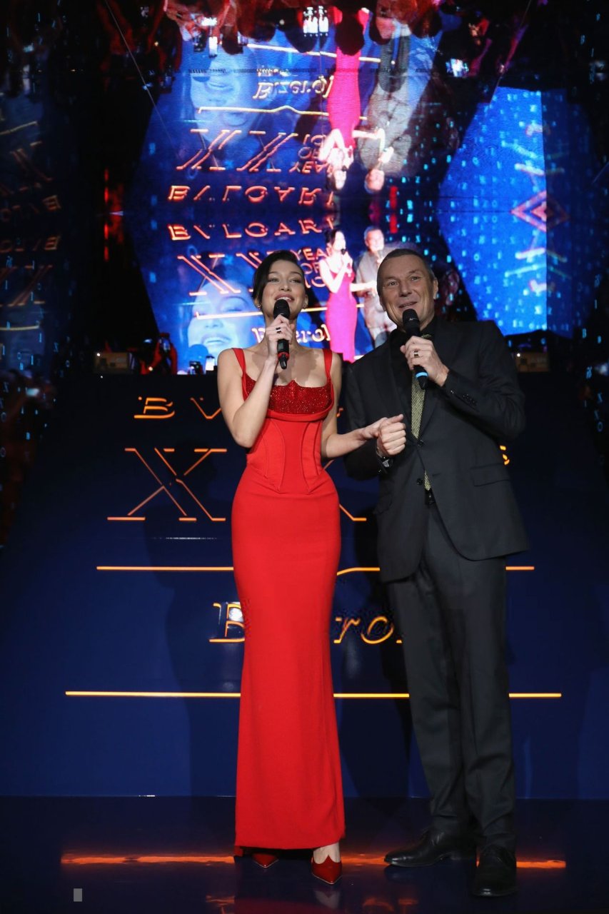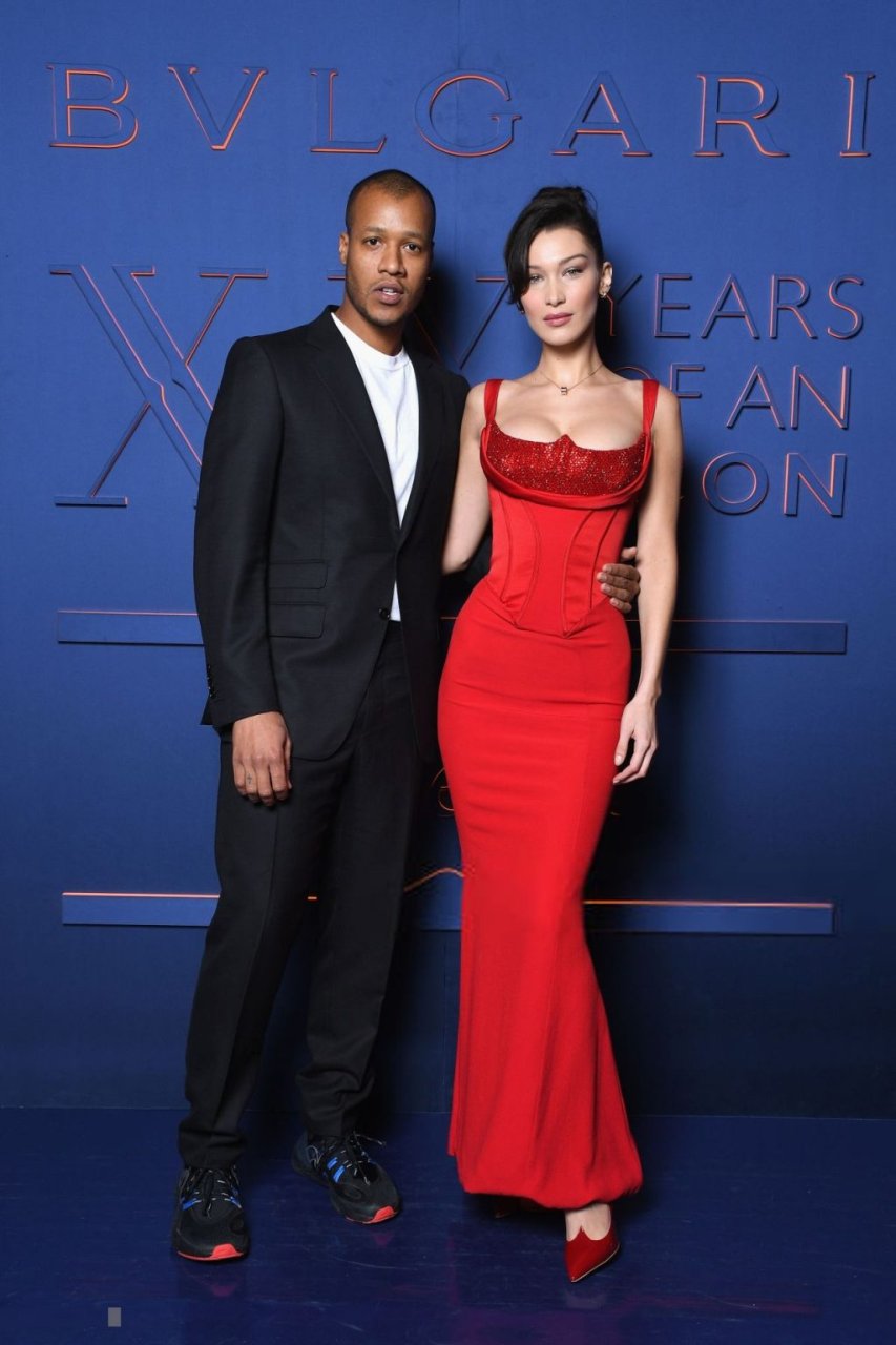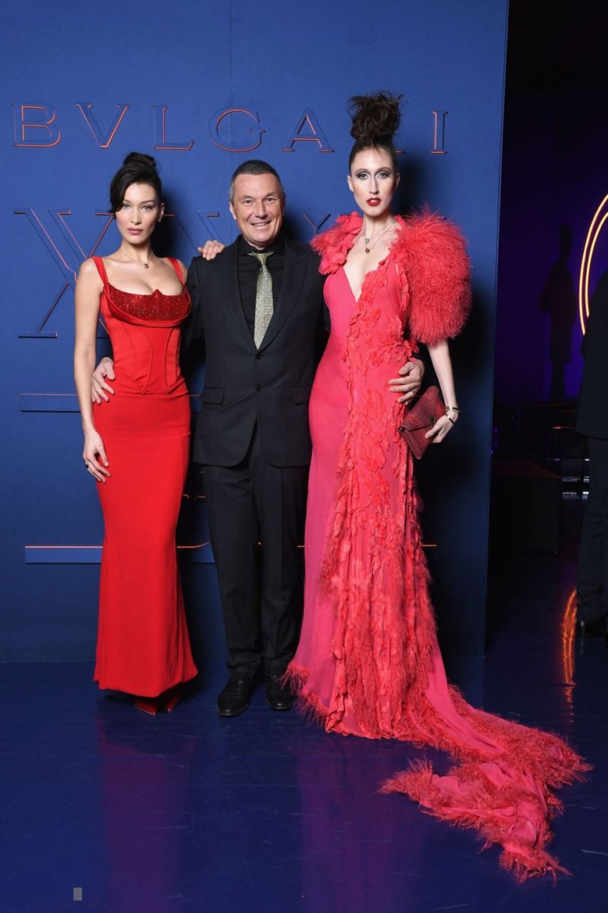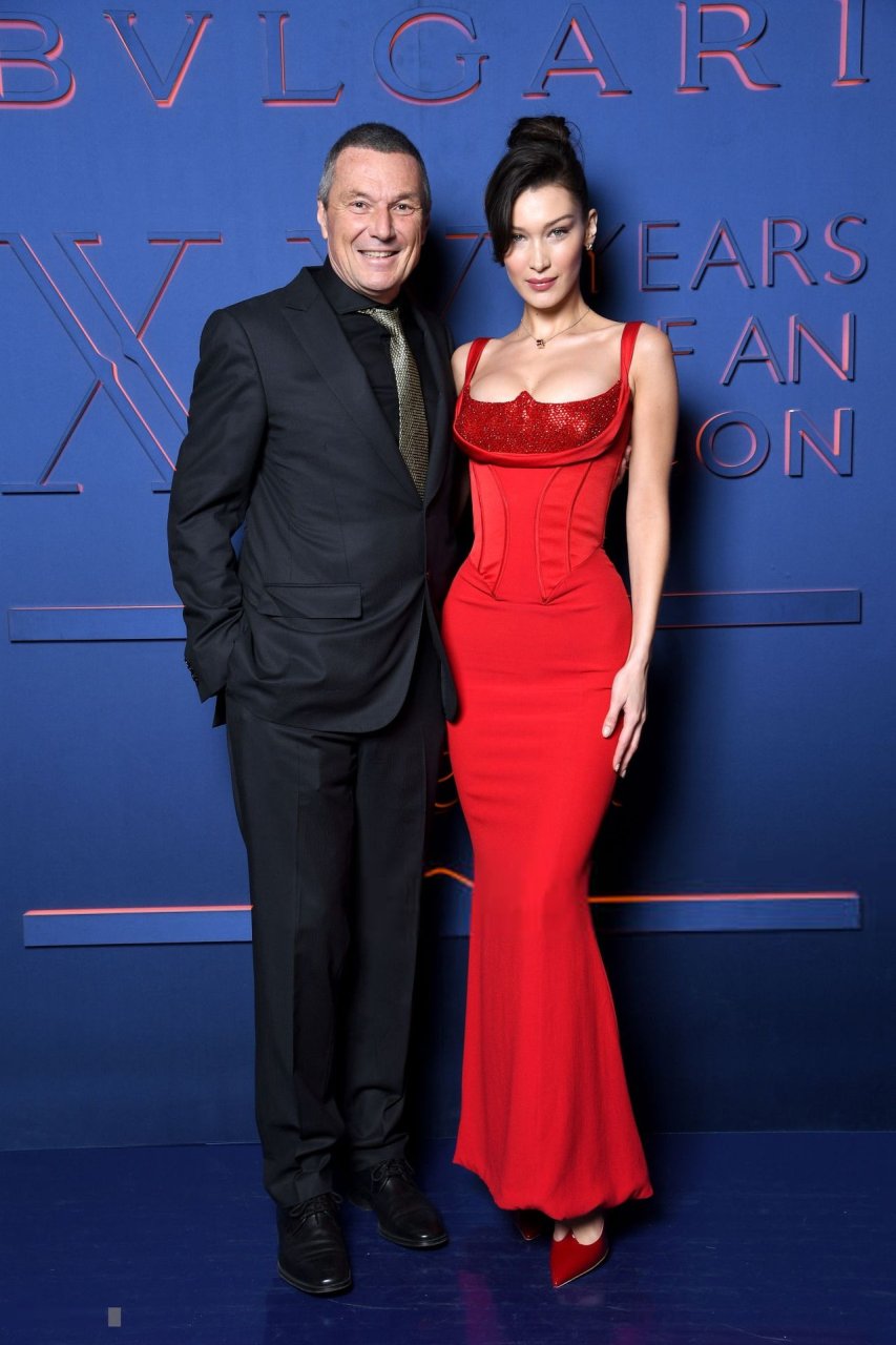 A noite da marca Bvlgari foi realizada em Roma, 19/02/2019. Celebridades e amigos da marca participaram do evento. Todos os convidados escolheram looks espetaculares para a noite. A modelo Bella Hadid (22) apareceu com um vestido vermelho da Versace com decote profundo e corpete, destacando sua cintura fina.