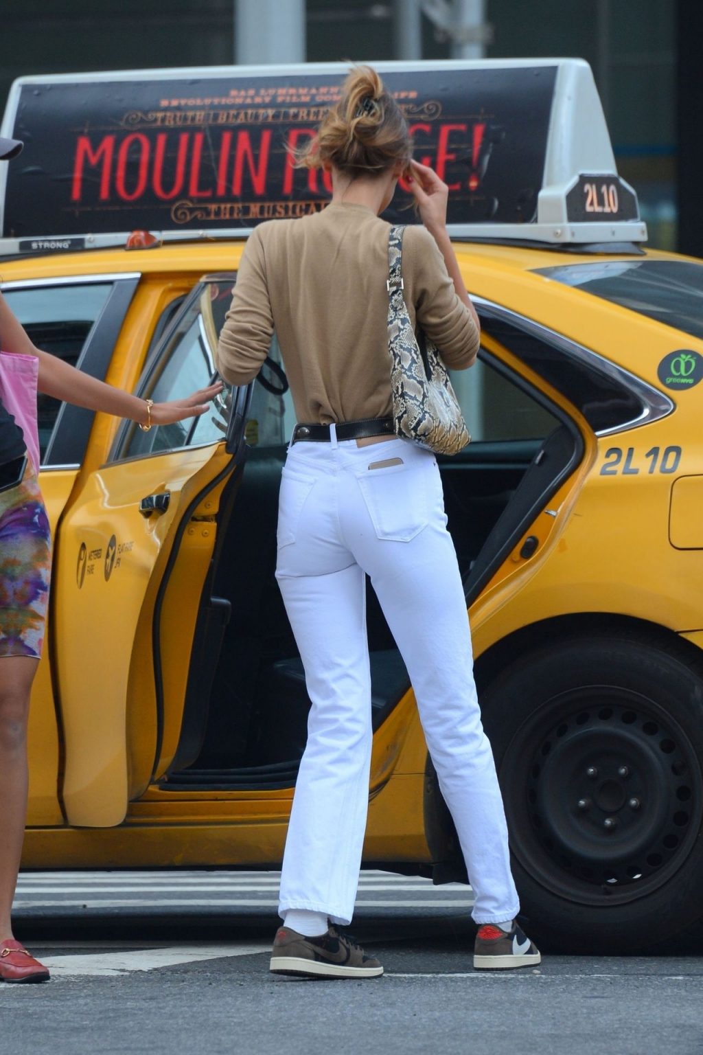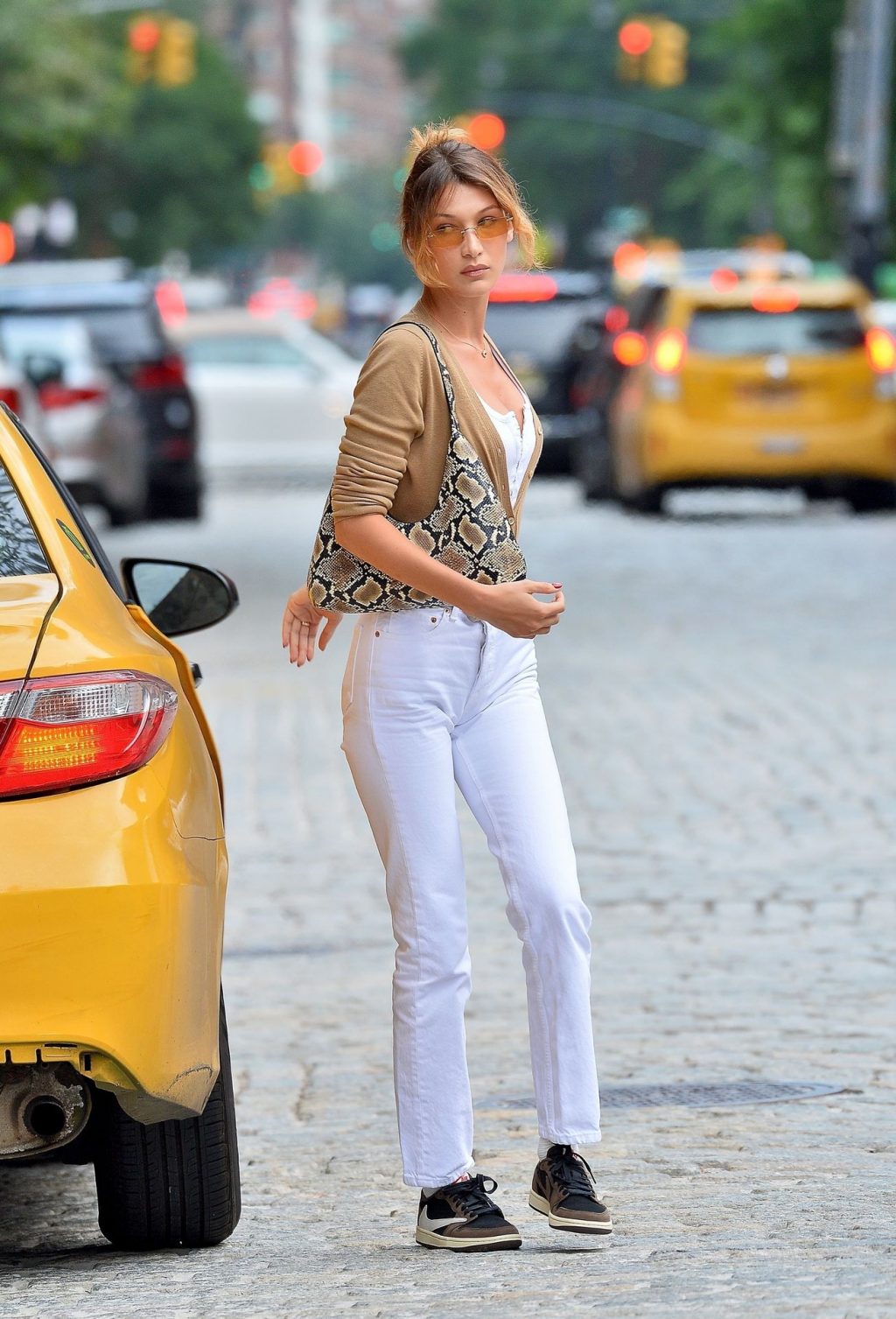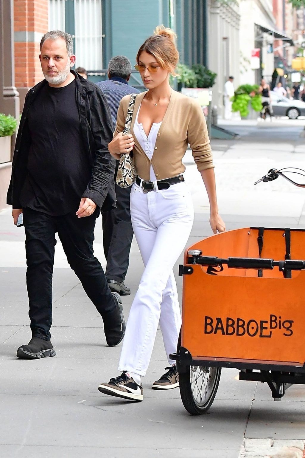 Model Bella Hadid exibe um pouco de decote e seu novo estilo loiro enquanto sai em Nova York, 17/07/2019. Ela está trapaceando com seus seios!