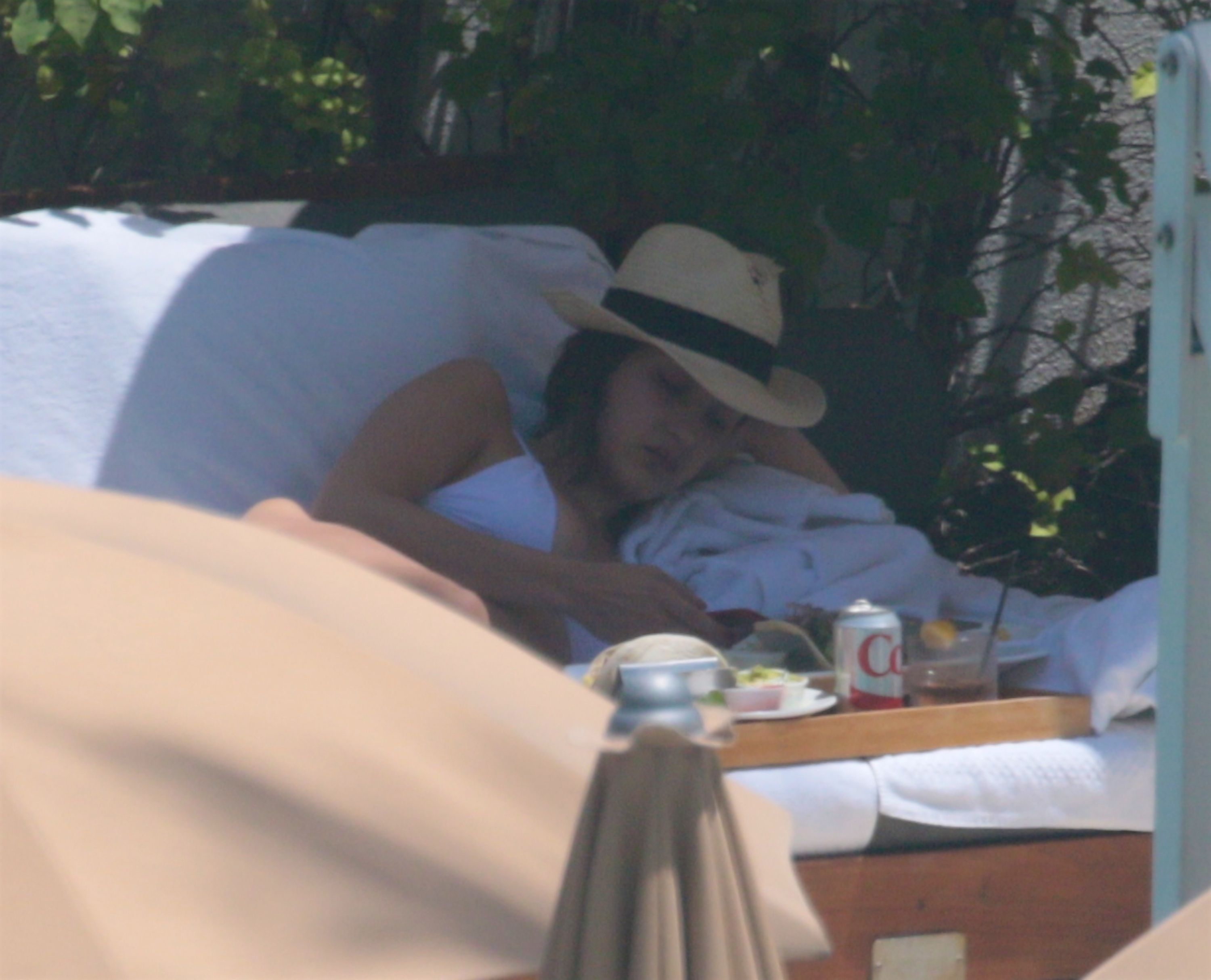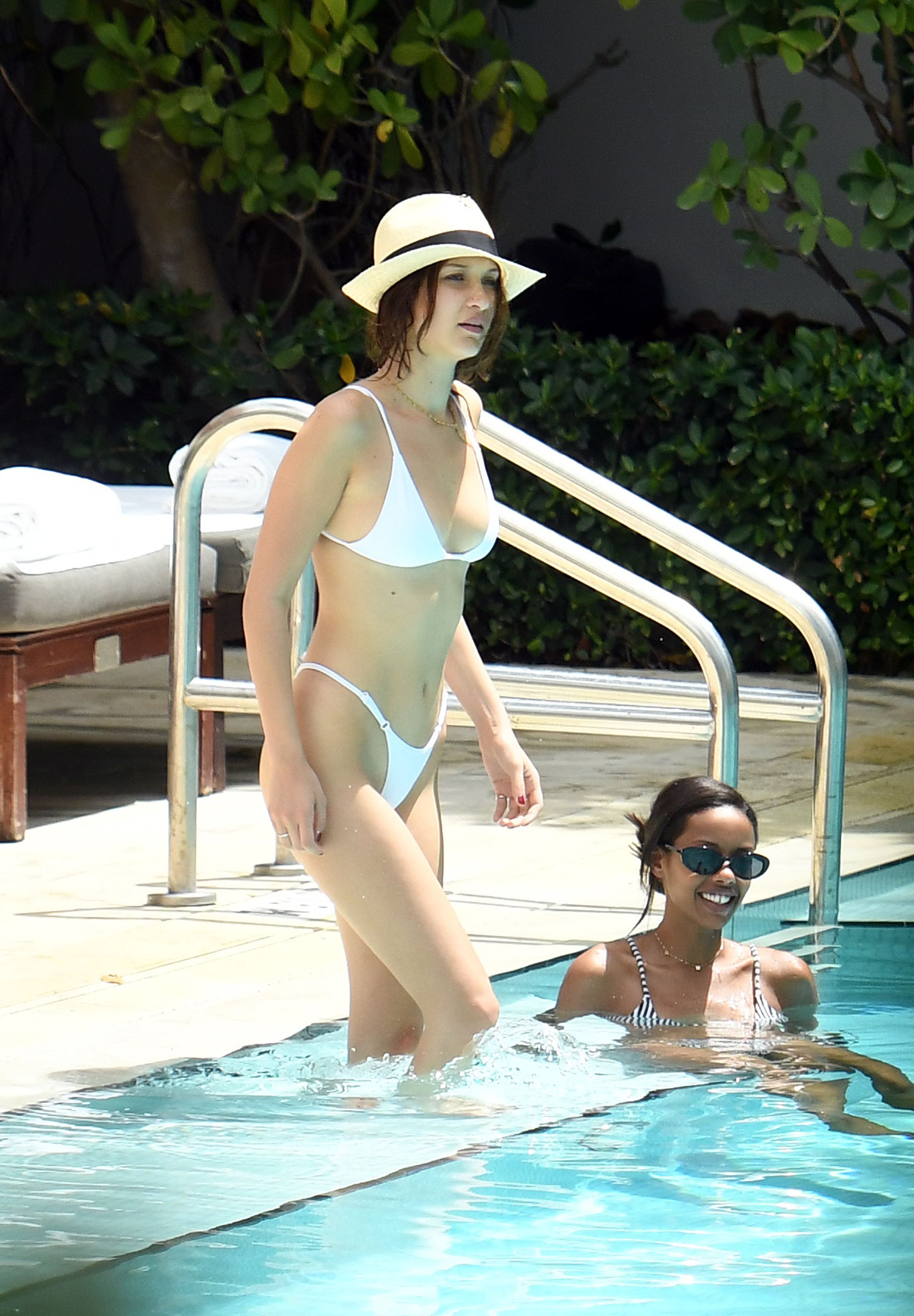 Bella Hadid aproveita dia na piscina de biquíni branco com amigos em Miami, 28/04/2017. Bella Hadid é uma modelo e atriz americana. Idade – 20 (9 de outubro de 1996).