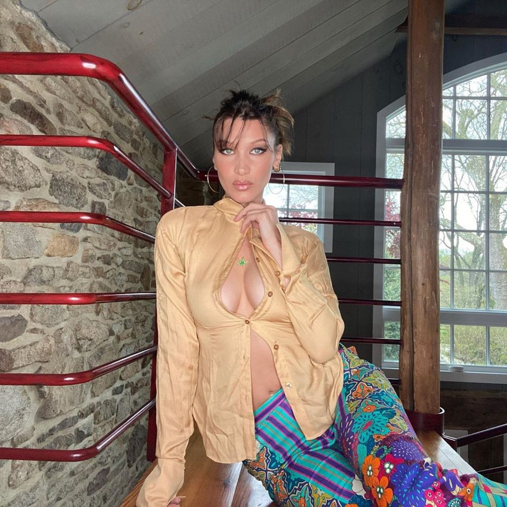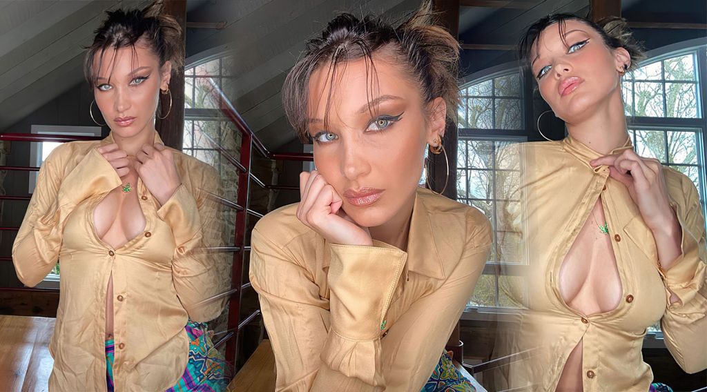 Modelo Bella Hadid exibe seu decote sexy em uma camisa creme brûlée para um ensaio fotográfico quente no Instagram (maio de 2020).