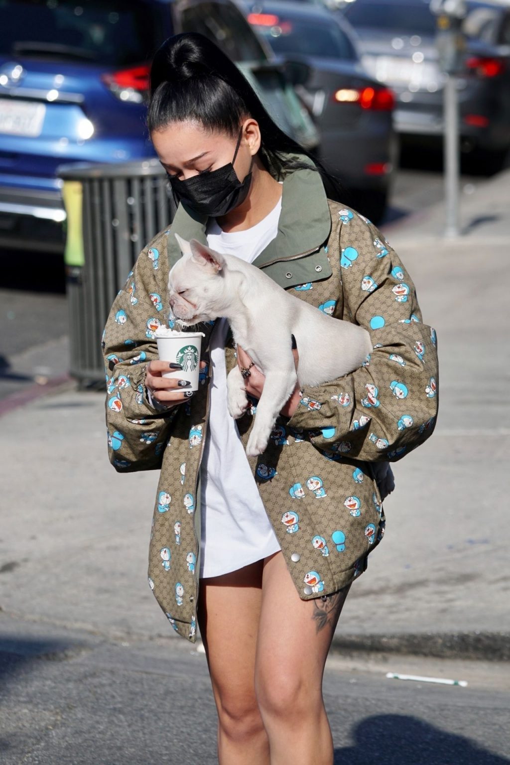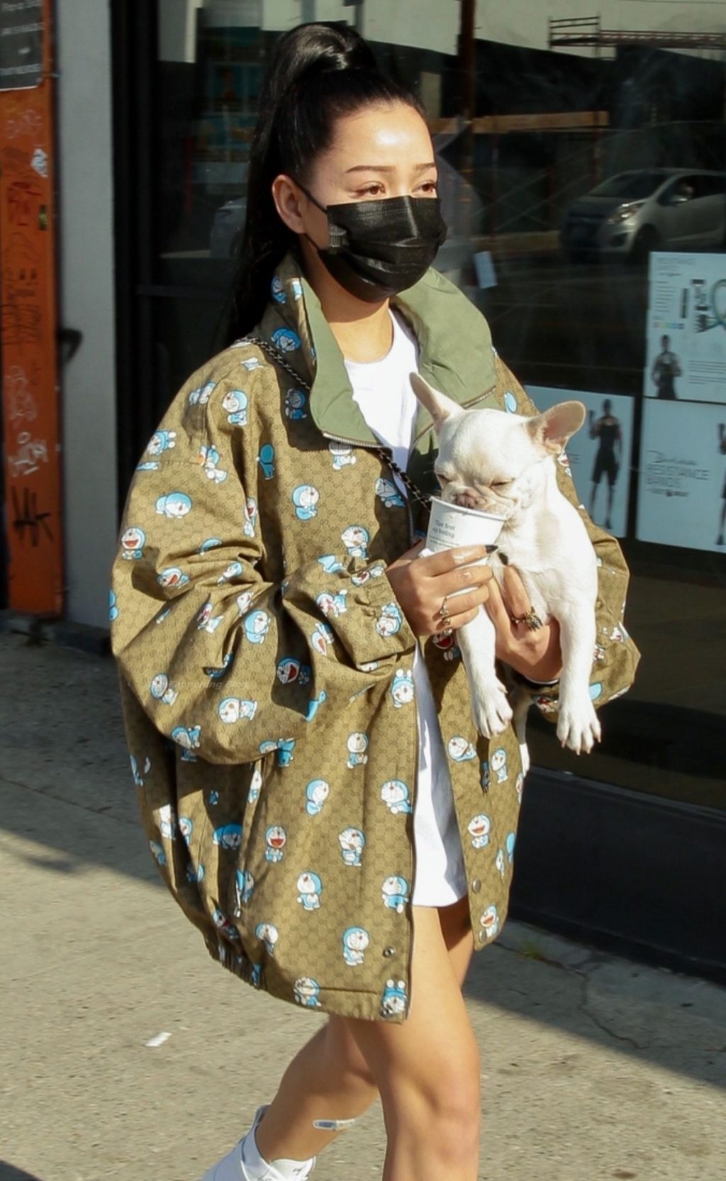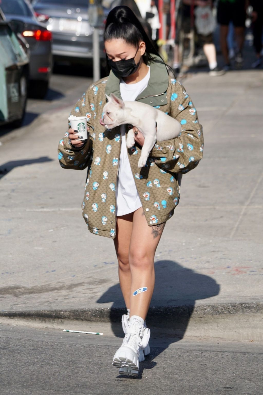 Youtuber e estrela do TikTok Bella Poarch foi vista alimentando seu cachorro com um pouco de chantilly do Starbucks enquanto exibia seu senso de moda na Melrose Ave em West Hollywood, 02/05/2021.