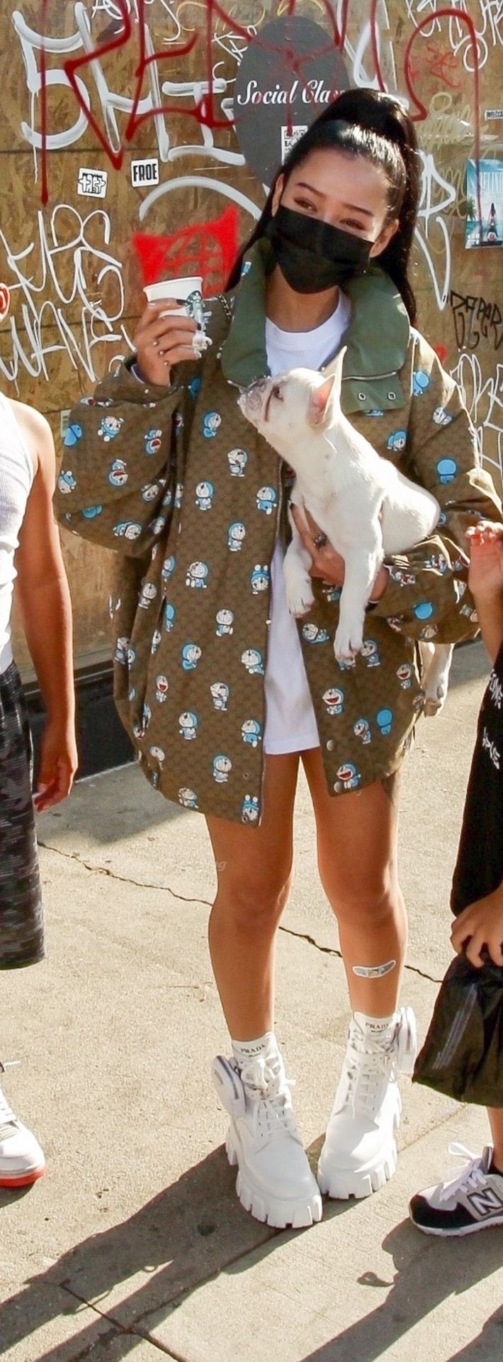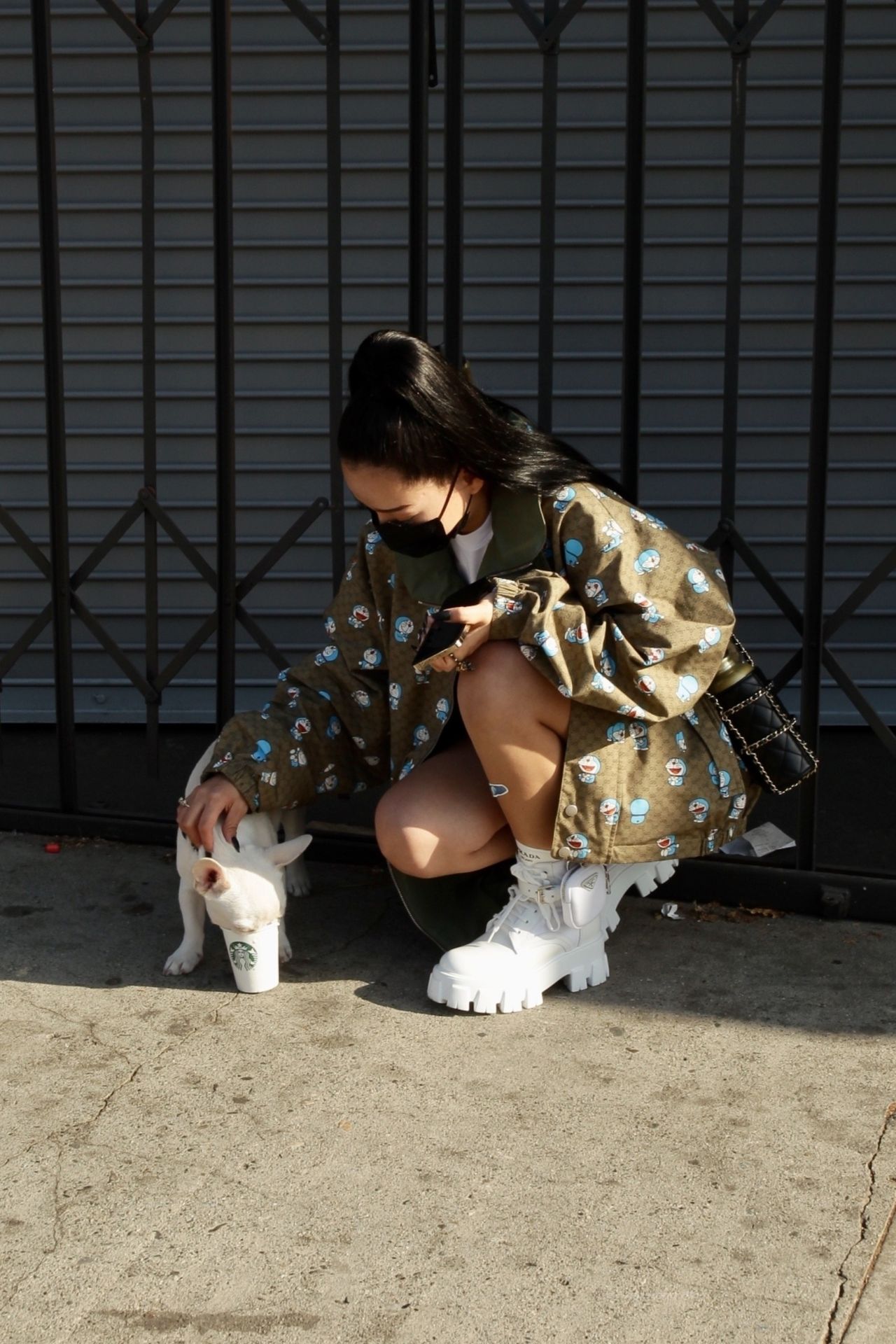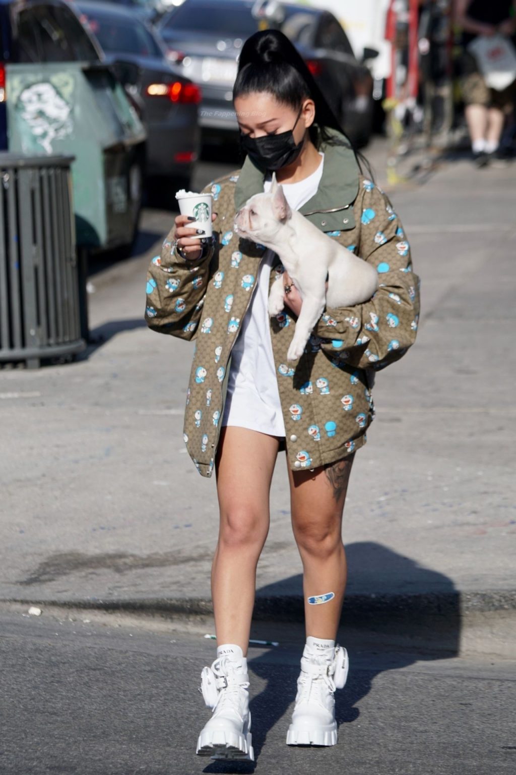 Youtuber e estrela do TikTok Bella Poarch foi vista alimentando seu cachorro com um pouco de chantilly do Starbucks enquanto exibia seu senso de moda na Melrose Ave em West Hollywood, 02/05/2021.