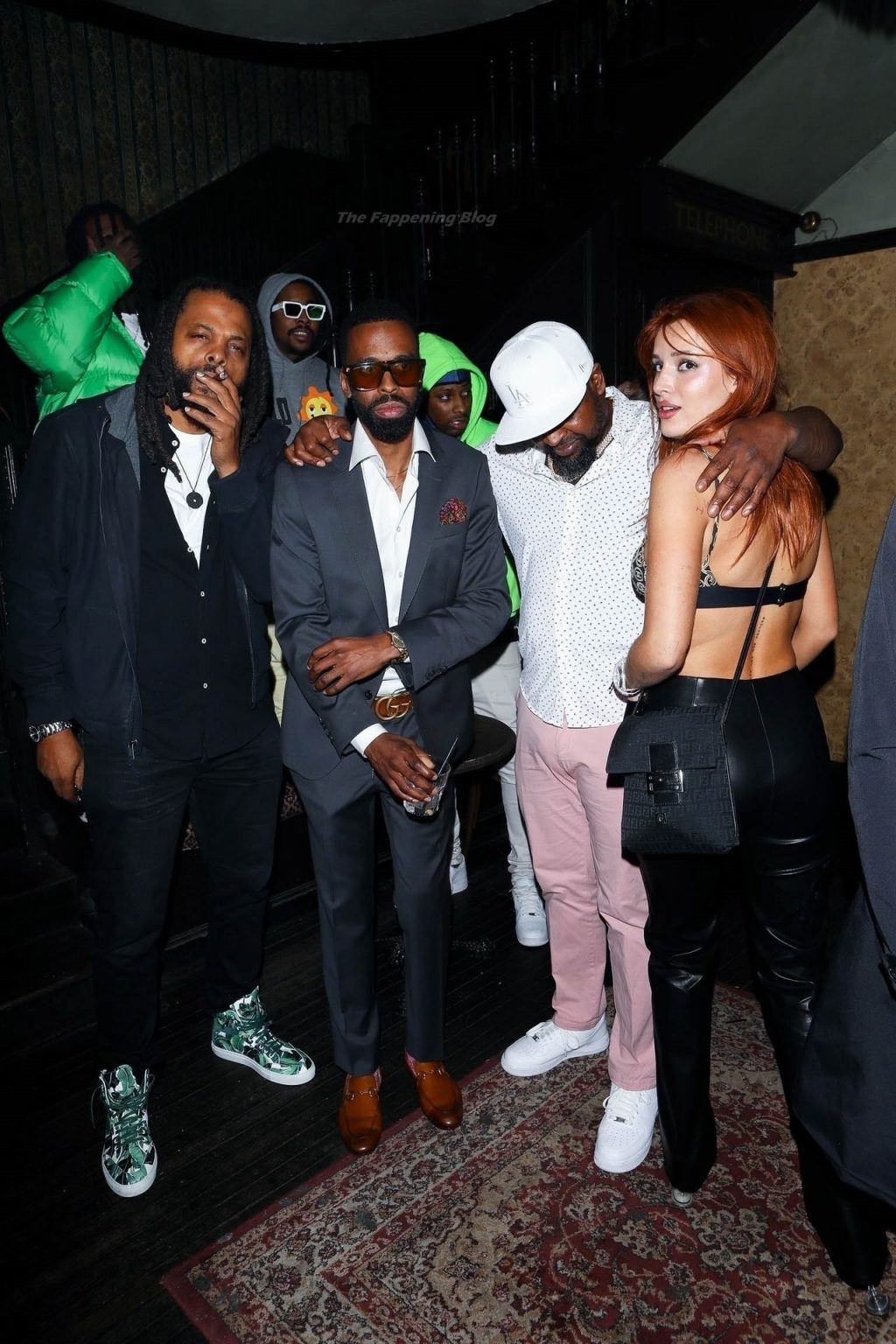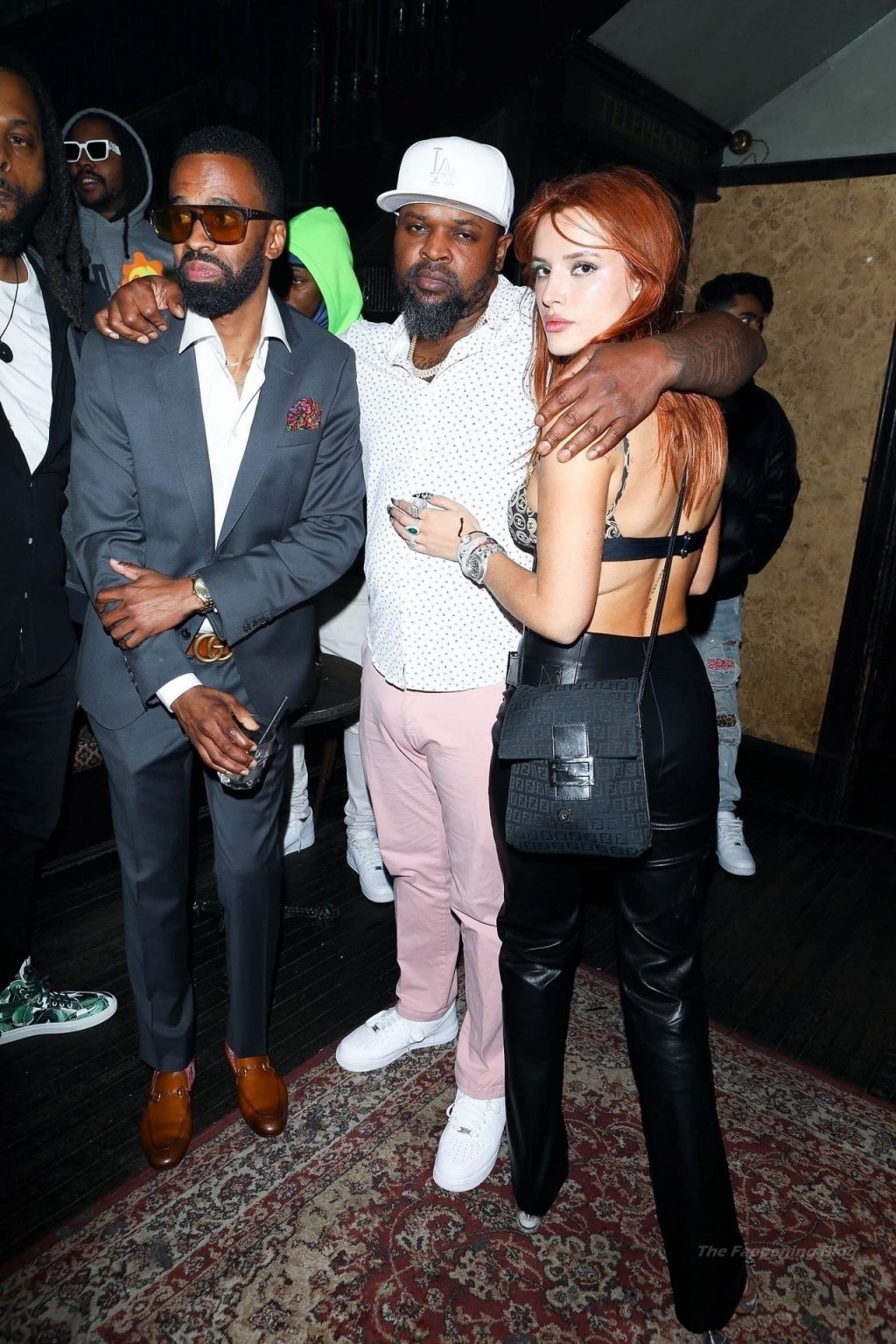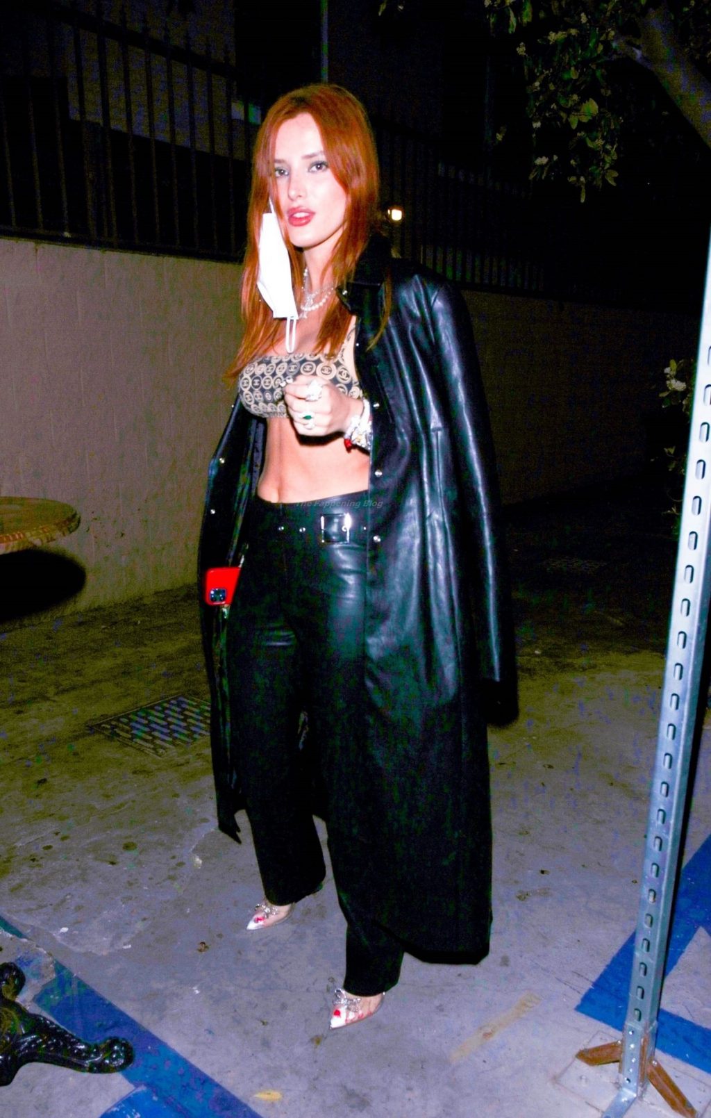 A estrela de The Fappening Bella Thorne exibe couro ao usar um conjunto combinando de casaco trench coat e calças ao chegar na festa de aniversário do seu gerente em Hollywood, 15/03/2021.
