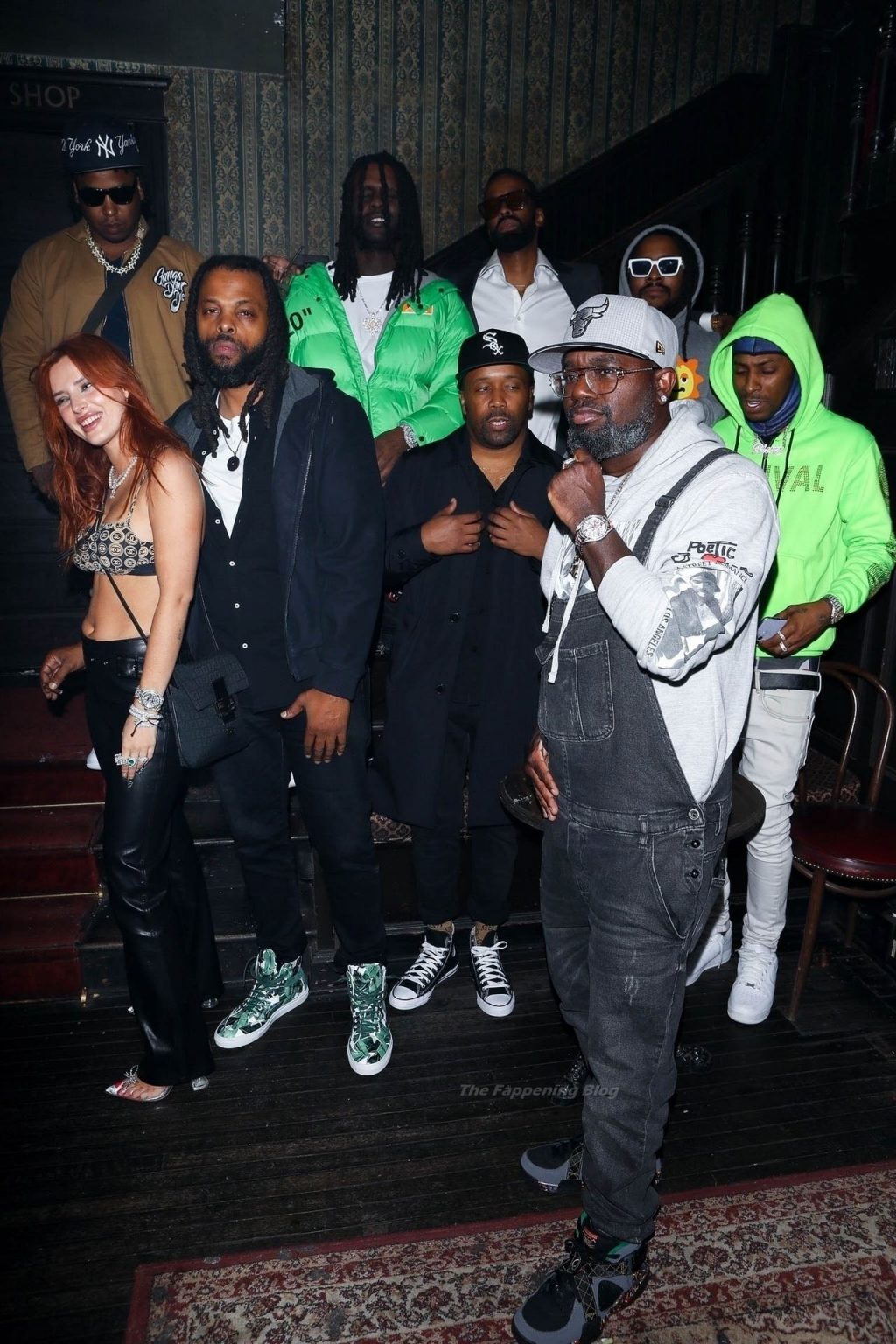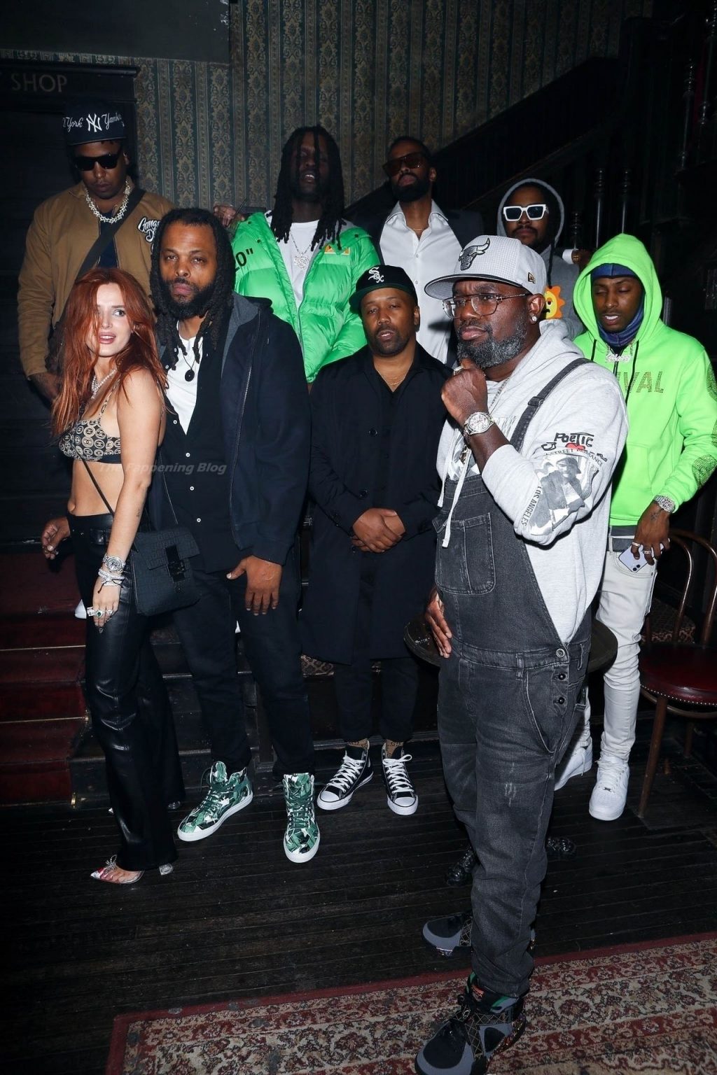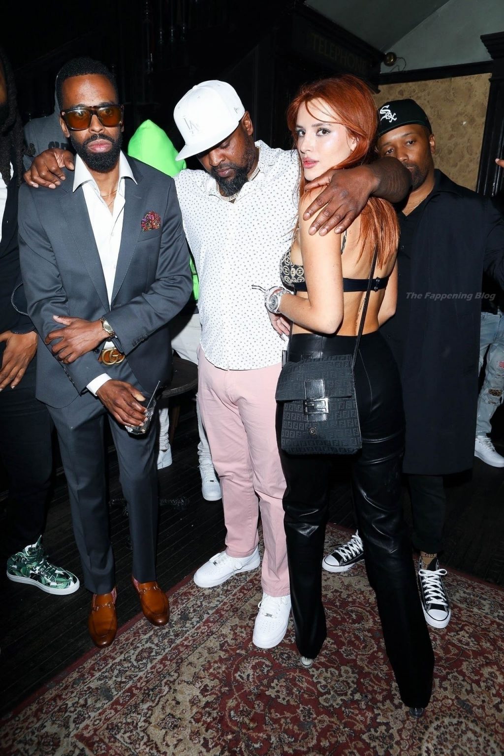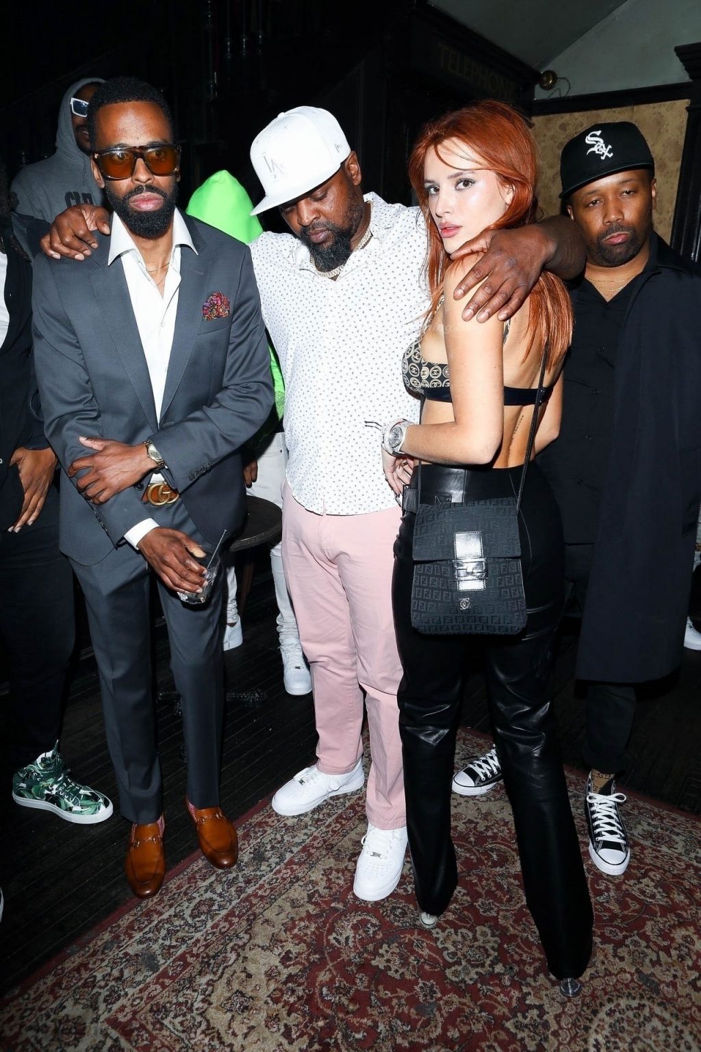 A estrela de The Fappening Bella Thorne exibe couro ao usar um conjunto combinando de casaco trench coat e calças ao chegar na festa de aniversário do seu gerente em Hollywood, 15/03/2021.
