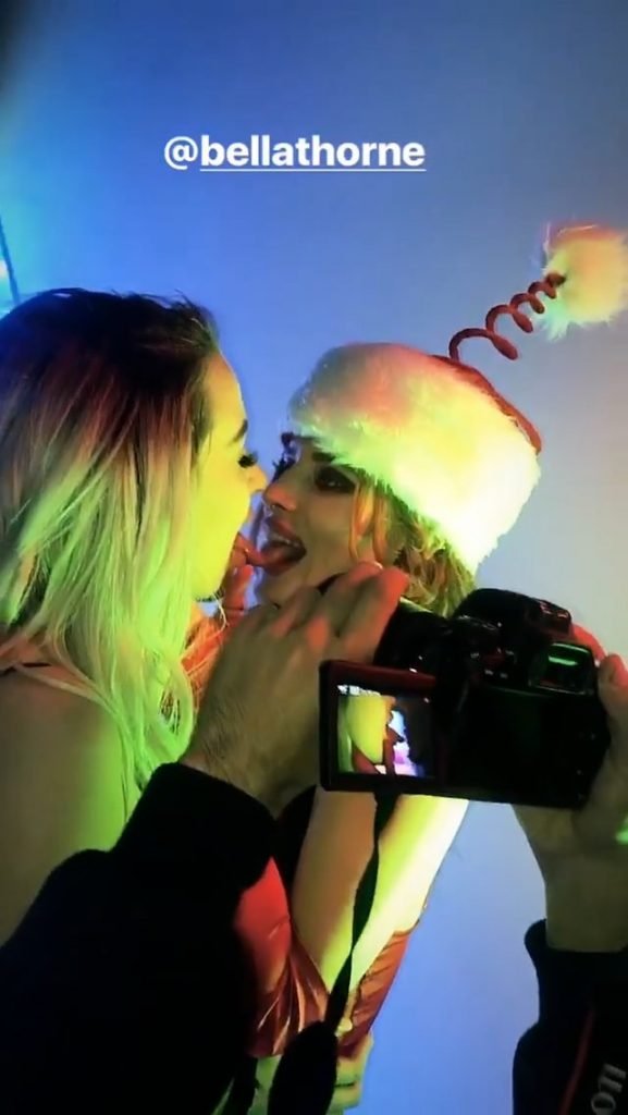 Bella Thorne usa fantasia sexy de Papai Noel no set do clipe de Natal – Instagram, 09/12/2017. Annabella Thorne é uma atriz americana (Assassination Nation), estrela do Instagram, cantora. Idade: 20.