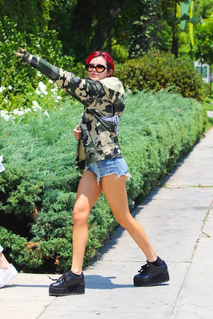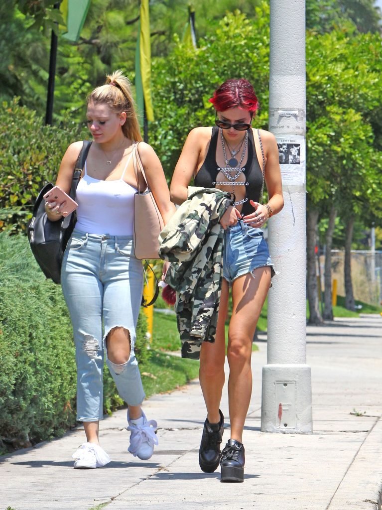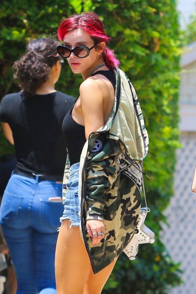 Bella Thorne sem sutiã usa um body preto arriscado e shorts em Los Angeles, 11/07/2017. Bella Thorne é modelo, atriz de cinema (Be Here Now), cantora, estrela das redes sociais. Idade: 19.