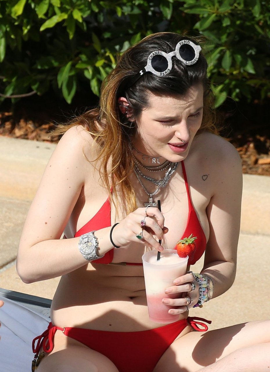 A atriz Bella Thorne usa um biquíni vermelho e sua irmã Dani lava seu cabelo com cerveja na piscina em Miami, 13/03/2019.