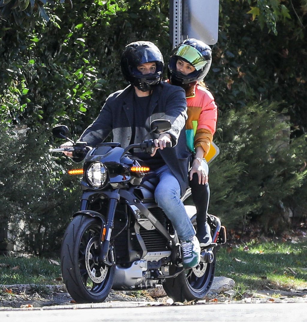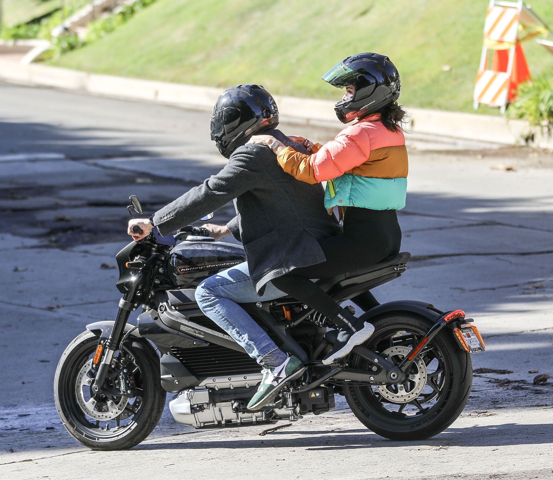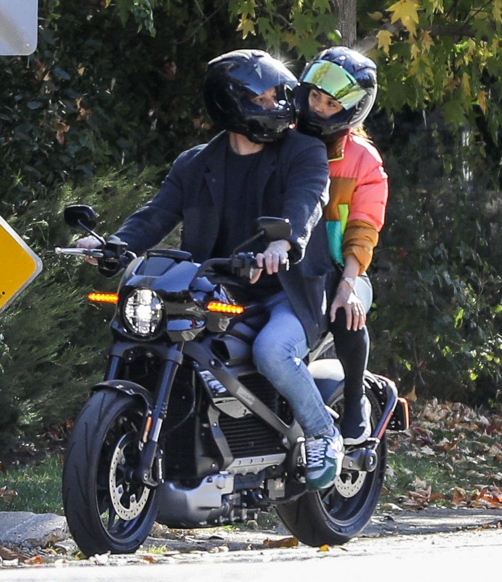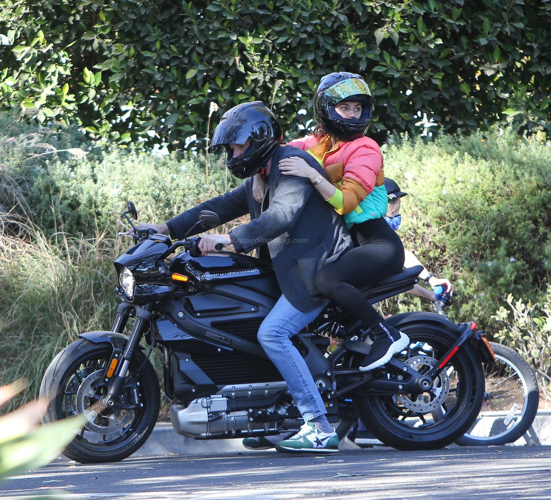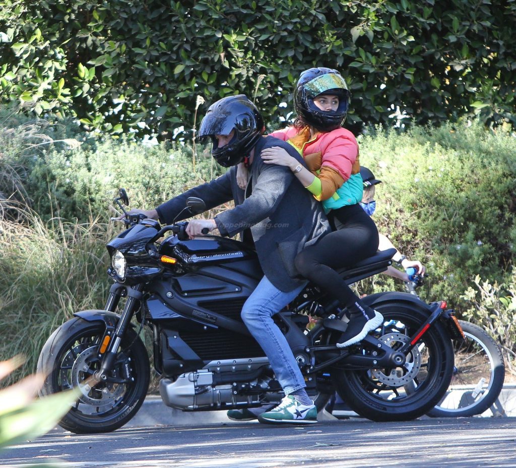 “Batman” estrela Ben Affleck é visto dirigindo uma Harley Davidson LiveWire elétrica com sua namorada, a atriz cubana Ana de Armas atrás dele e seguindo seu filho Samuel de bicicleta em Brentwood, 27/11/2020.