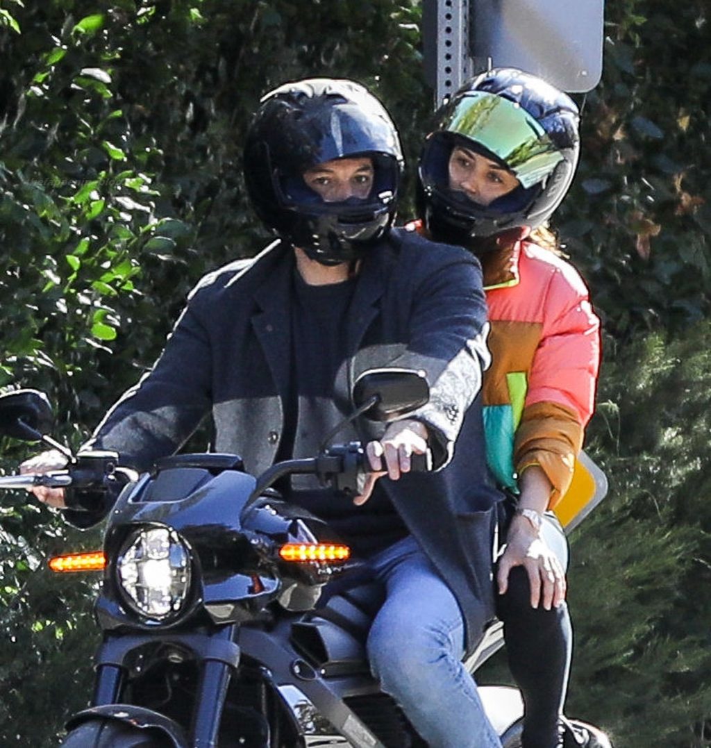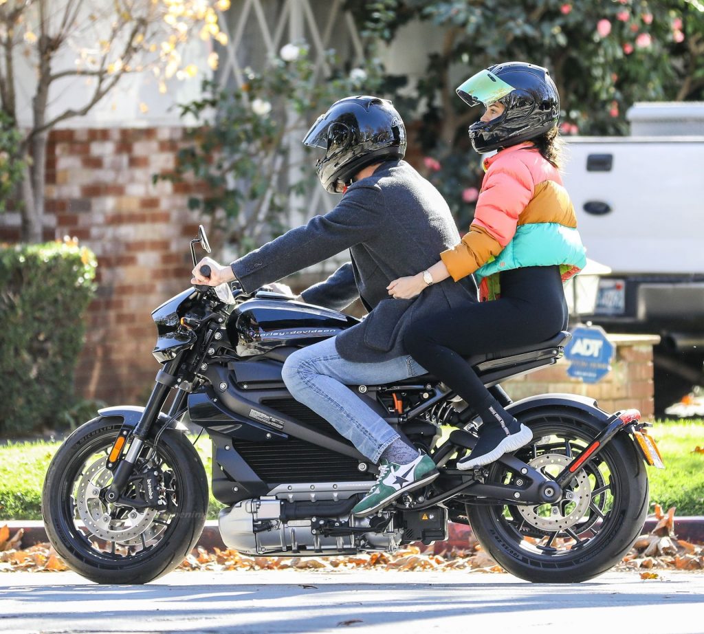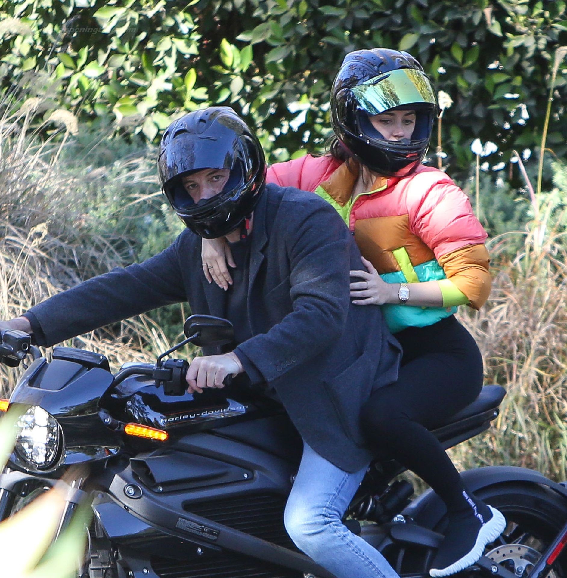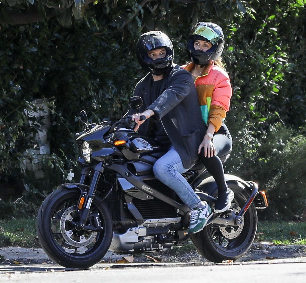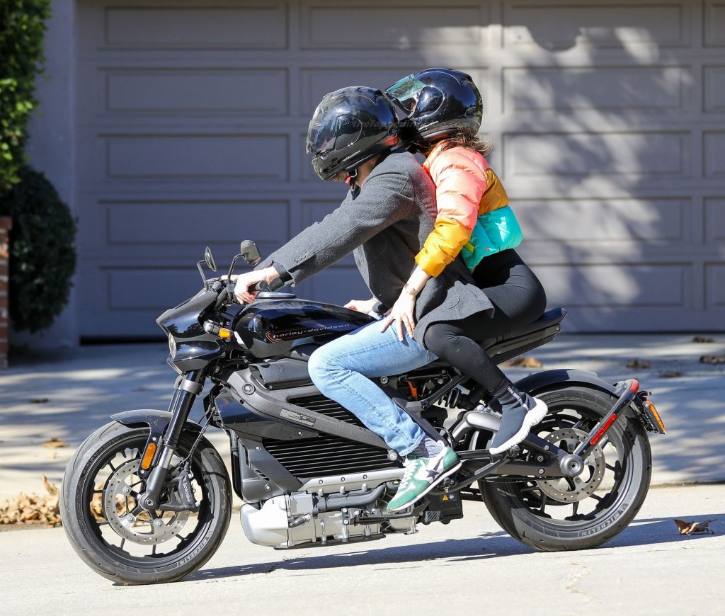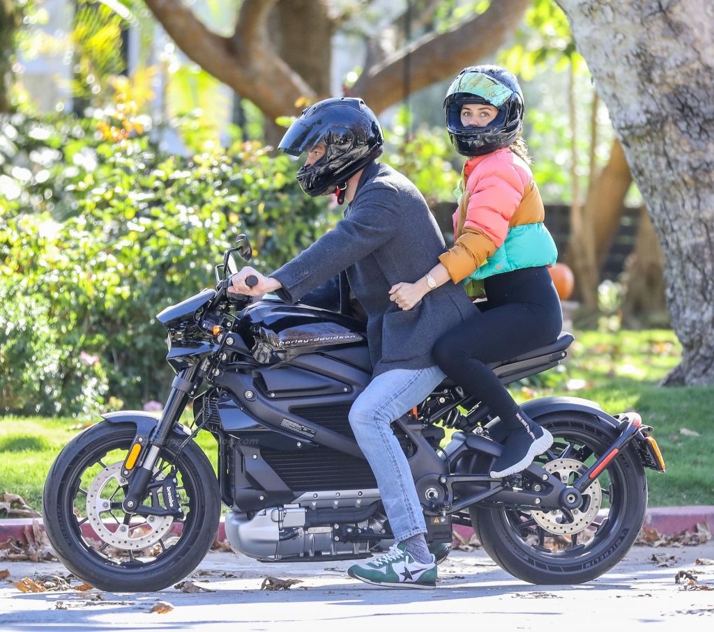 “Batman” estrela Ben Affleck é visto dirigindo uma Harley Davidson LiveWire elétrica com sua namorada, a atriz cubana Ana de Armas atrás dele e seguindo seu filho Samuel de bicicleta em Brentwood, 27/11/2020.