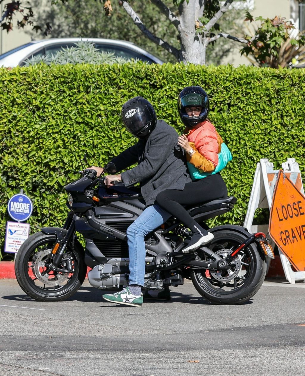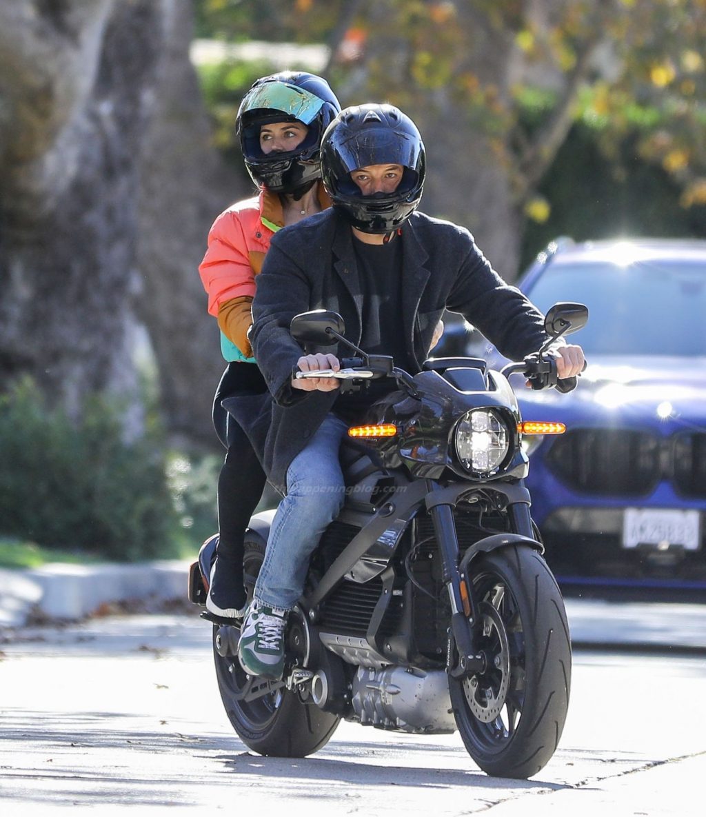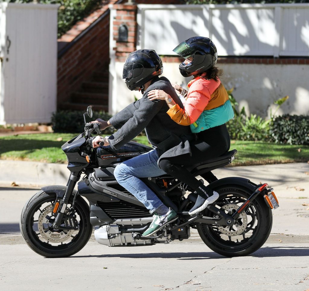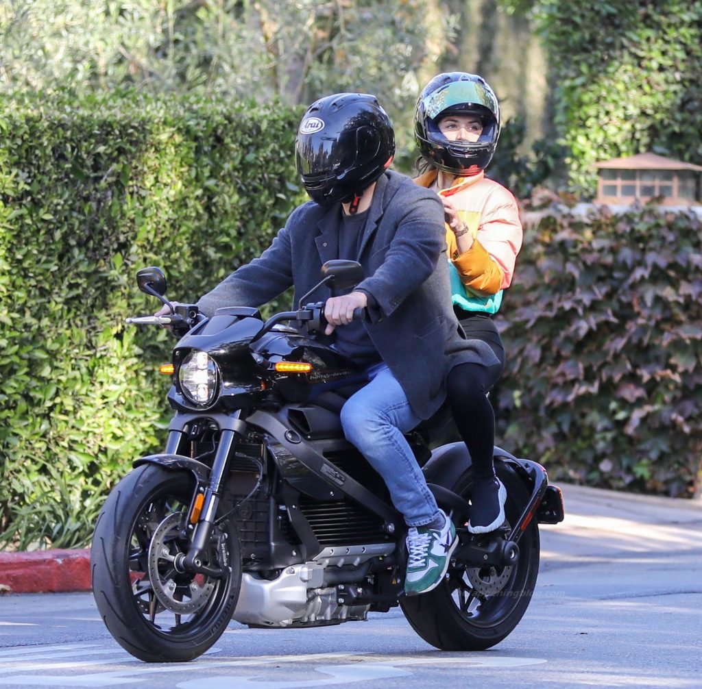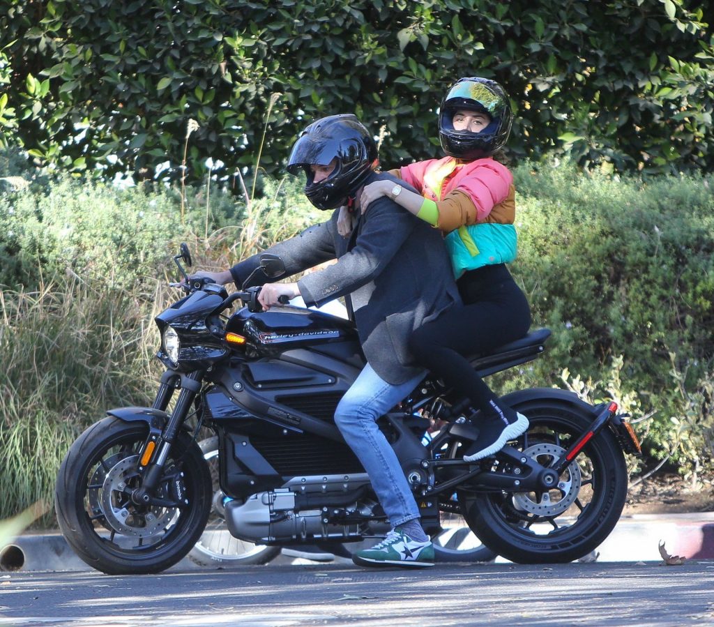 “Batman” estrela Ben Affleck é visto dirigindo uma Harley Davidson LiveWire elétrica com sua namorada, a atriz cubana Ana de Armas atrás dele e seguindo seu filho Samuel de bicicleta em Brentwood, 27/11/2020.