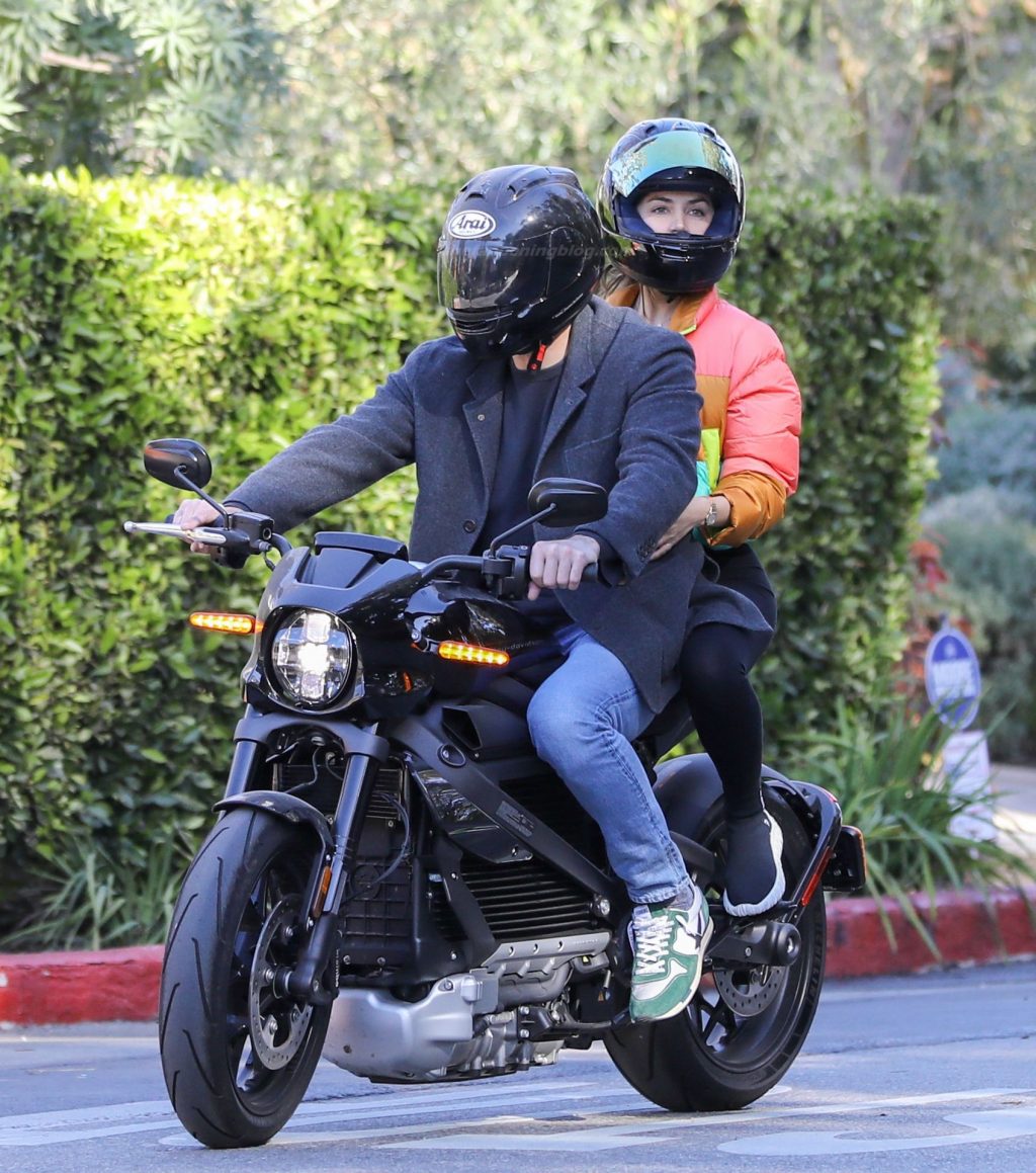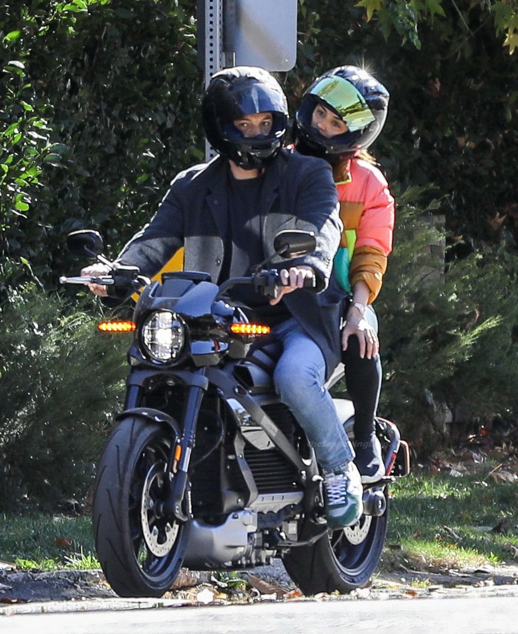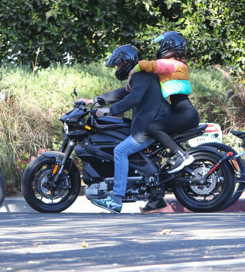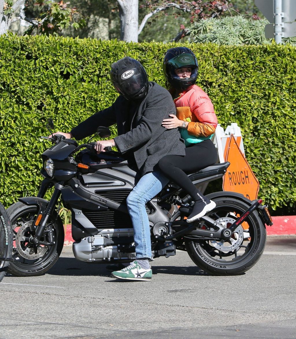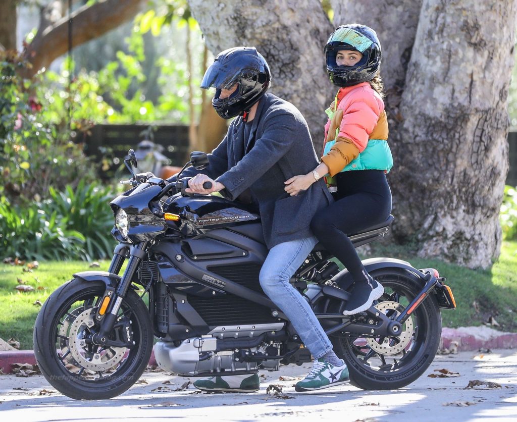“Batman” estrela Ben Affleck é visto dirigindo uma Harley Davidson LiveWire elétrica com sua namorada, a atriz cubana Ana de Armas atrás dele e seguindo seu filho Samuel de bicicleta em Brentwood, 27/11/2020.