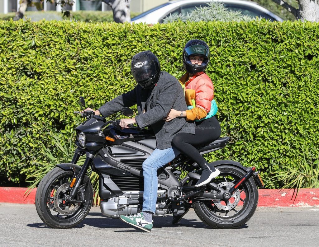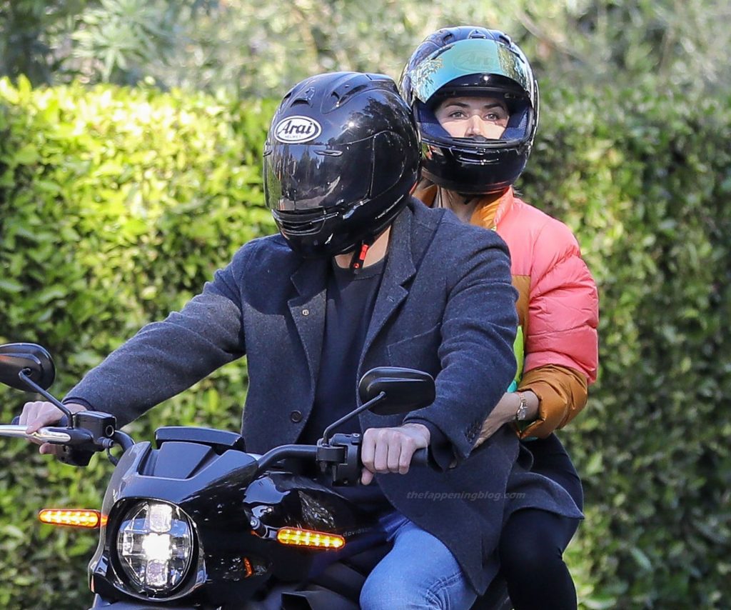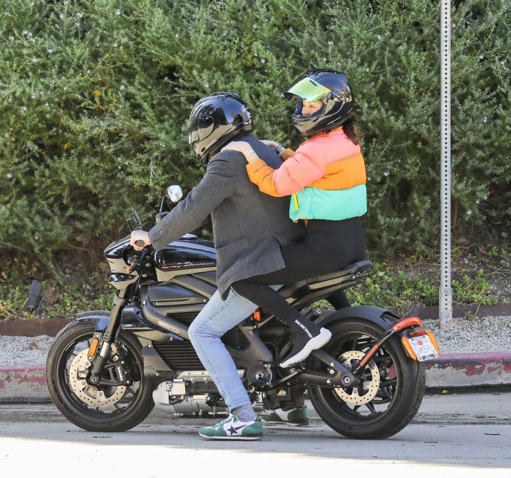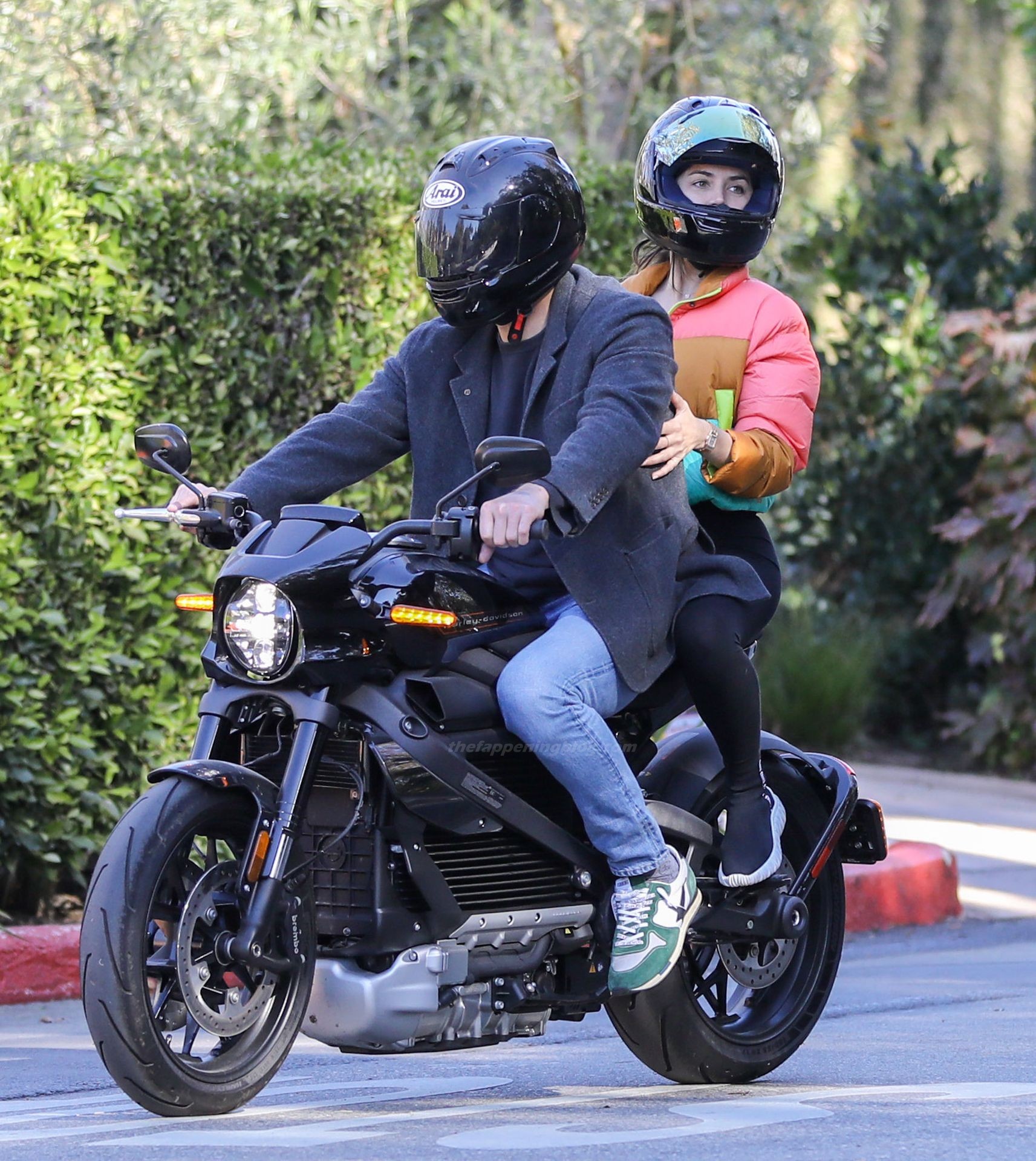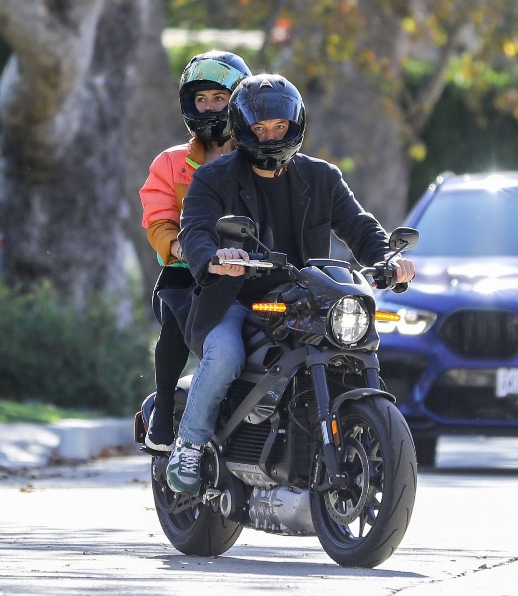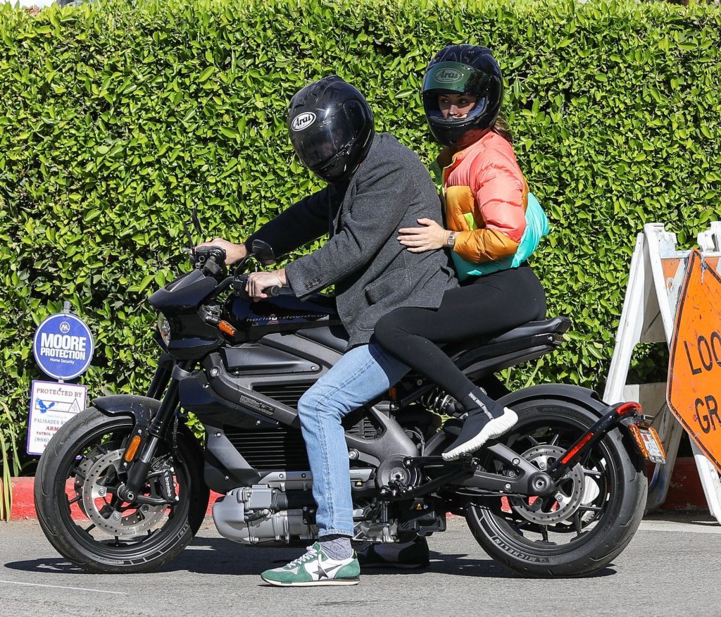 “Batman” estrela Ben Affleck é visto dirigindo uma Harley Davidson LiveWire elétrica com sua namorada, a atriz cubana Ana de Armas atrás dele e seguindo seu filho Samuel de bicicleta em Brentwood, 27/11/2020.