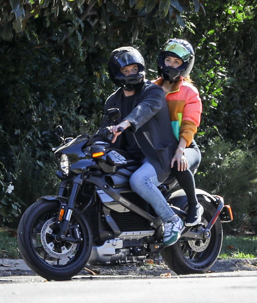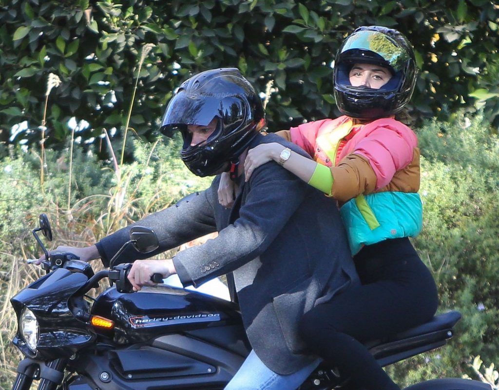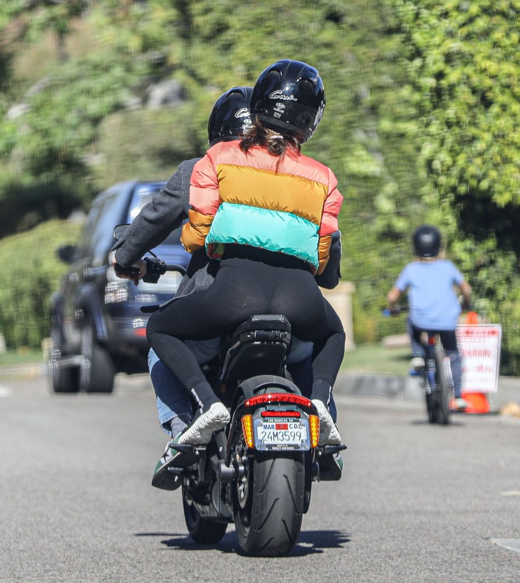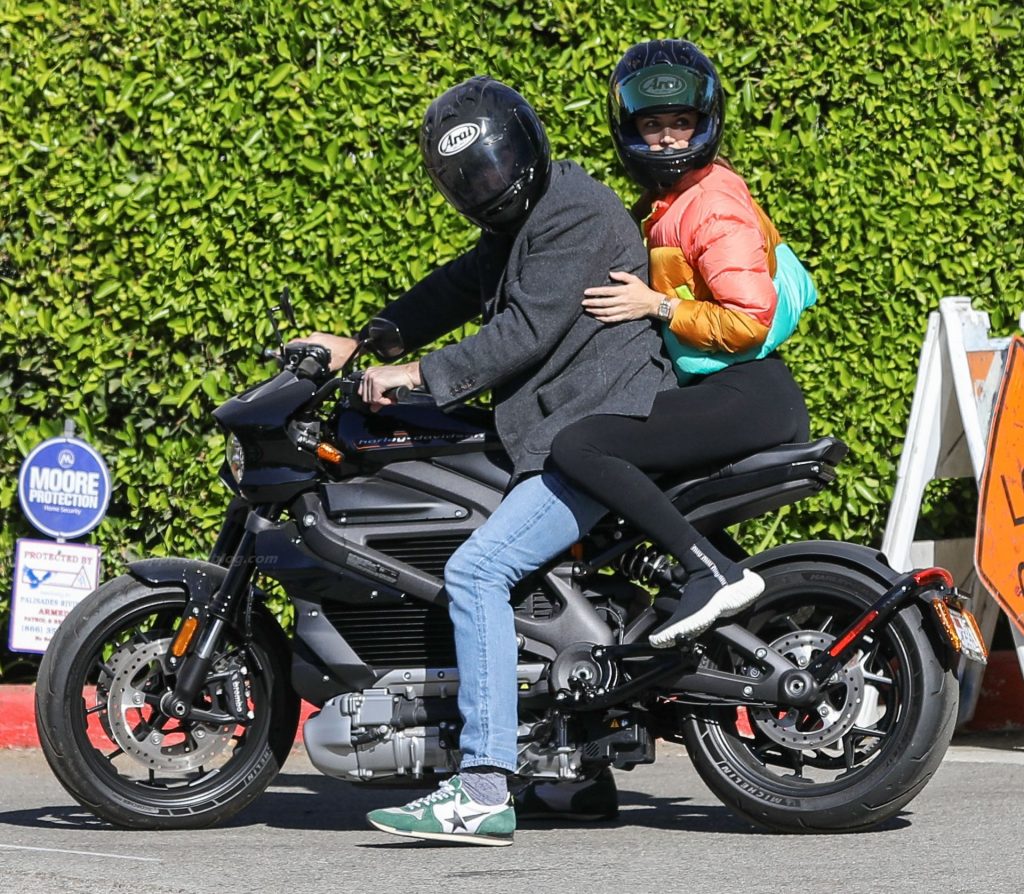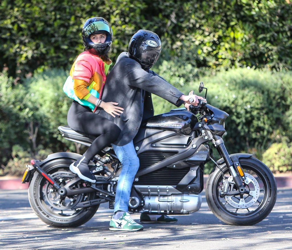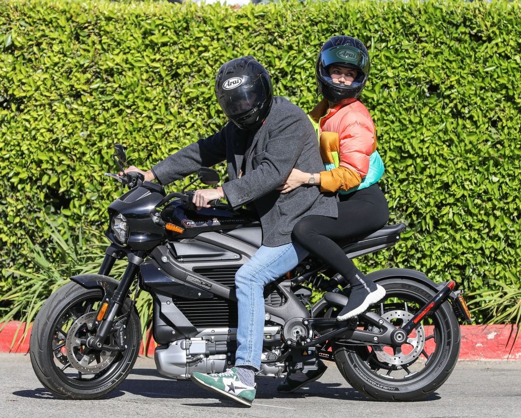 “Batman” estrela Ben Affleck é visto dirigindo uma Harley Davidson LiveWire elétrica com sua namorada, a atriz cubana Ana de Armas atrás dele e seguindo seu filho Samuel de bicicleta em Brentwood, 27/11/2020.