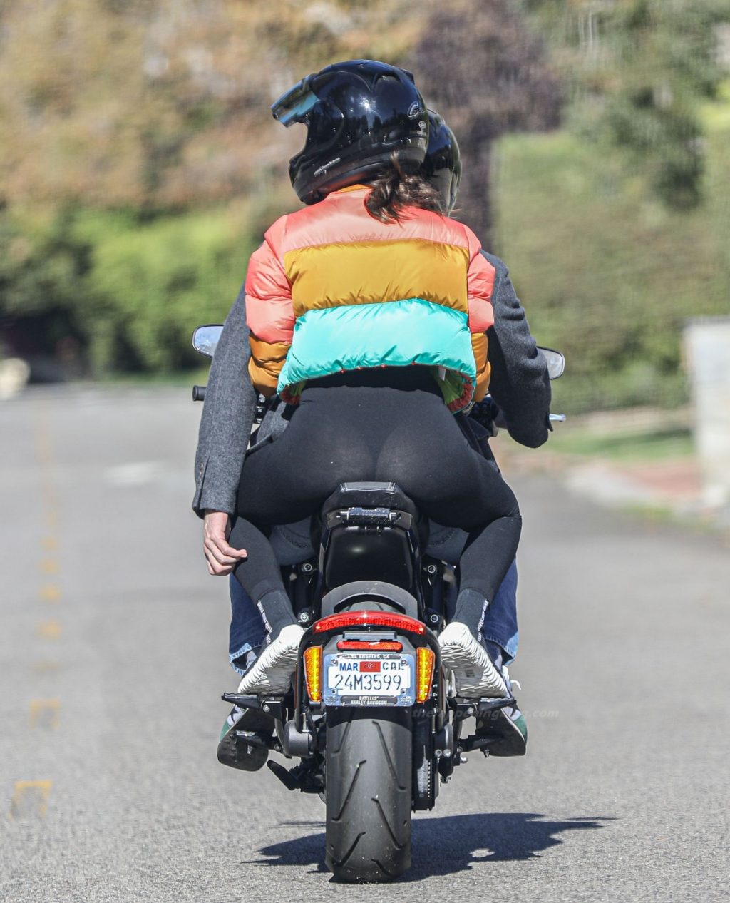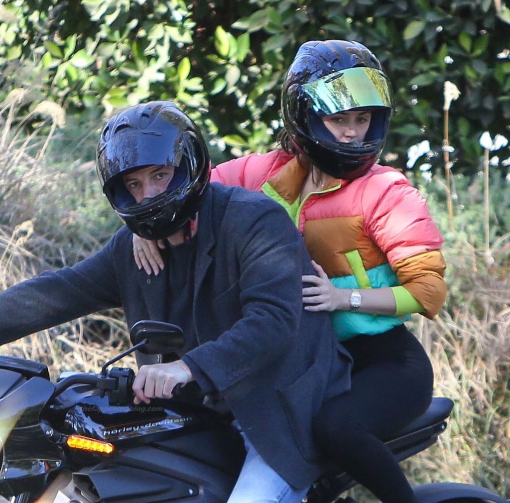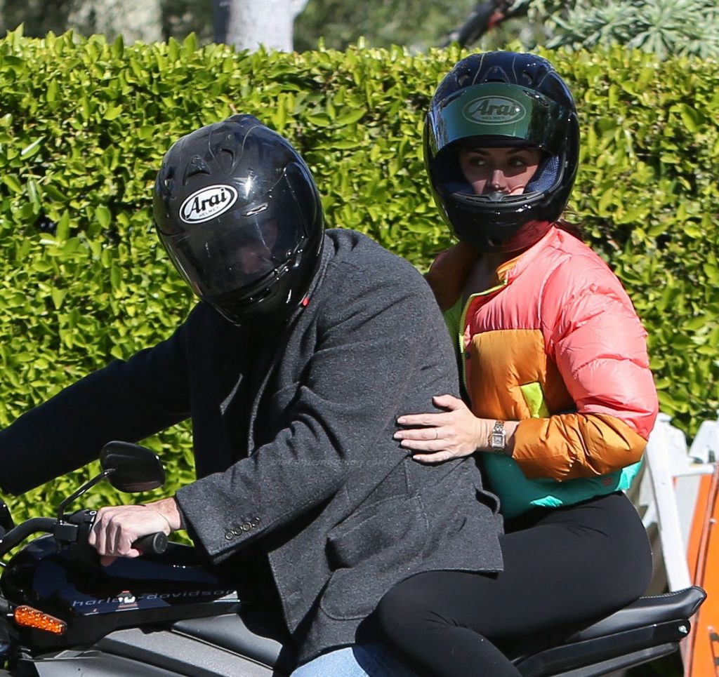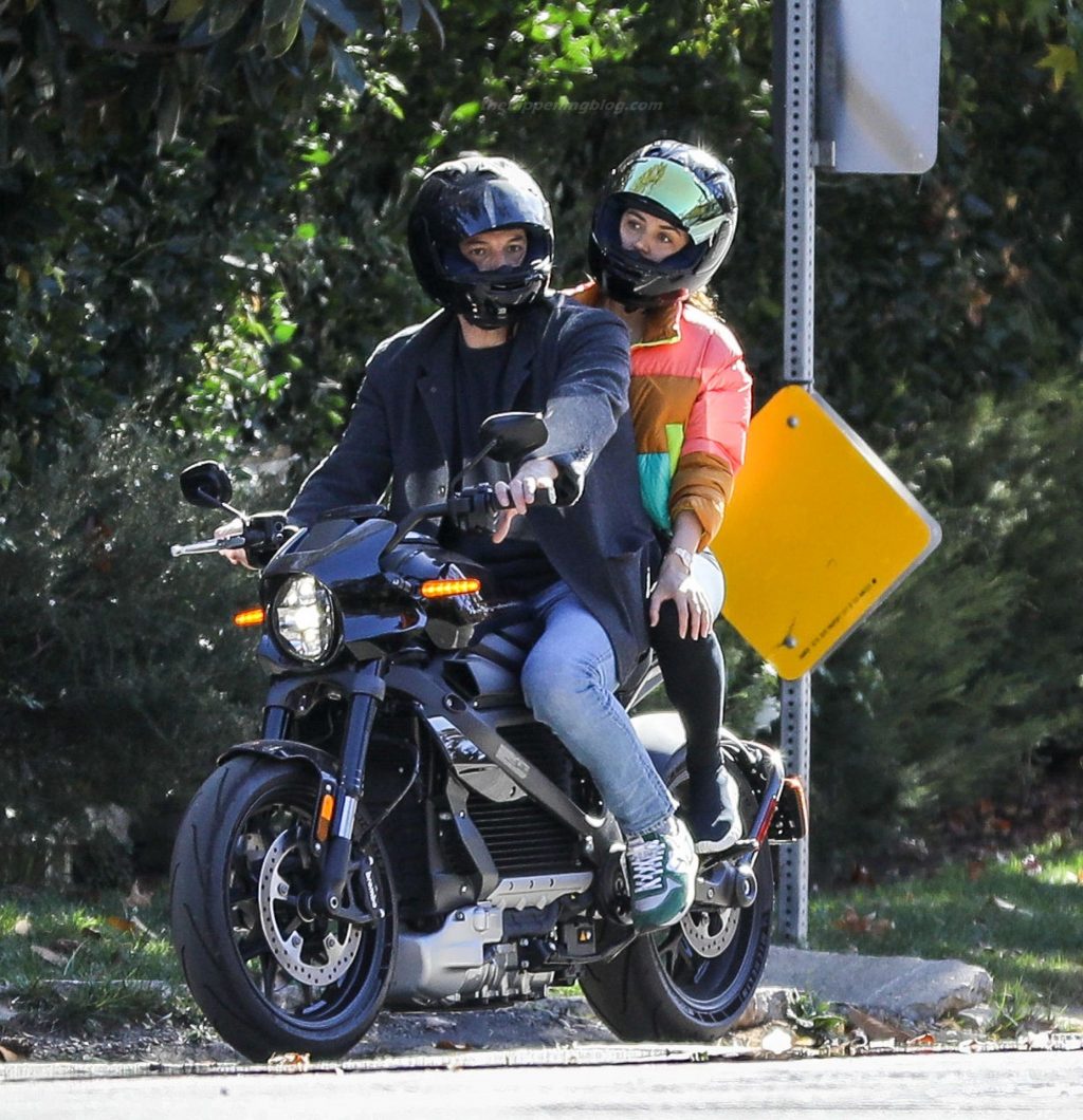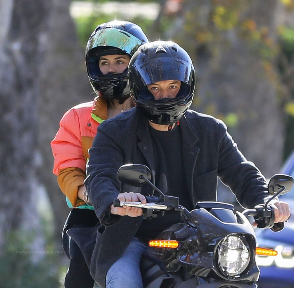 “Batman” estrela Ben Affleck é visto dirigindo uma Harley Davidson LiveWire elétrica com sua namorada, a atriz cubana Ana de Armas atrás dele e seguindo seu filho Samuel de bicicleta em Brentwood, 27/11/2020.
