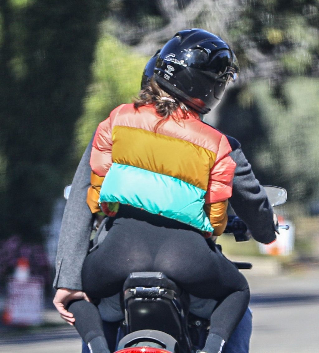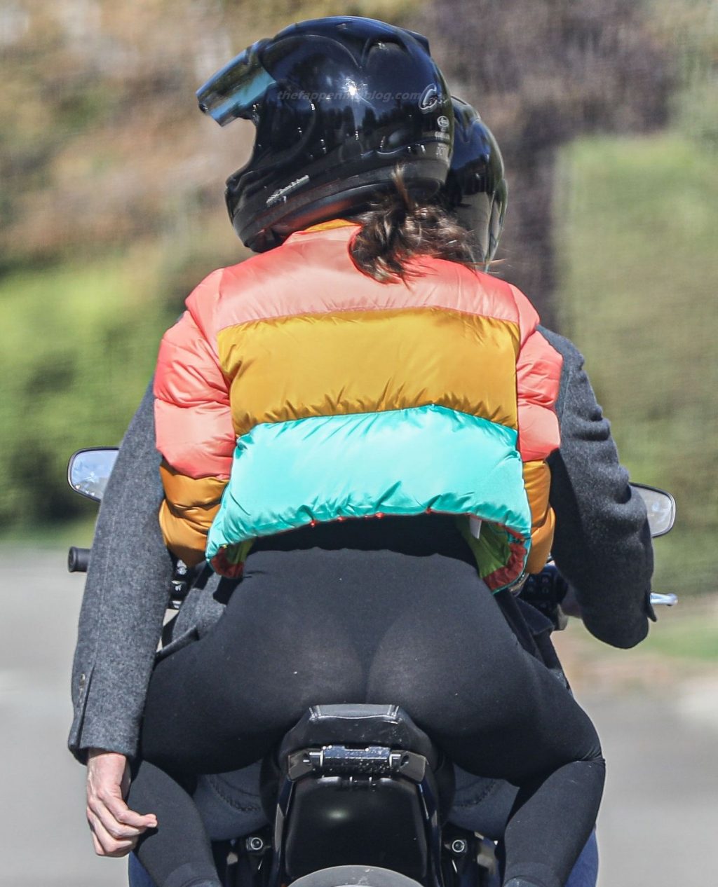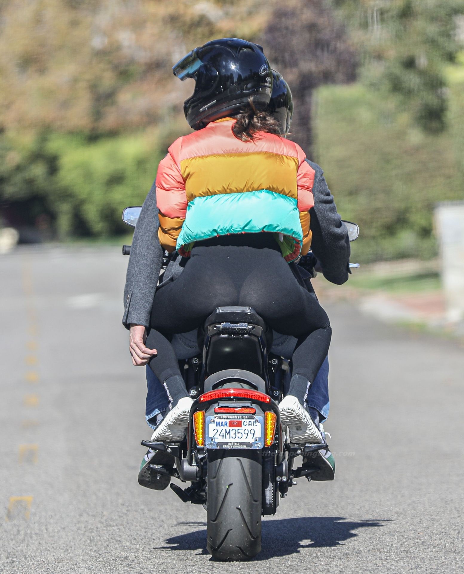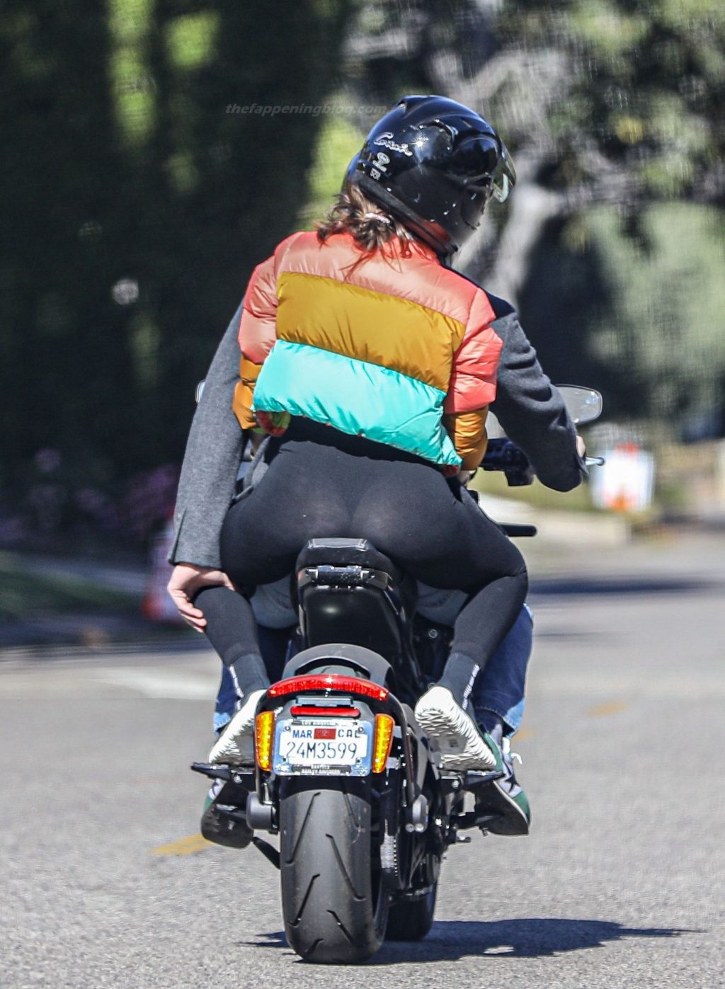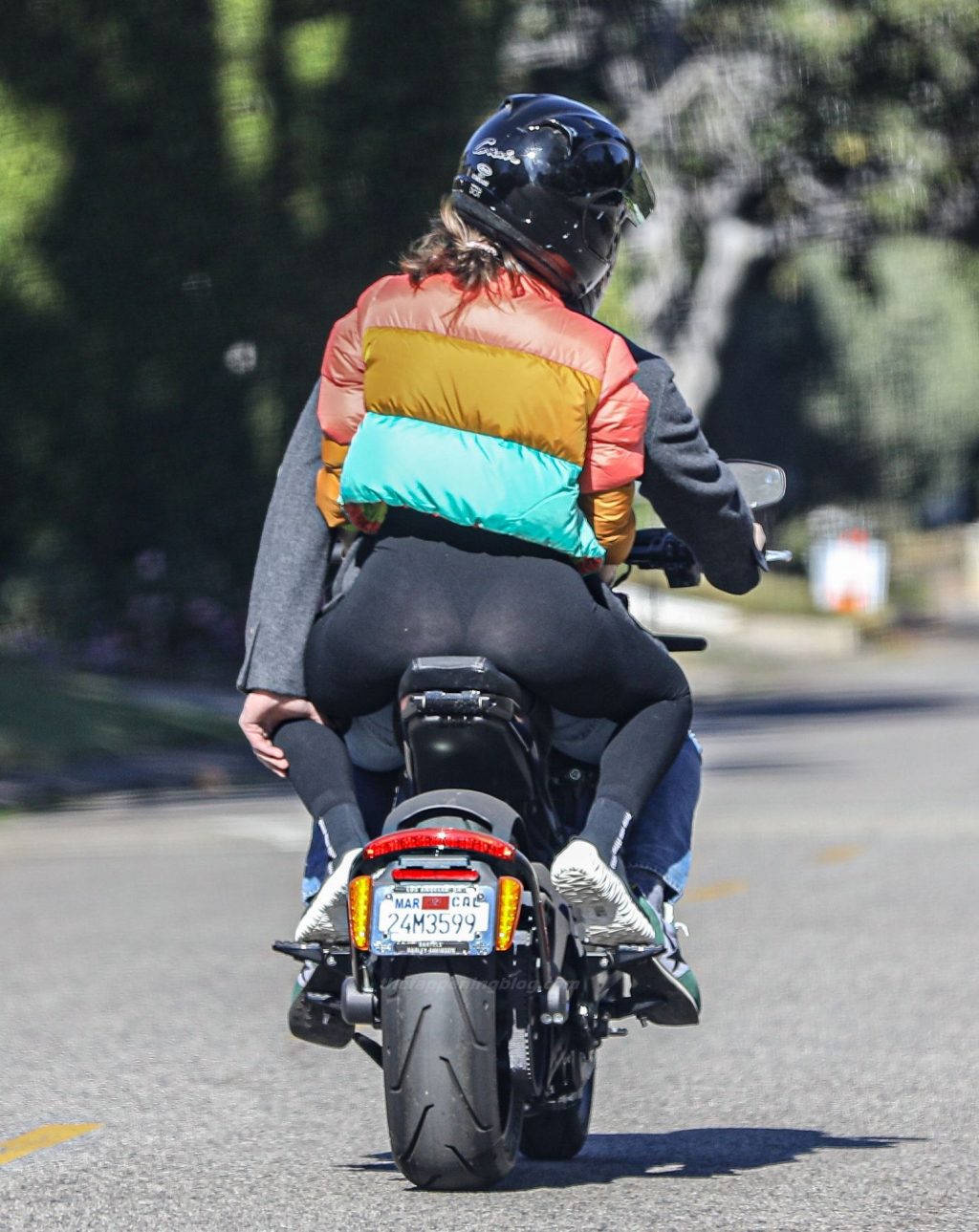 “Batman” estrela Ben Affleck é visto dirigindo uma Harley Davidson LiveWire elétrica com sua namorada, a atriz cubana Ana de Armas atrás dele e seguindo seu filho Samuel de bicicleta em Brentwood, 27/11/2020.