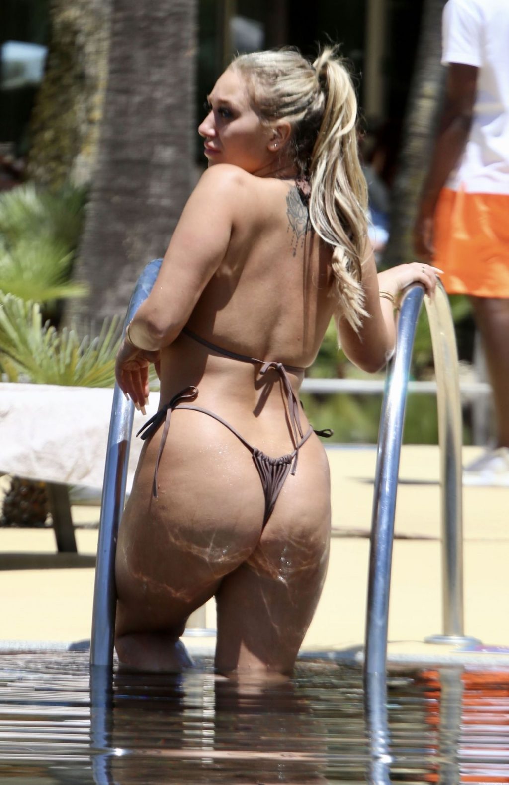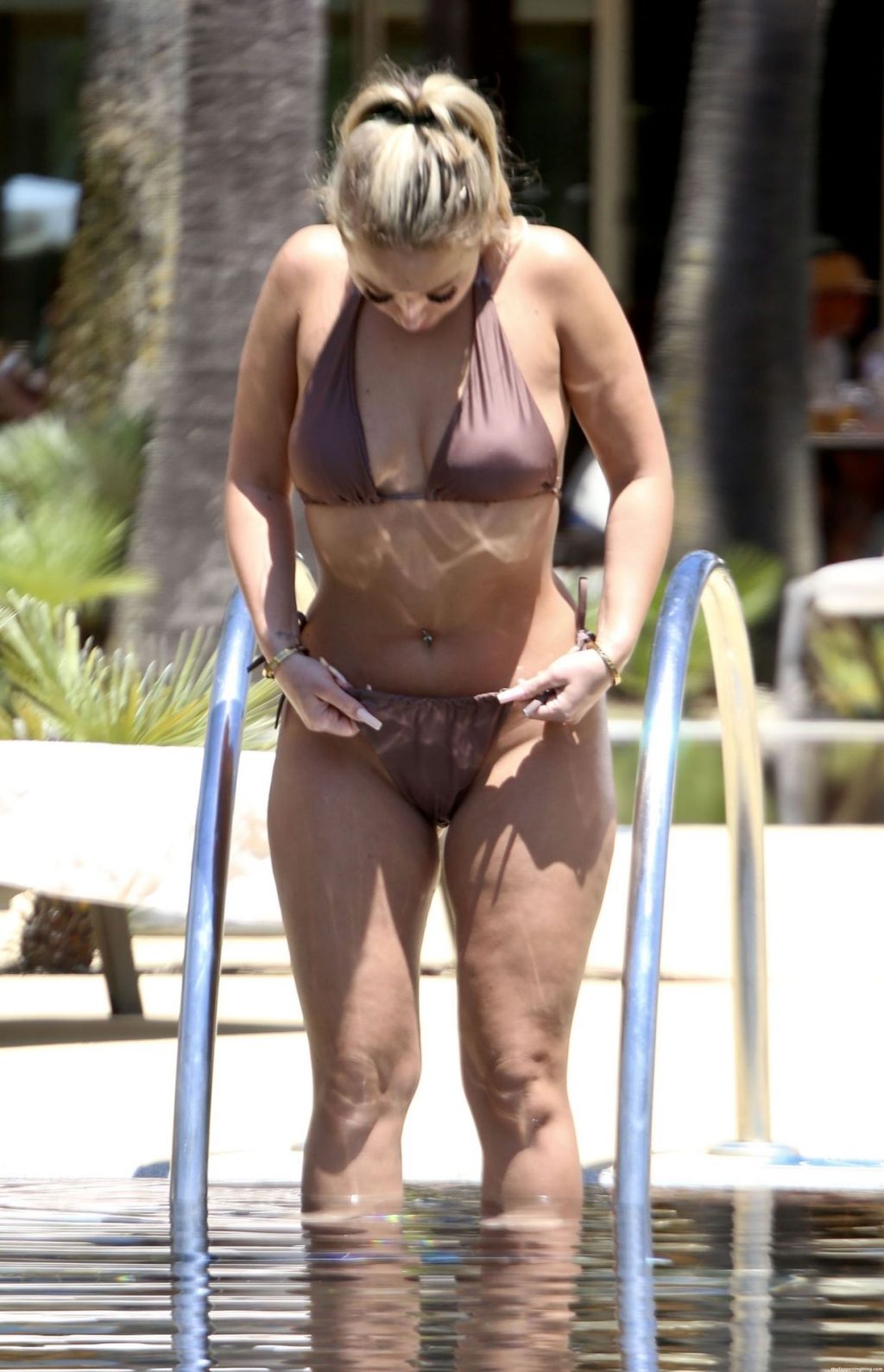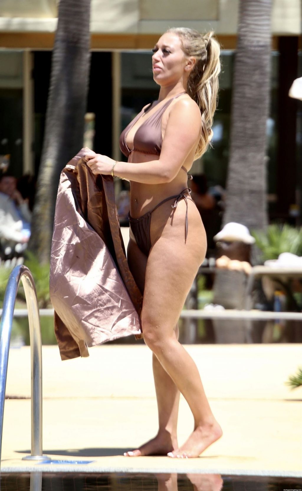 Bethan estava deslumbrante usando seu biquíni marrom à beira da piscina enquanto aproveitava o calor escaldante durante suas férias em Portugal (maio de 2021).