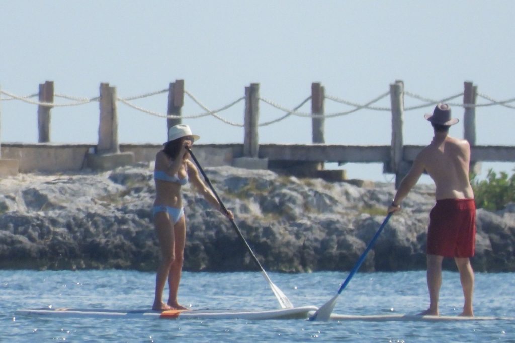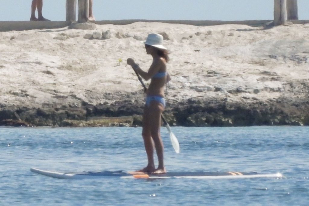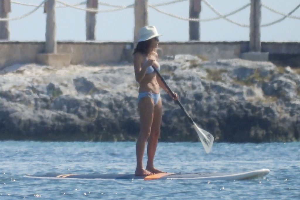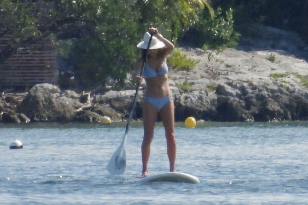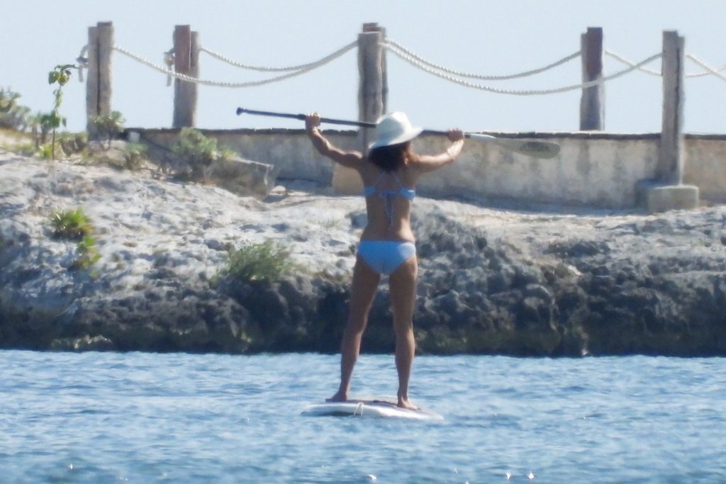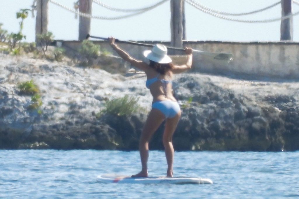 Bethenny Frankel termina 2019 com um treino de stand up paddle em Cancun, 01/01/2020. A estrela de reality show e empresária exibiu seu físico em forma com um biquíni azul claro enquanto aproveitava as férias com o parceiro Paul Bernon e a filha Bryn Hoppy.