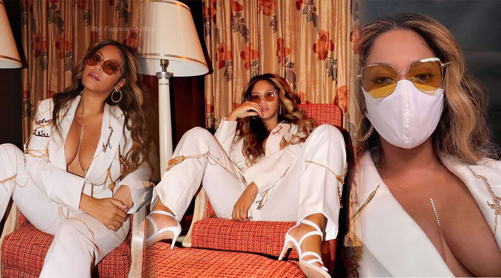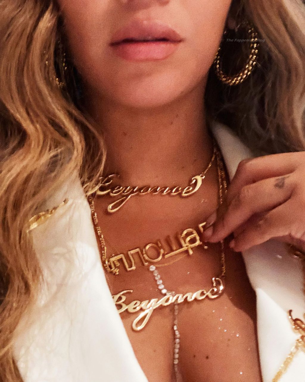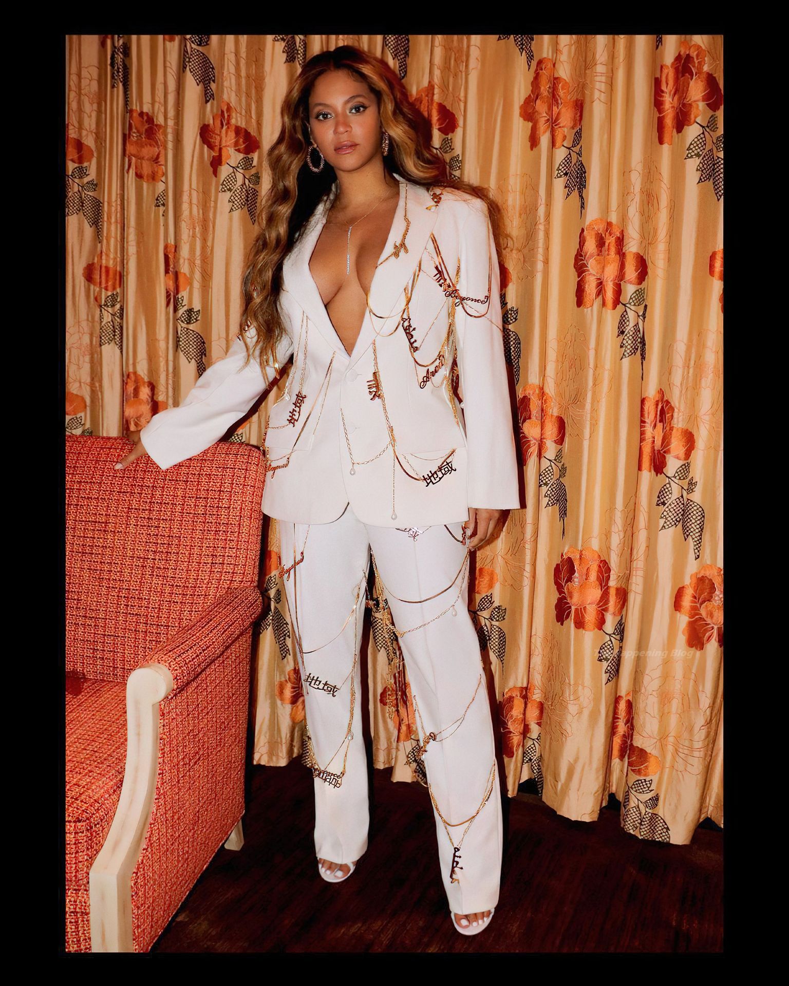 A cantora Beyoncé exibe seu belo decote e joias, posando sem sutiã em um terno branco em uma nova sessão de fotos nas redes sociais (abril de 2021).