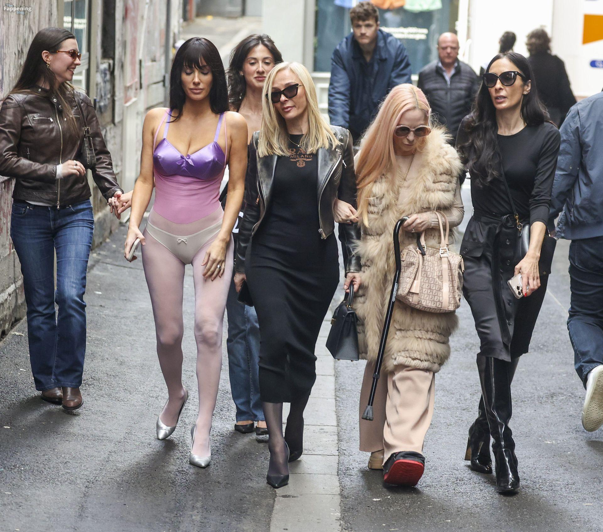 Bianca Censori foi vista em Melbourne, Austrália, em uma viagem de compras em família, vestindo um body roxo transparente que destacava suas curvas. Ela combinou com um sutiã metálico roxo e uma calcinha branca, caminhando com sua mãe Alexandra, irmã Angelina e alguns parentes. Eles passaram na Mecca para uma compra de produtos de beleza e passearam pelas ruelas do CBD, parecendo relaxados apesar da chuva.