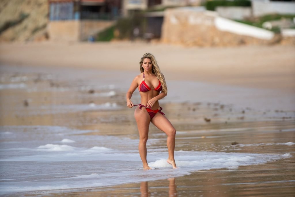 Bianca Gascoigne (32) é fotografada exibindo suas habilidades com a bola em um biquíni vermelho em Portugal (novembro de 2018). Isso acontece após o pai da estrela de reality show ter sido recentemente acusado de agressão sexual em um trem. Bianca esteve recentemente em um bootcamp em Portugal e os resultados podem ser claramente vistos.
