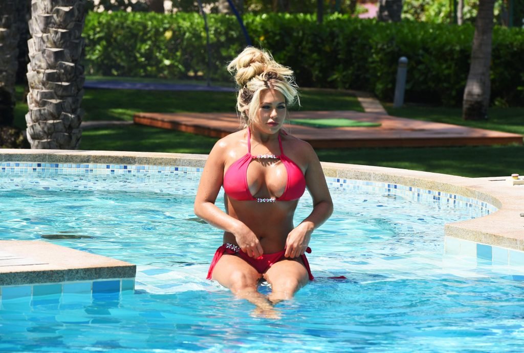 A loira voluptuosa Bianca Gascoigne aproveita suas férias com um biquíni vermelho à beira da piscina no hotel em Dubai, 20/04/2018. Bianca Gascoigne é uma modelo glamour, estrela do Celebrity Big Brother de Hertfordshire, Inglaterra. Idade – 31 anos.