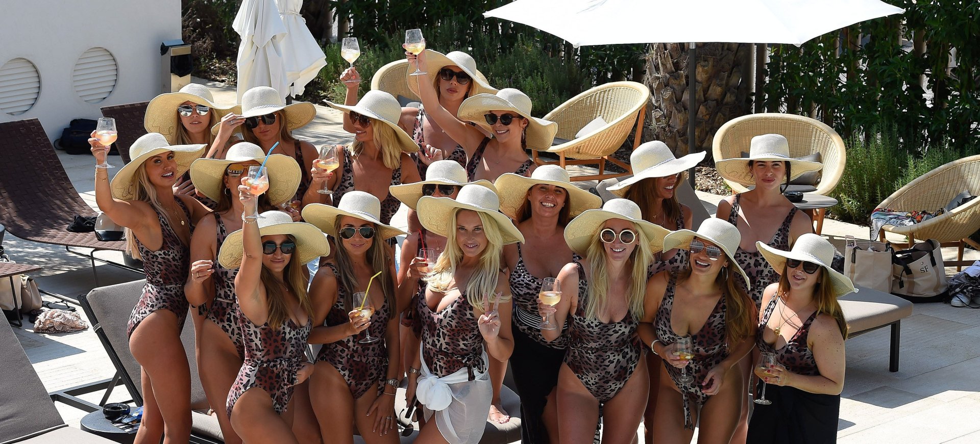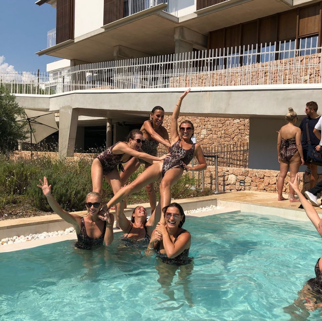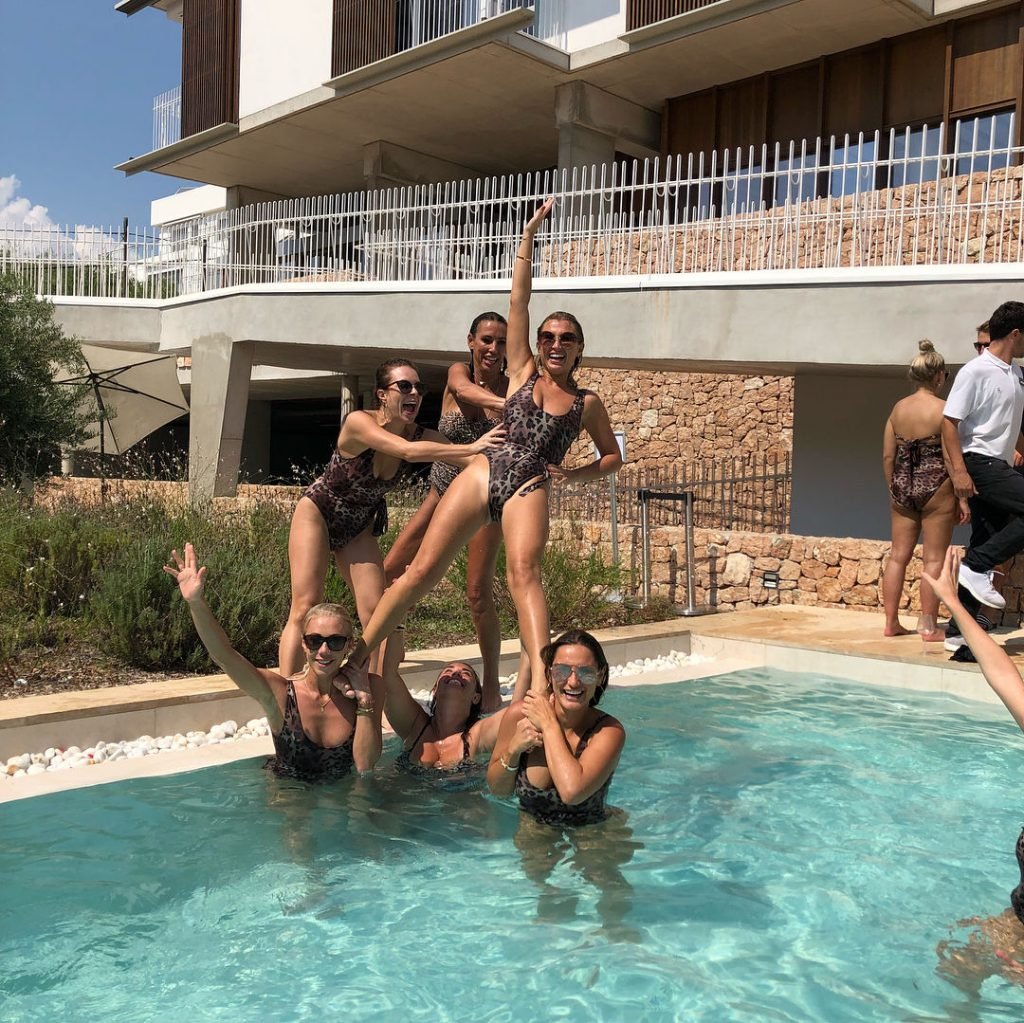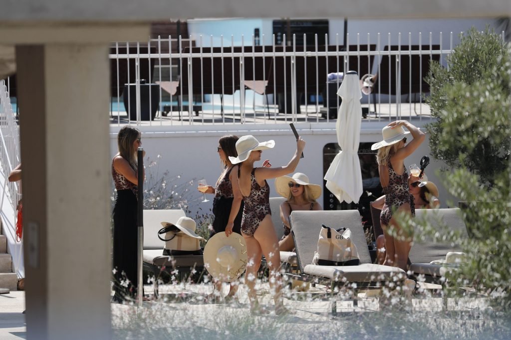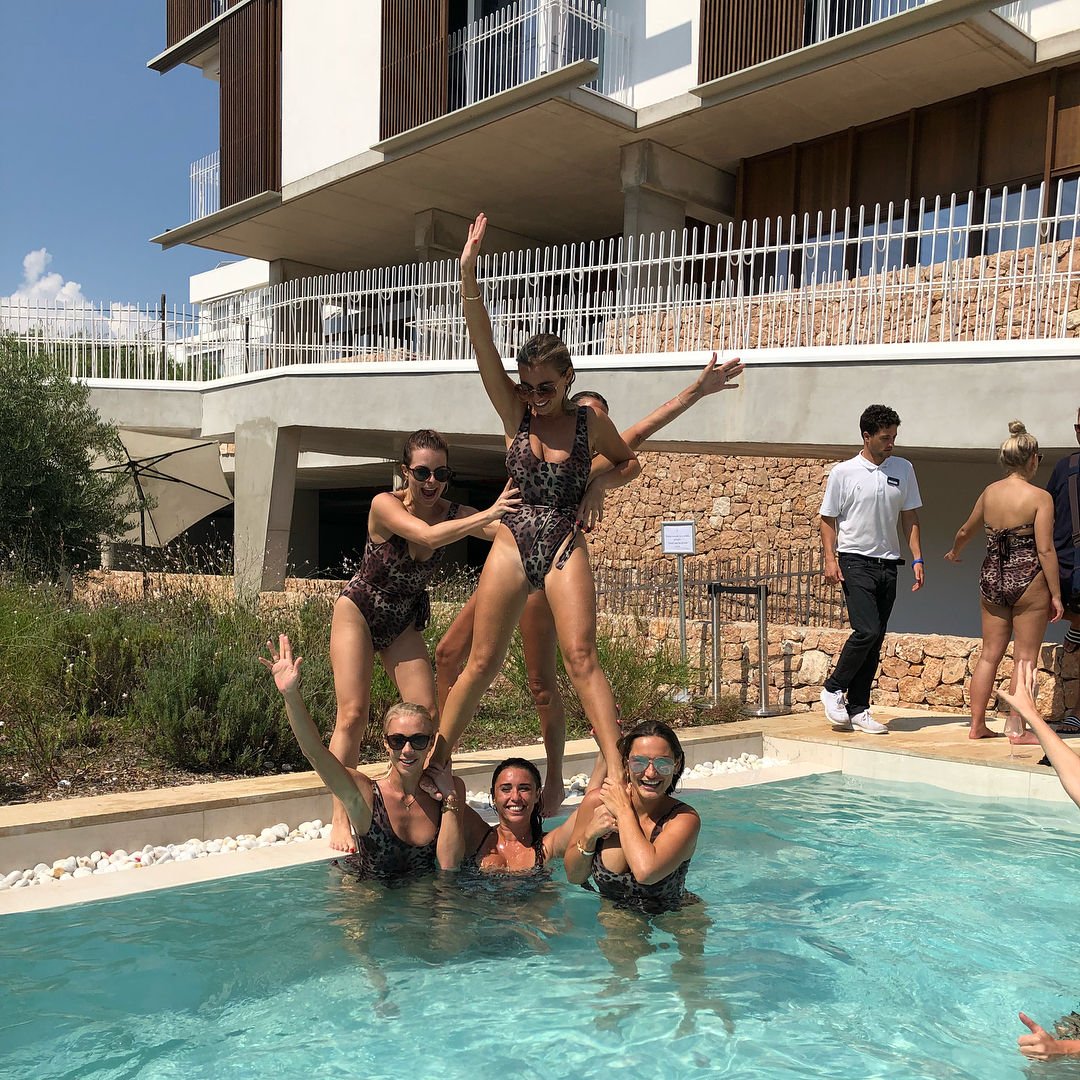 Billie Faiers é vista em Ibiza em sua despedida de solteira, onde todos os seus convidados estavam vestidos com maiôs de uma peça estampados de onça, 23/08/2018. Os convidados incluíam as estrelas do TOWIE Sam Faiers, sua irmã, e Ferne McCann.