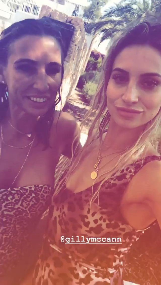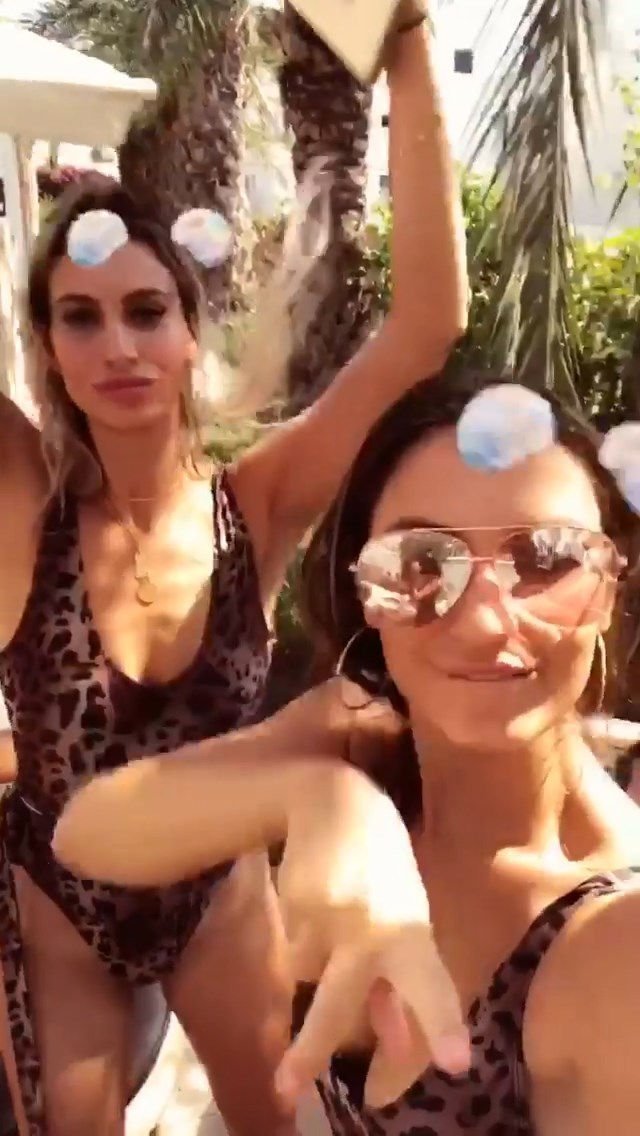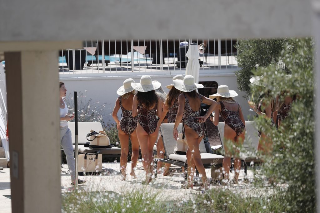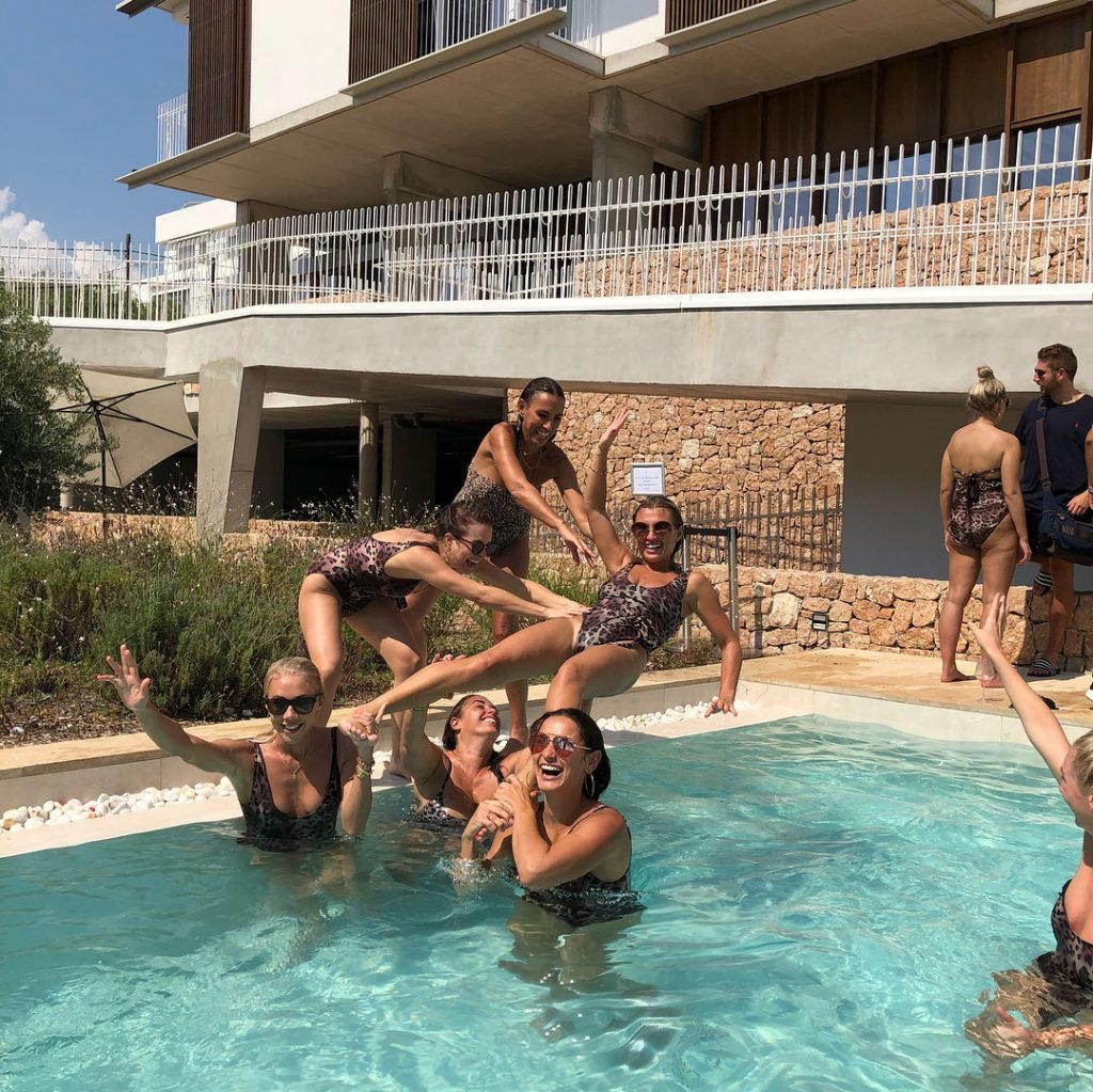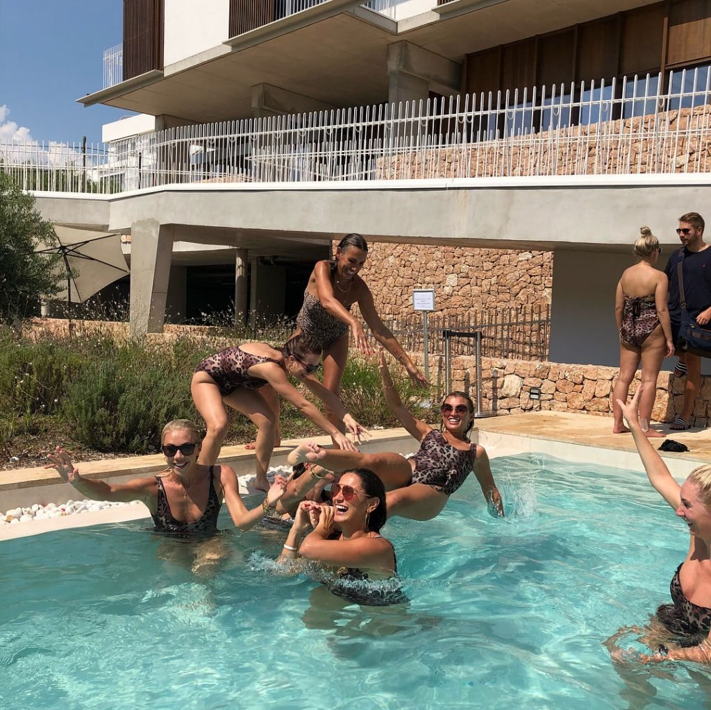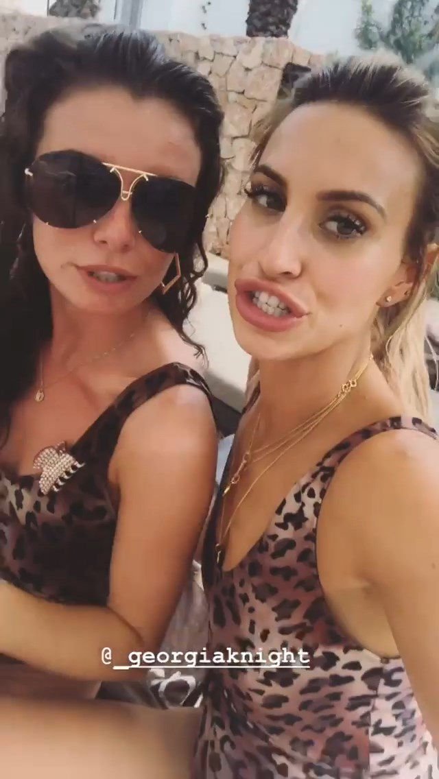 Billie Faiers é vista em Ibiza em sua despedida de solteira, onde todos os seus convidados estavam vestidos com maiôs de uma peça estampados de onça, 23/08/2018. Os convidados incluíam as estrelas do TOWIE Sam Faiers, sua irmã, e Ferne McCann.