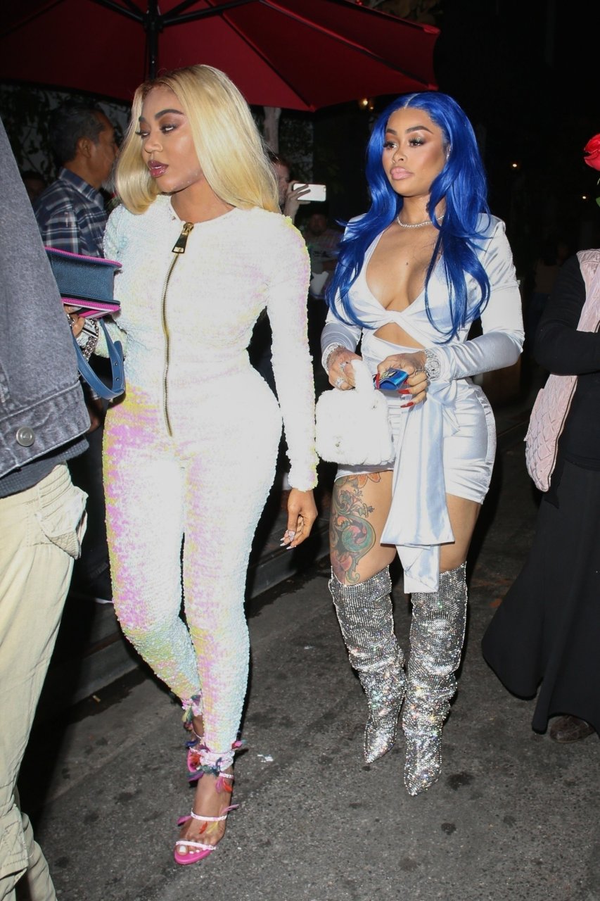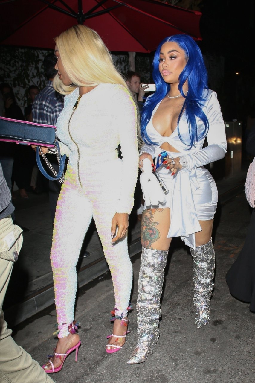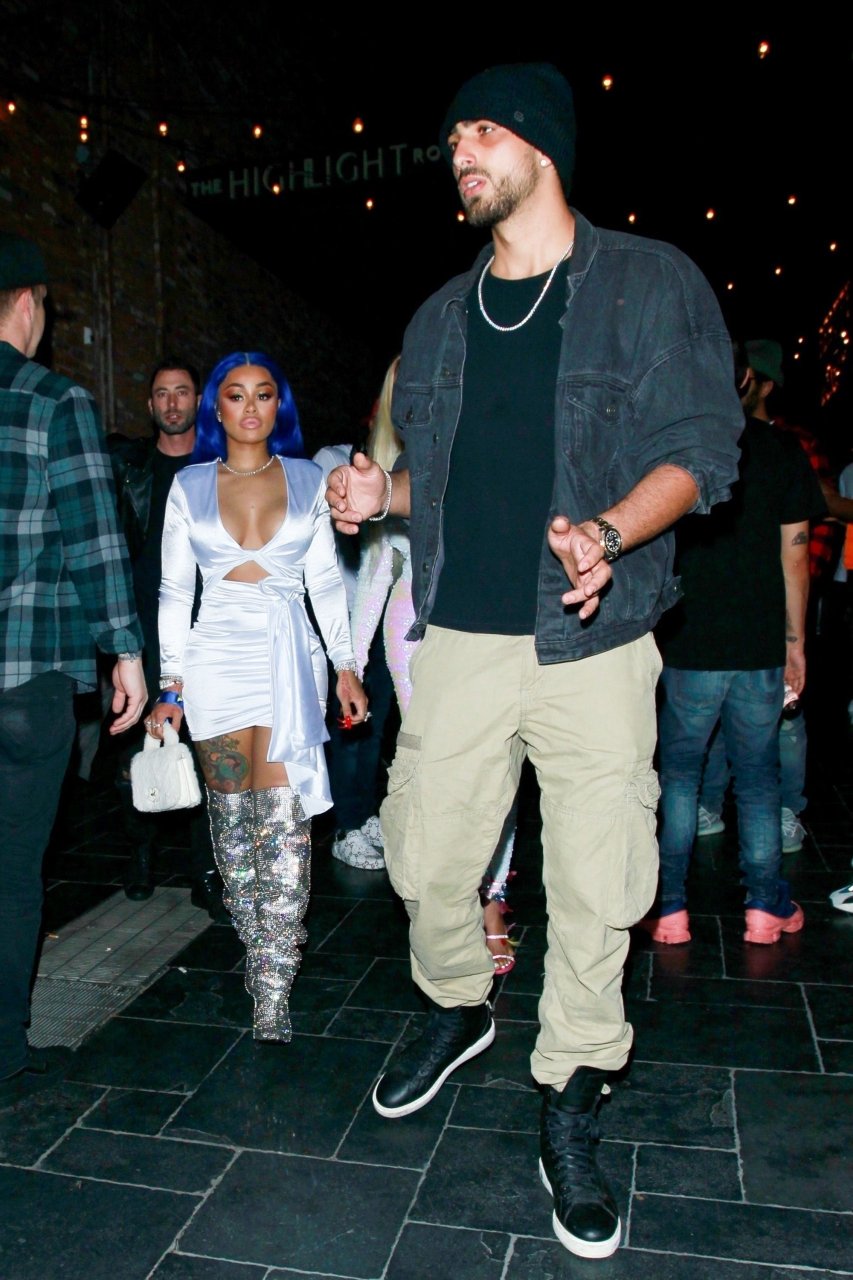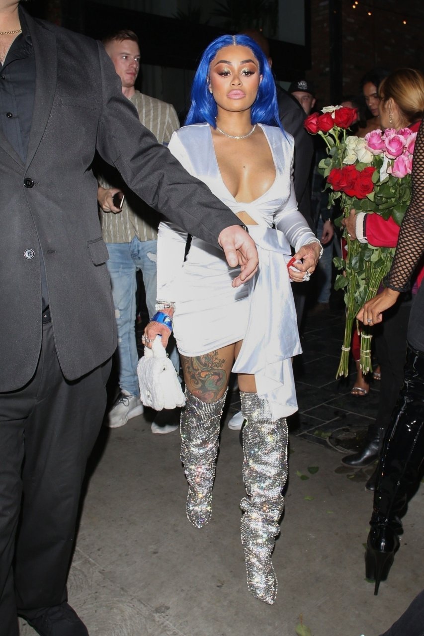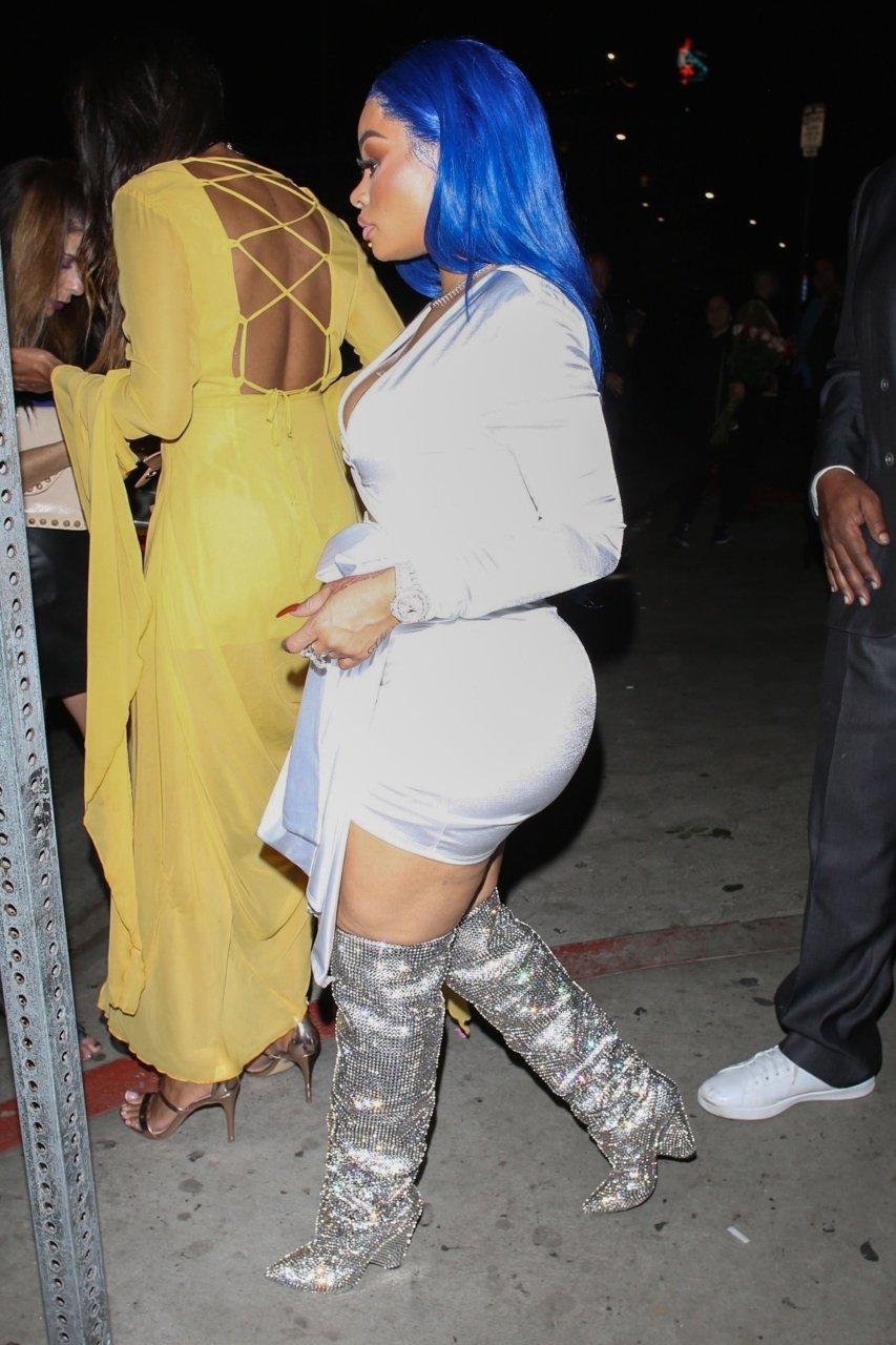 Blac Chyna exibe seu cabelo azul para uma noite na cidade. Ela é difícil de passar despercebida com um body brilhante e botas enquanto segue para o ponto quente de Hollywood com um homem misterioso. A modelo de 30 anos mostra suas curvas ao entrar em um Rolls Royce rosa com o homem misterioso sentado no banco da frente.