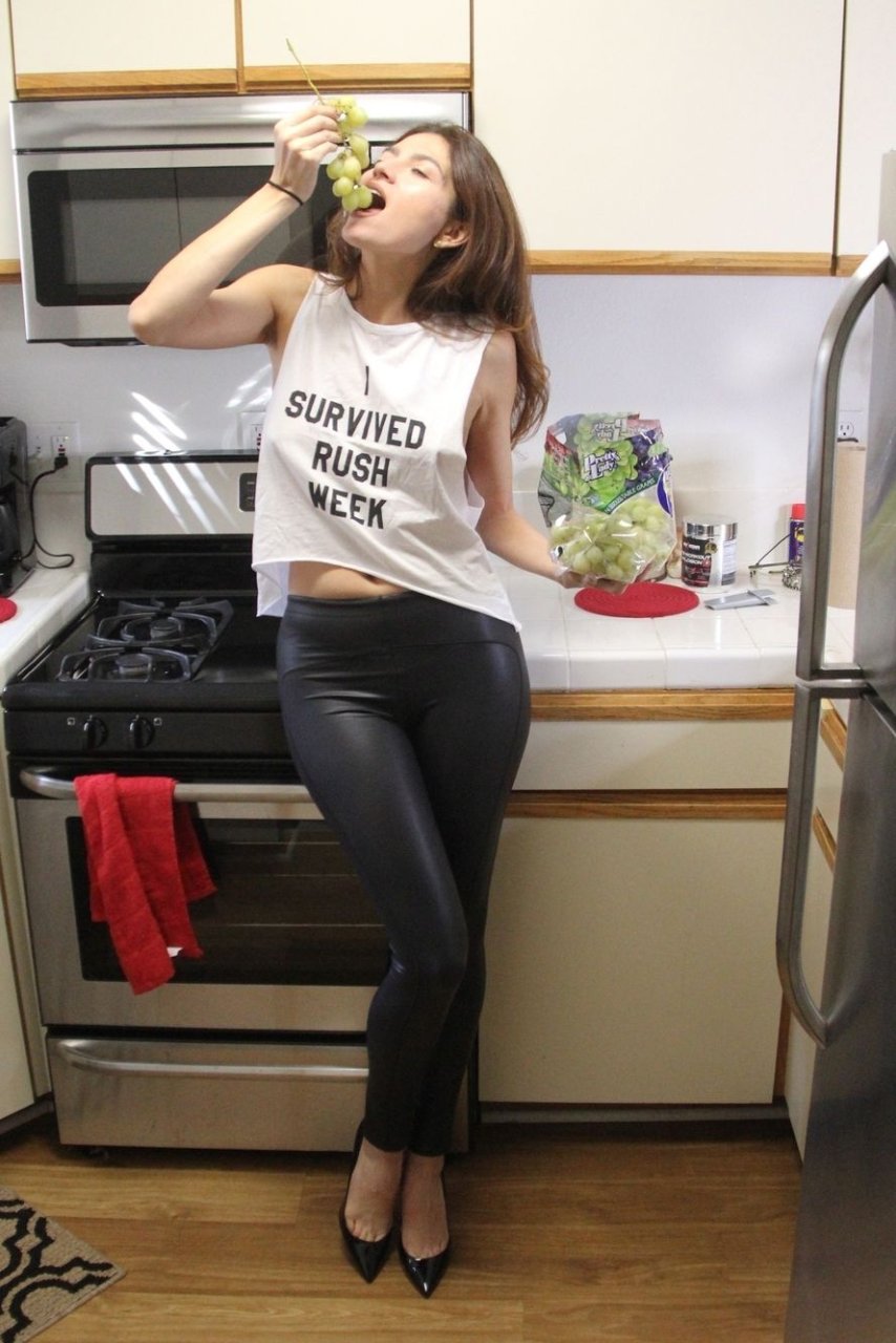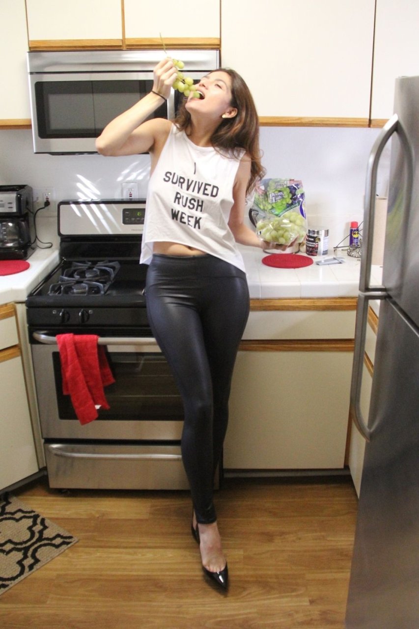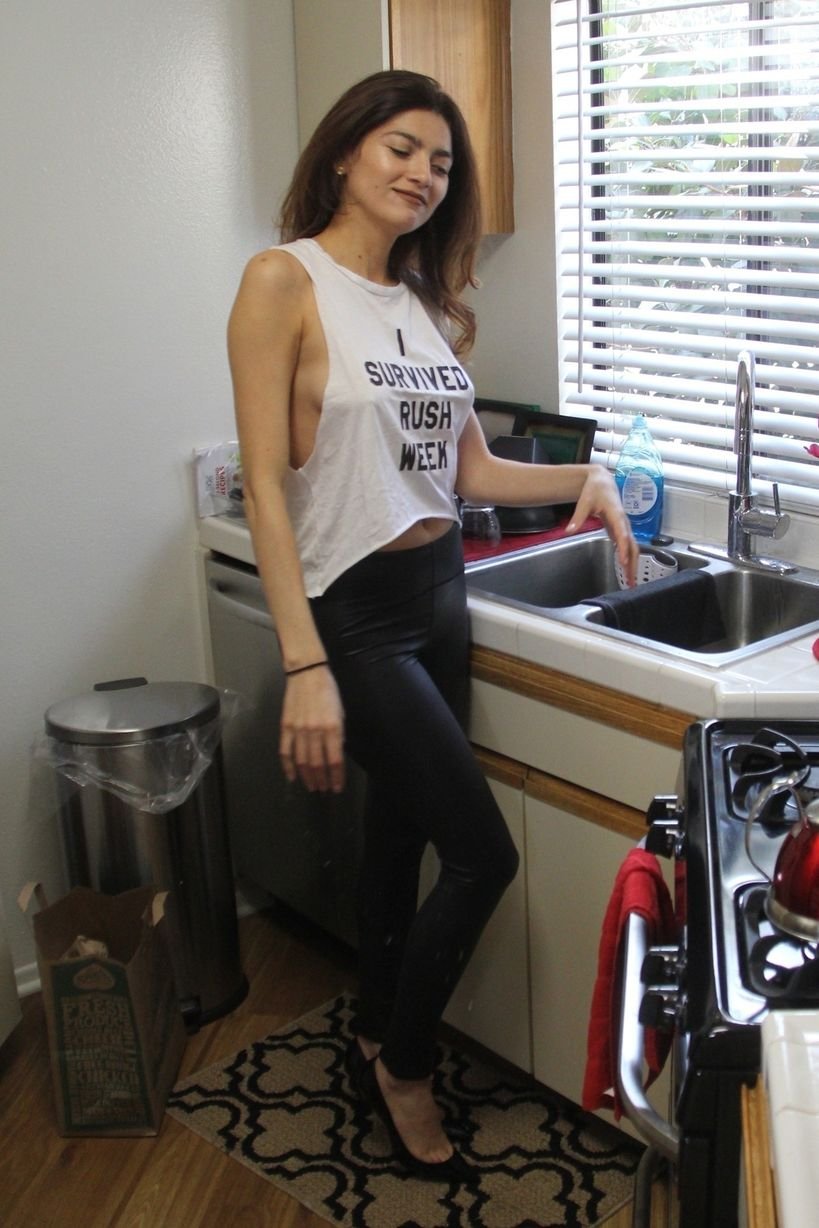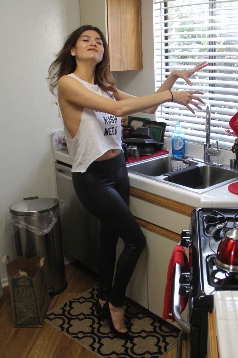 Blanca Blanco exibe um visual sem sutiã enquanto está em casa em Los Angeles, 11/01/2019. A atriz de 37 anos parece relaxada enquanto arruma seu apartamento usando uma regata sem mangas “Eu Sobrevivi à Semana de Rush”, sem sutiã, leggings de couro preto e scarpins pretos.