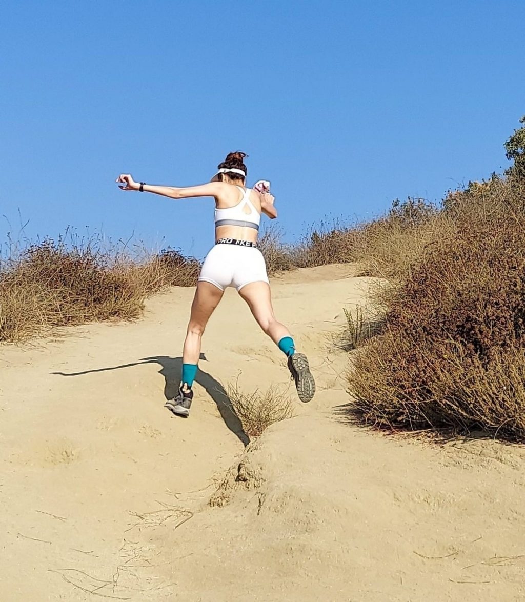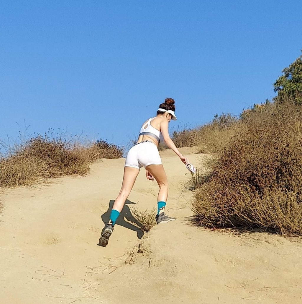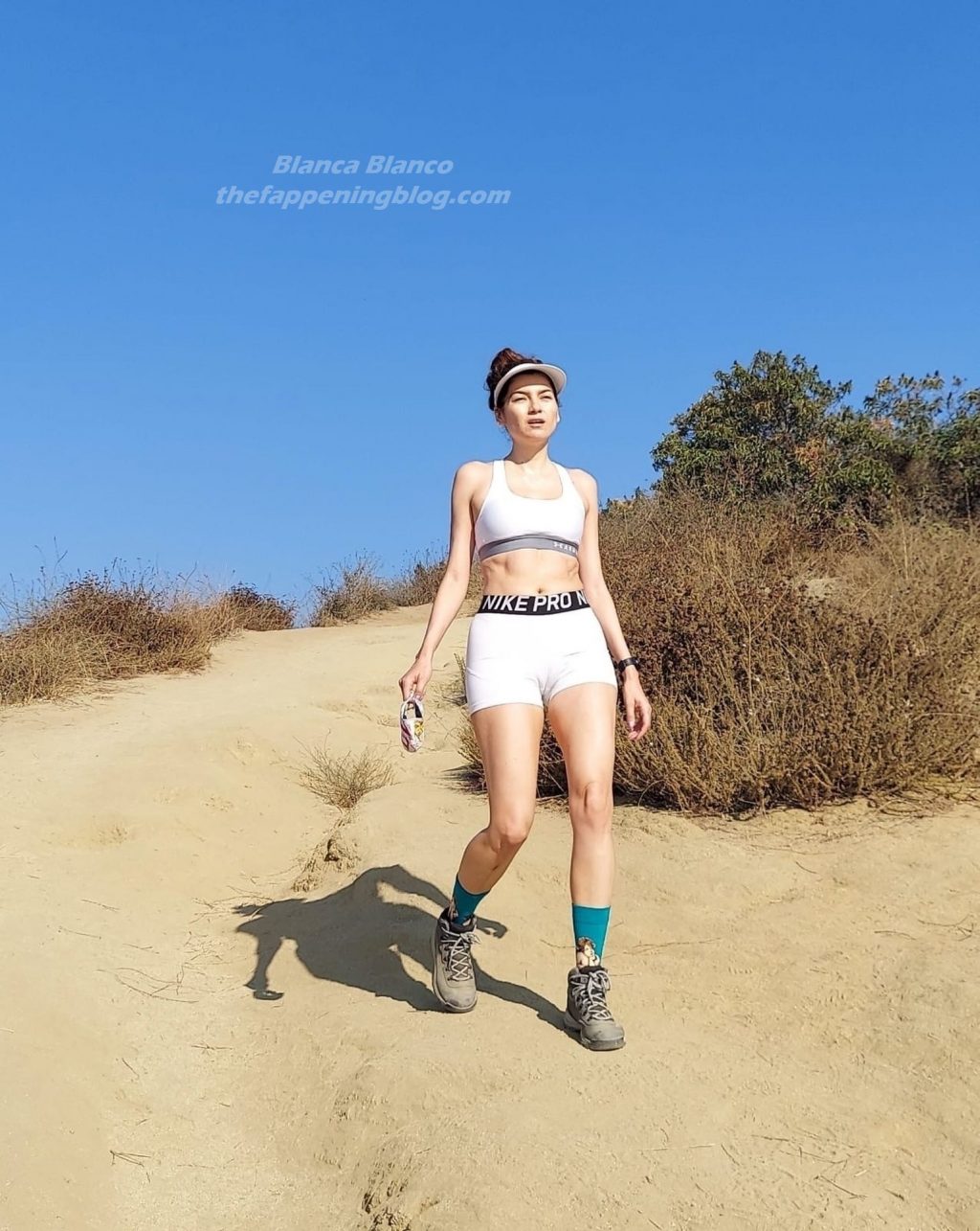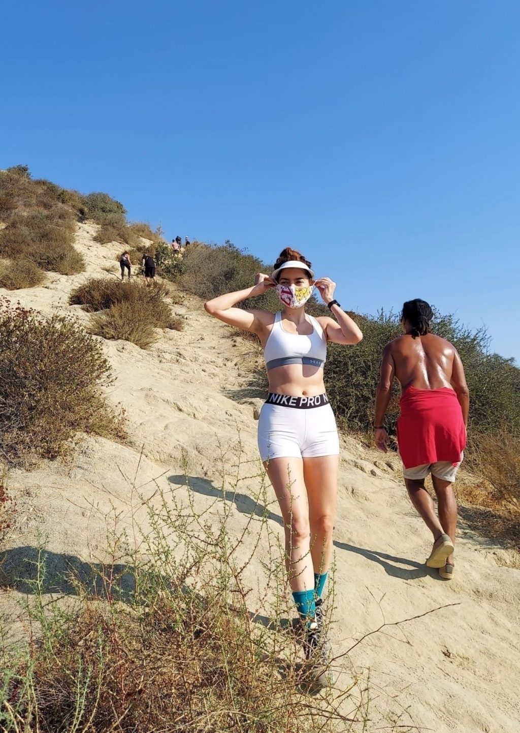Atriz Blanca Blanco faz caminhada nas Colinas de Hollywood vestindo conjunto athleisure da Nike, 25/09/2020.