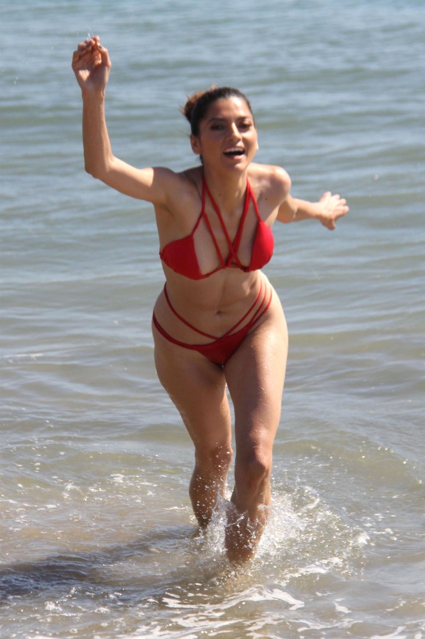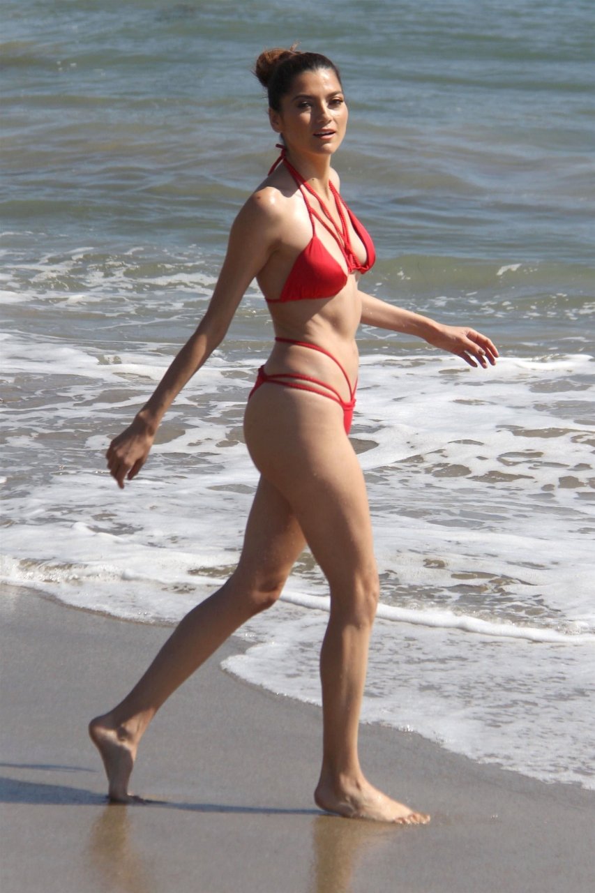 Atriz Blanca Blanco (37) aproveita um dia na praia antes das temperaturas de inverno chegarem em Malibu, 17/10/2018. Blanca exibiu seu corpo sexy e tonificado em um biquíni vermelho minúsculo.