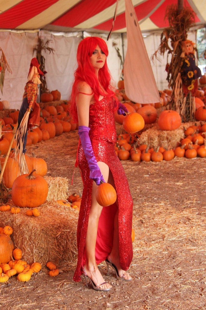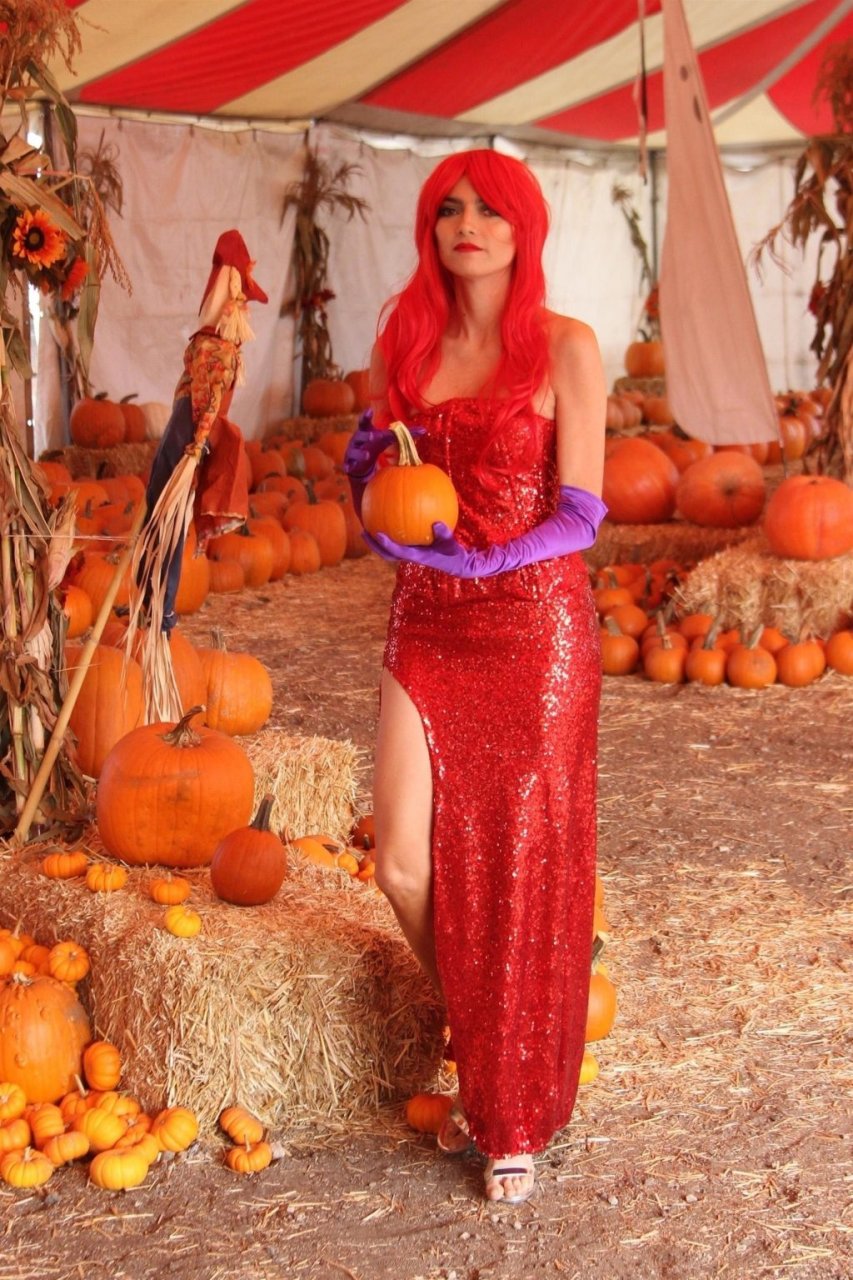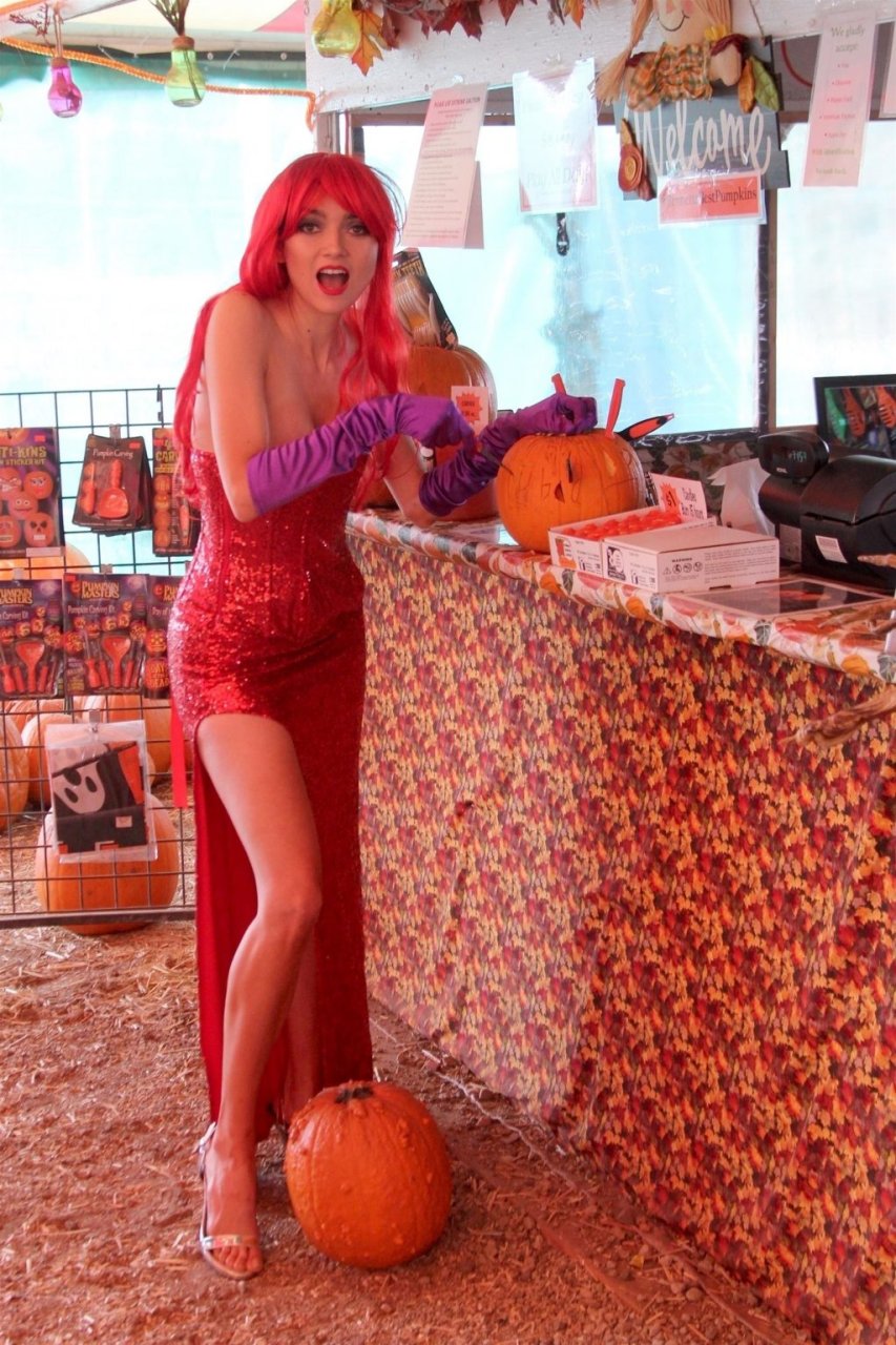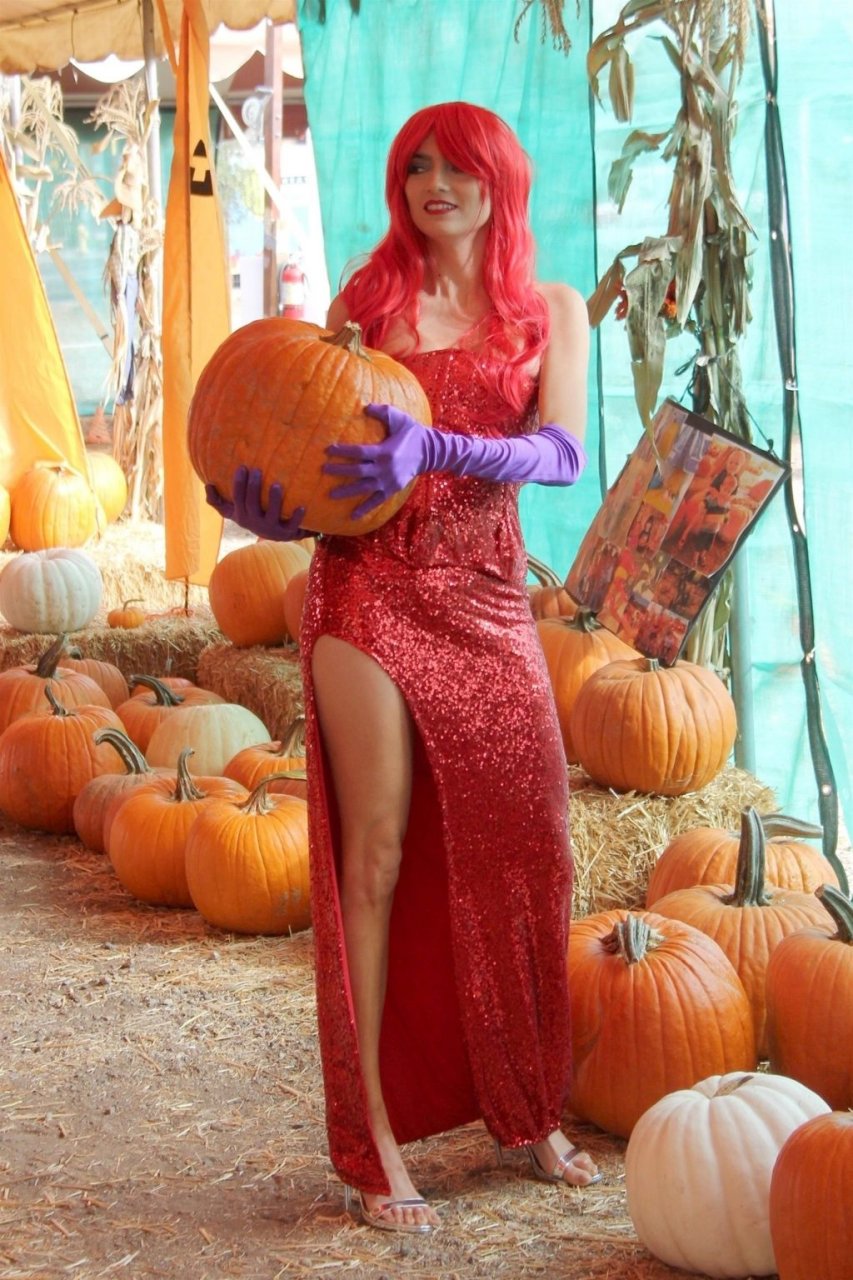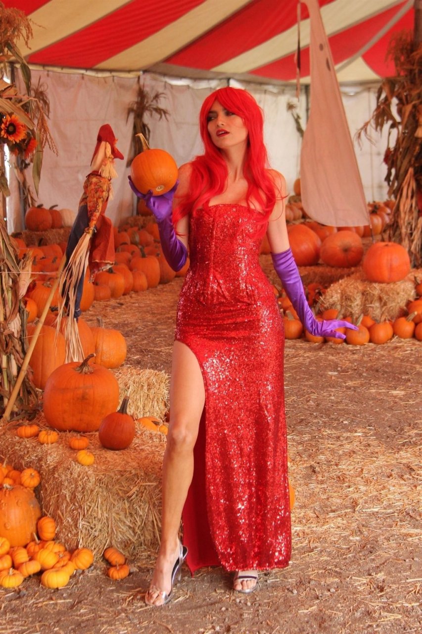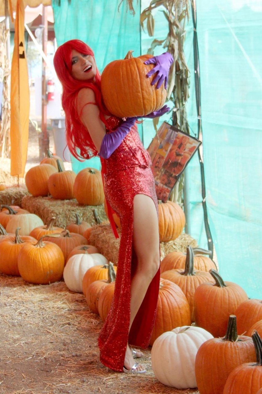 Atriz Blanca Blanco adota um visual sexy ao visitar uma plantação de abóboras em Los Angeles como Jessica Rabbit, usando um vestido longo vermelho e cabelo vermelho combinando, em 22/10/2018. Blanca passa o tempo escolhendo uma abóbora e aproveitando um momento no escorregador inflável.