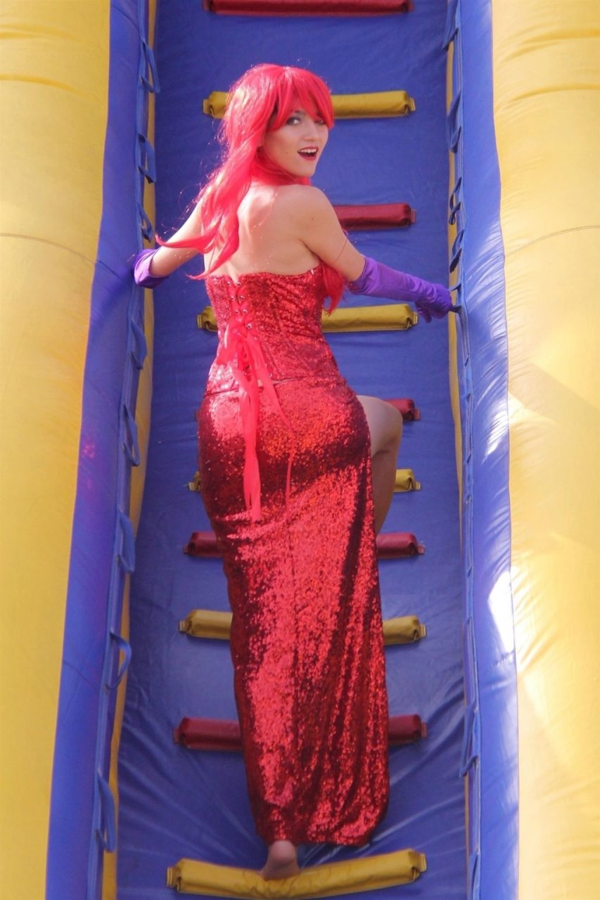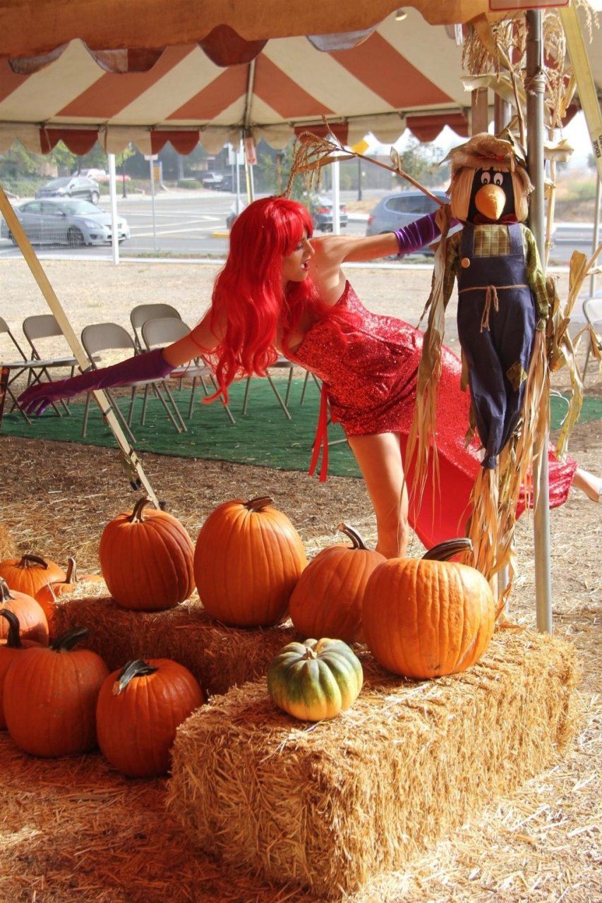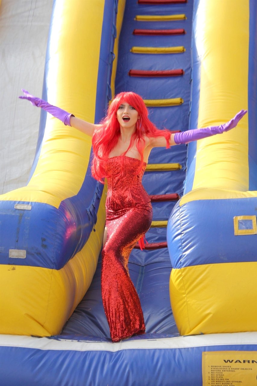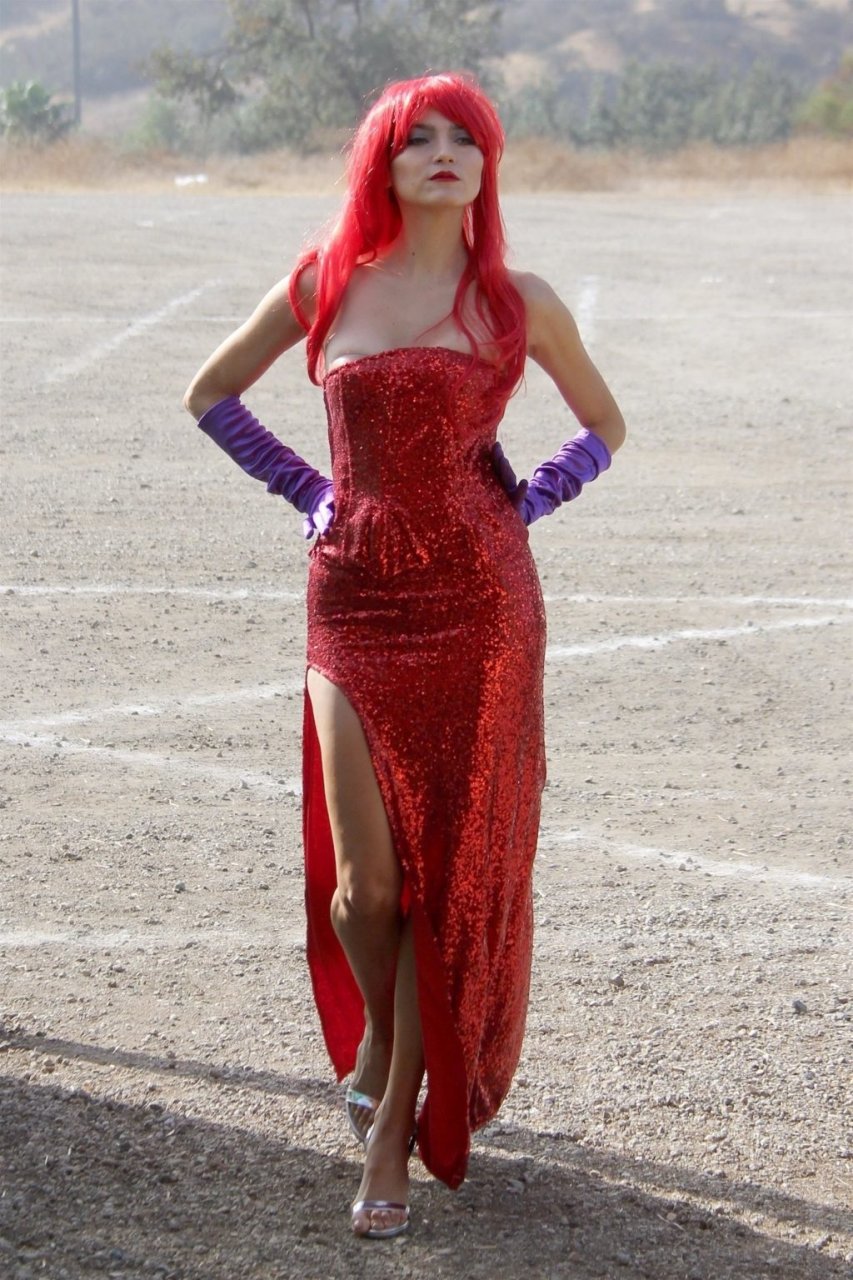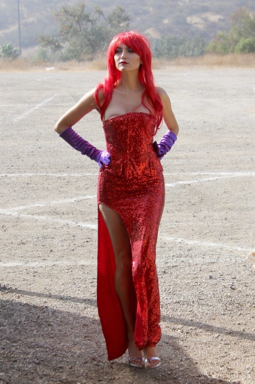 Atriz Blanca Blanco adota um visual sexy ao visitar uma plantação de abóboras em Los Angeles como Jessica Rabbit, usando um vestido longo vermelho e cabelo vermelho combinando, em 22/10/2018. Blanca passa o tempo escolhendo uma abóbora e aproveitando um momento no escorregador inflável.