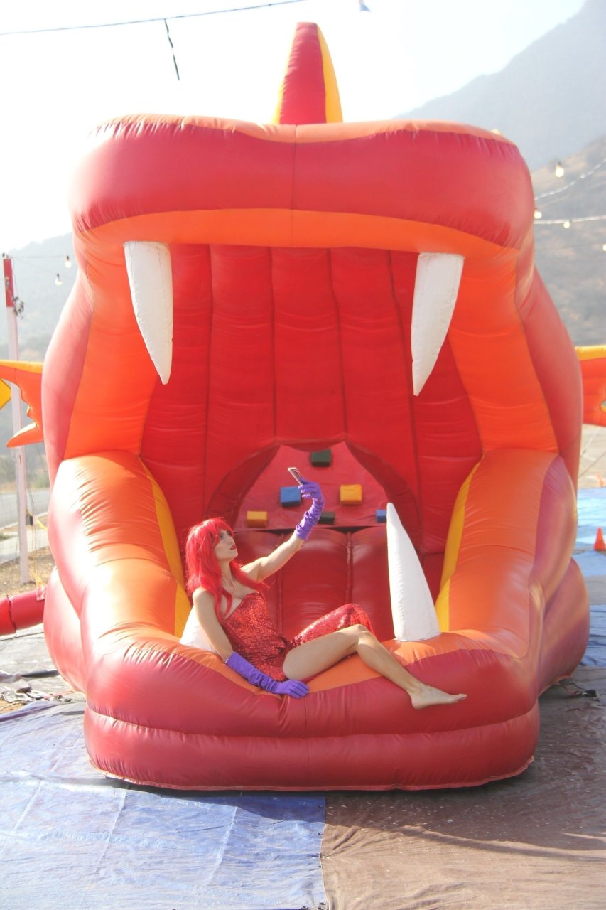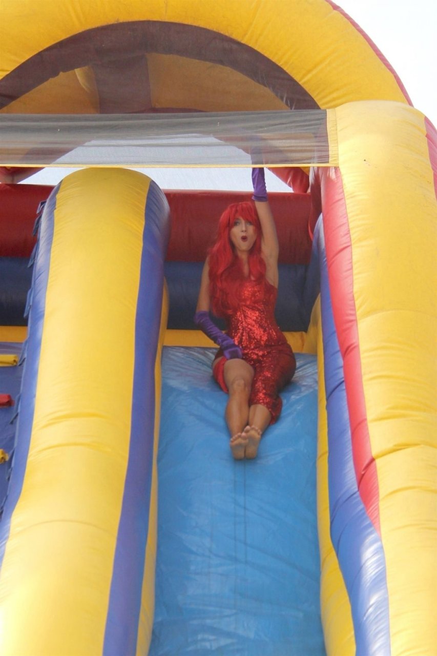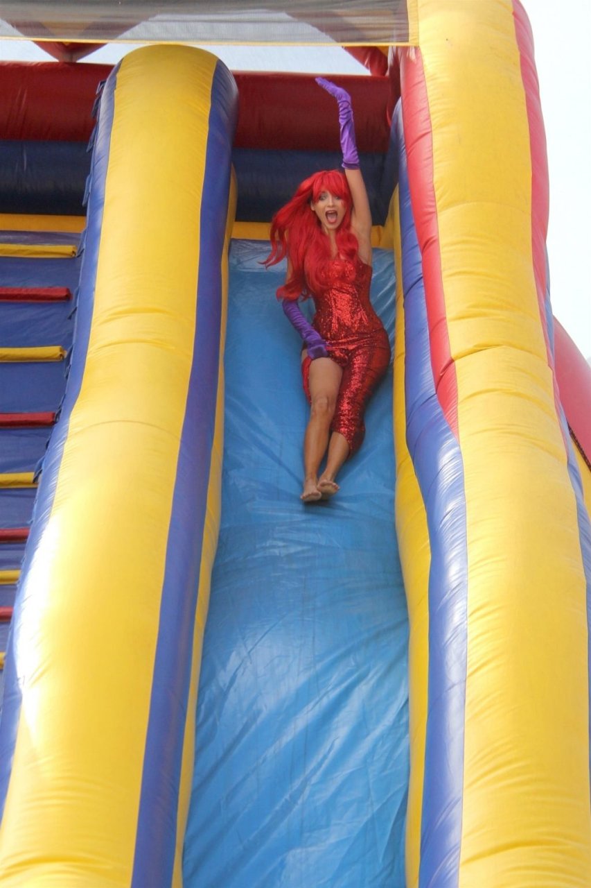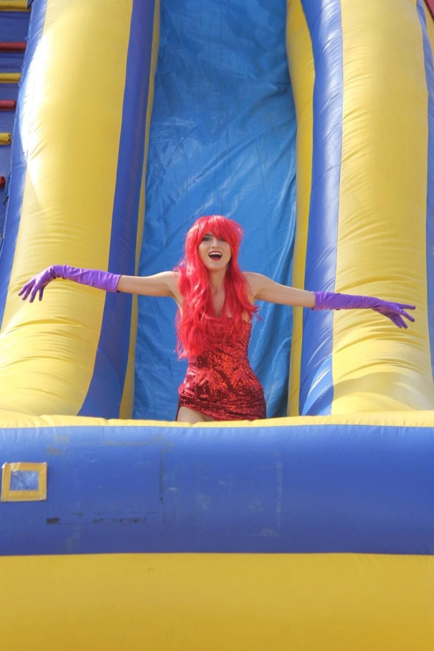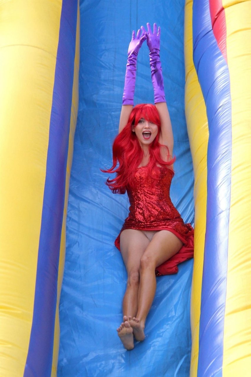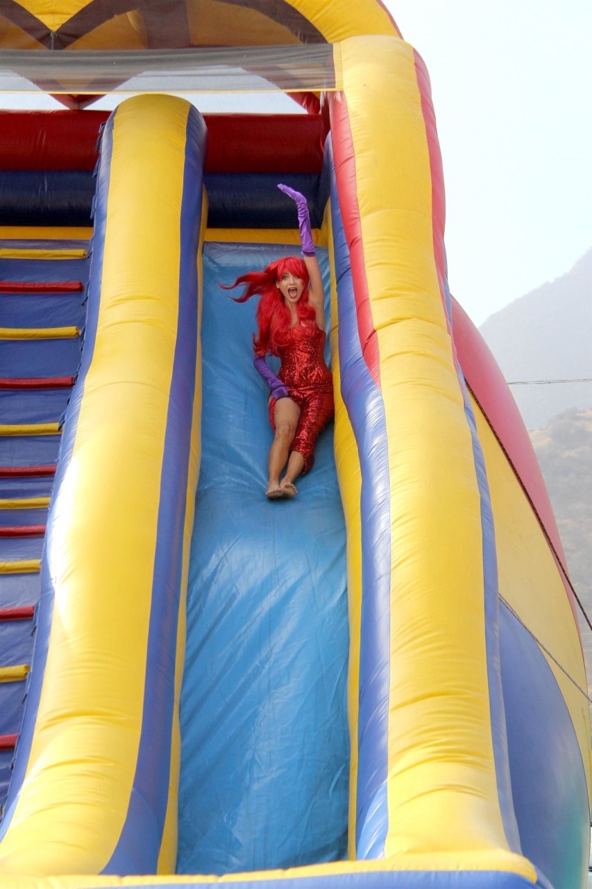 Atriz Blanca Blanco adota um visual sexy ao visitar uma plantação de abóboras em Los Angeles como Jessica Rabbit, usando um vestido longo vermelho e cabelo vermelho combinando, em 22/10/2018. Blanca passa o tempo escolhendo uma abóbora e aproveitando um momento no escorregador inflável.