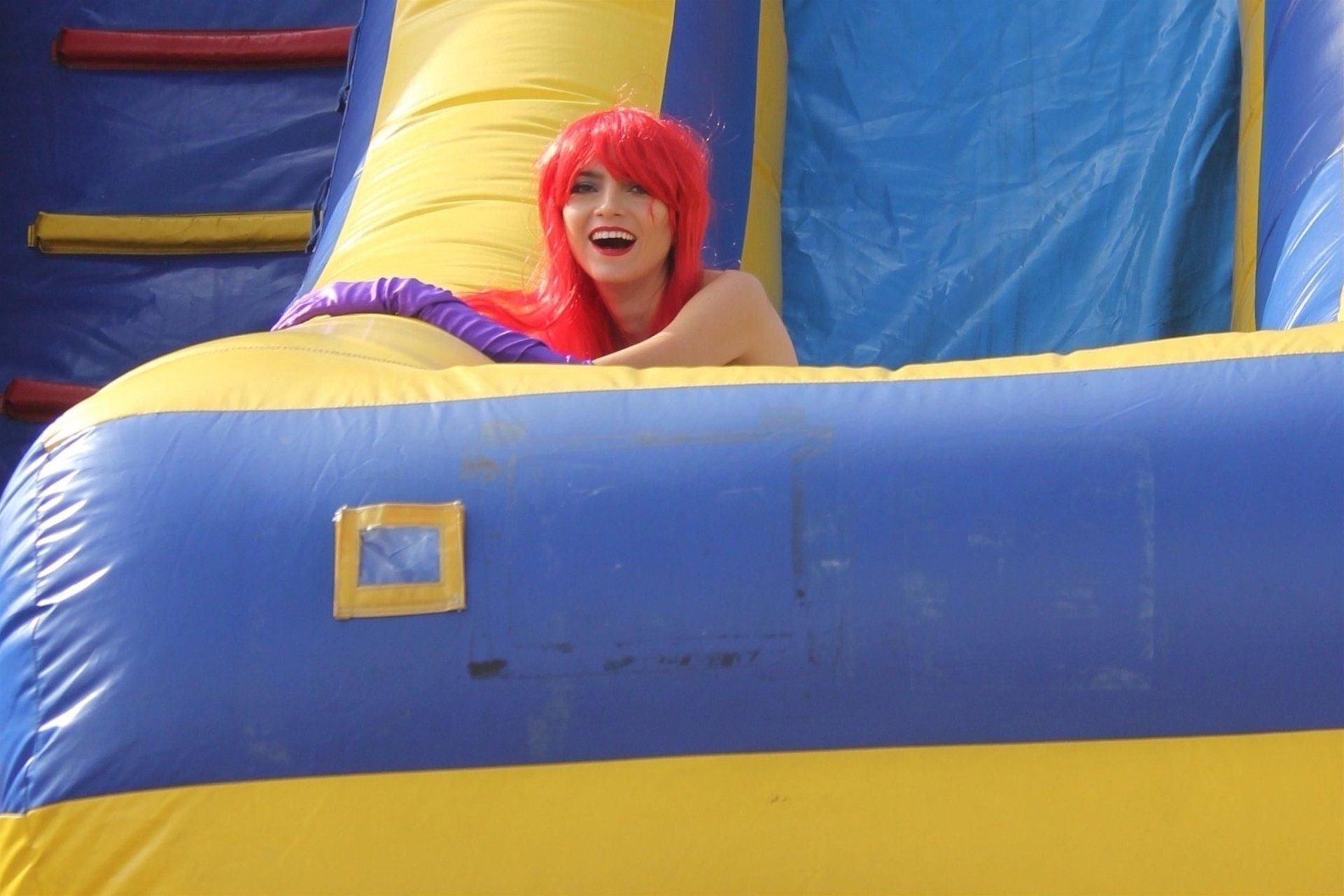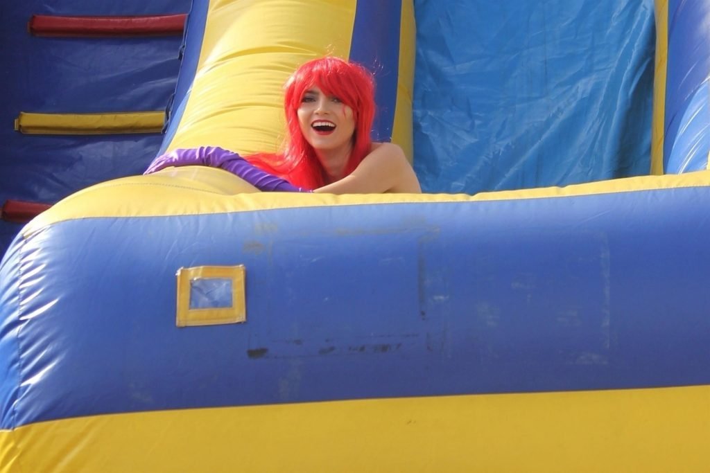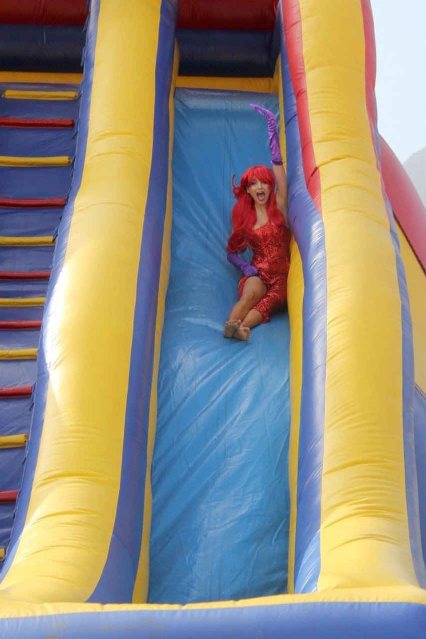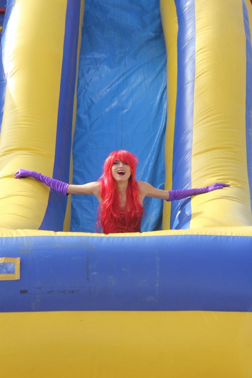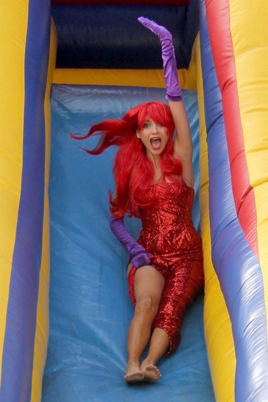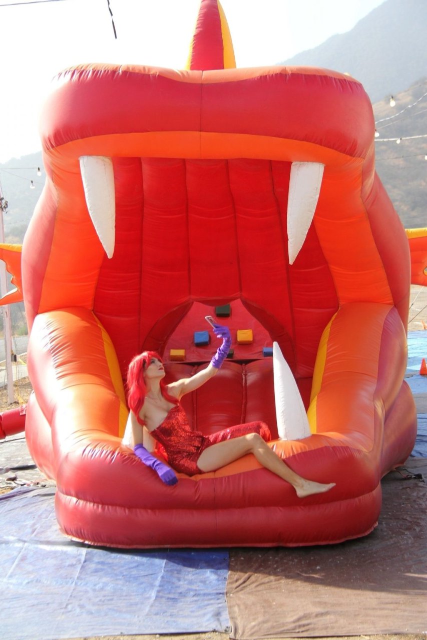 Atriz Blanca Blanco adota um visual sexy ao visitar uma plantação de abóboras em Los Angeles como Jessica Rabbit, usando um vestido longo vermelho e cabelo vermelho combinando, em 22/10/2018. Blanca passa o tempo escolhendo uma abóbora e aproveitando um momento no escorregador inflável.