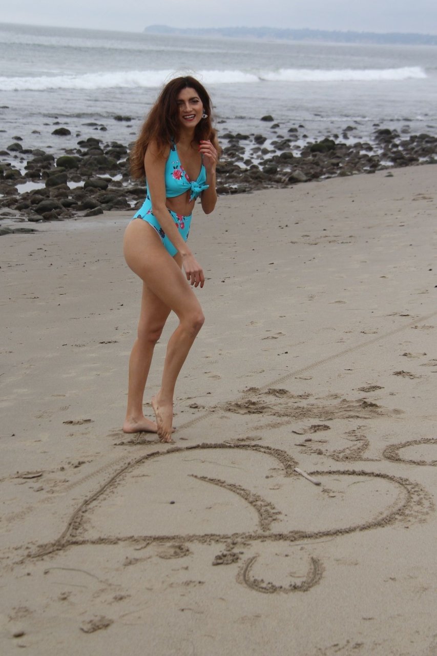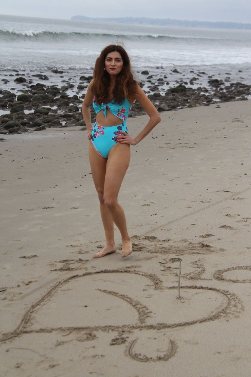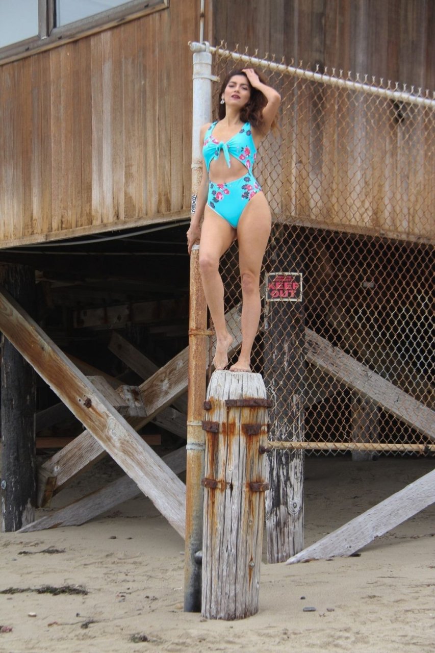 Atriz Blanca Blanco posa com um maiô azul de uma peça enquanto brinca na praia em Malibu, 29/04/2019.