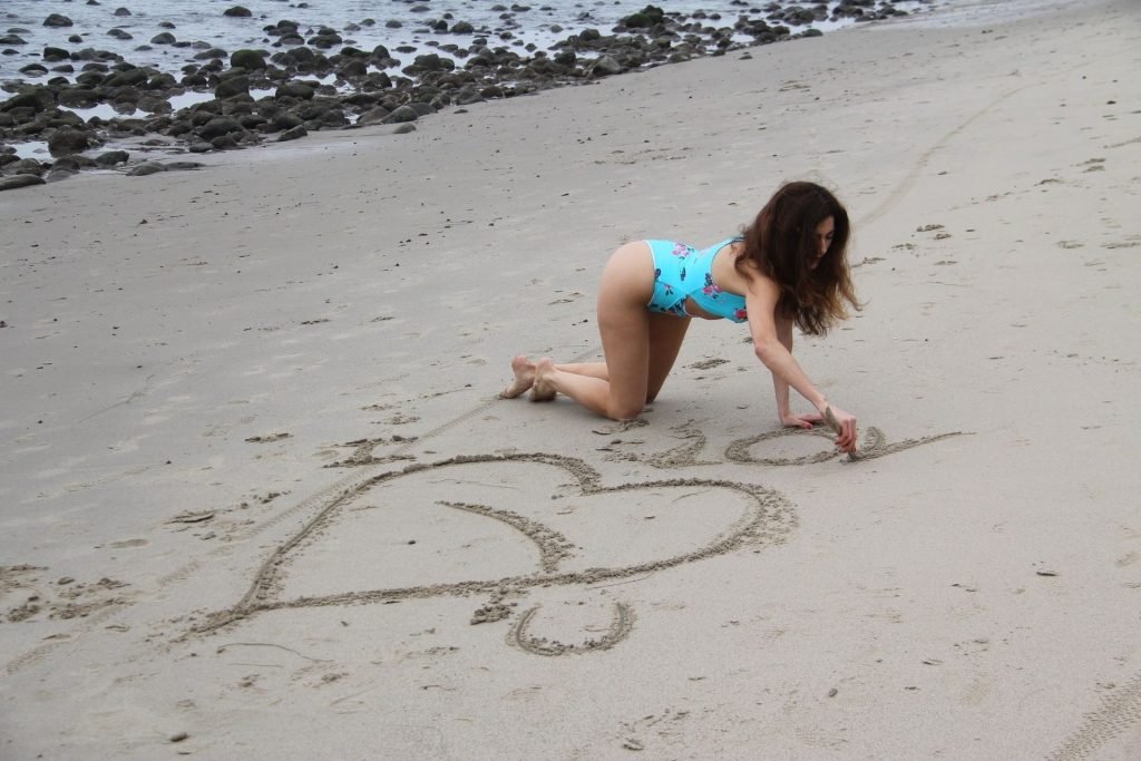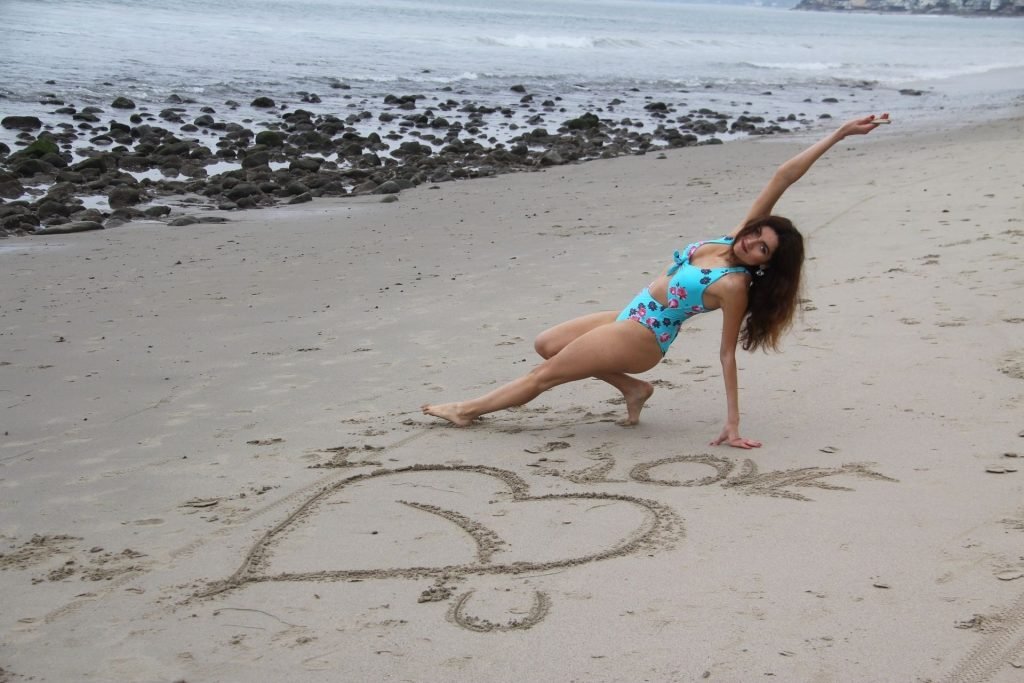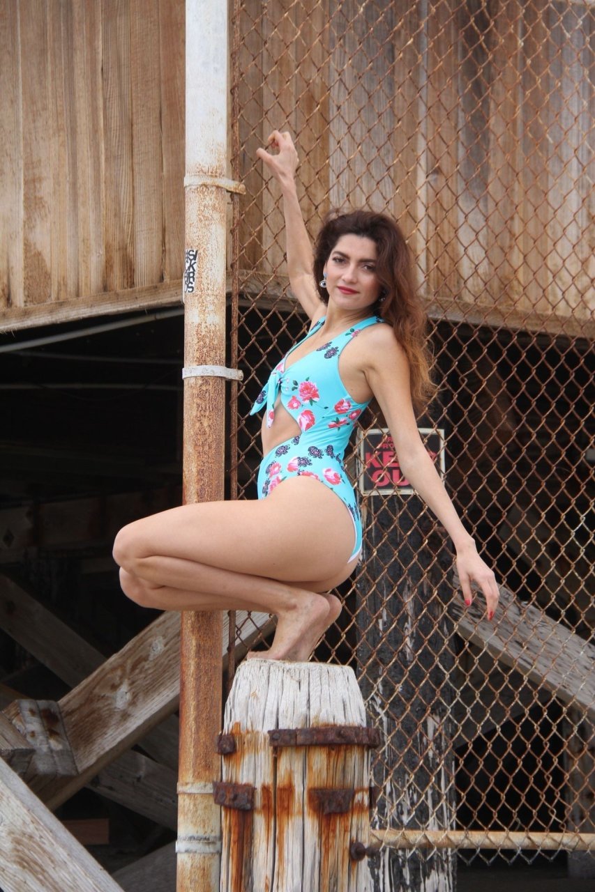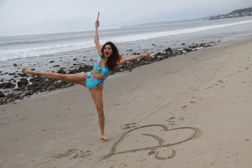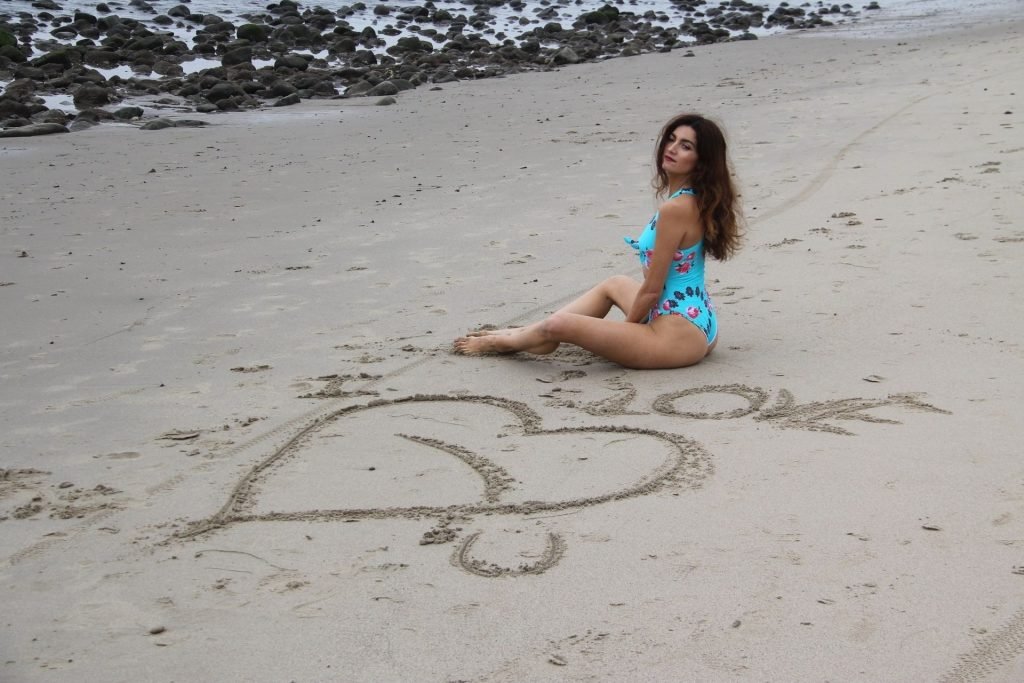 Atriz Blanca Blanco posa com um maiô azul de uma peça enquanto brinca na praia em Malibu, 29/04/2019.