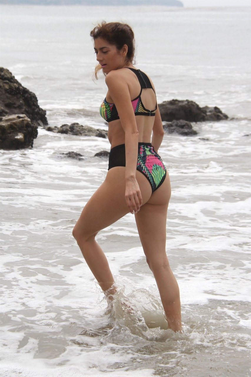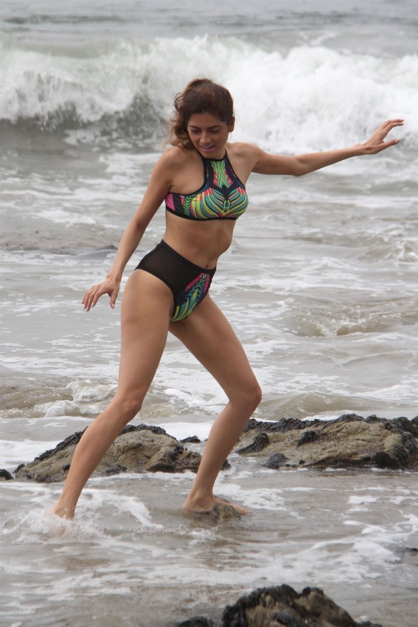 A atriz Blanca Blanco (37) foi vista brincando na praia em Malibu, 26/07/2018. Blanca foi vista usando um biquíni multicolorido enquanto curtia a praia.