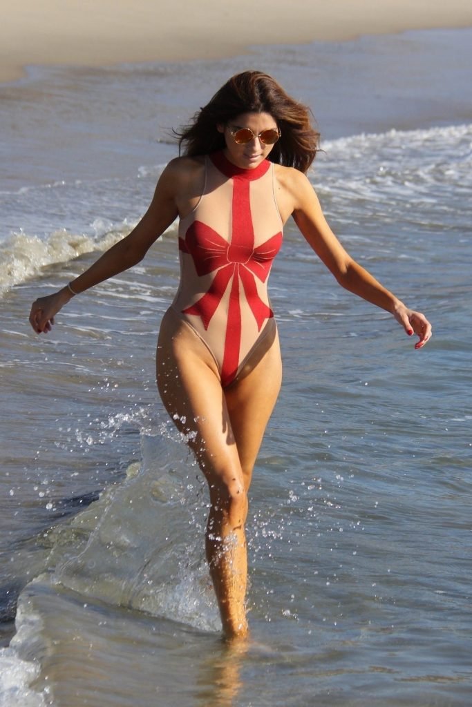 A atriz Blanca Blanco (36) entra no espírito natalino na praia de Malibu usando um maiô transparente com laço de Natal, 23/12/2017.
